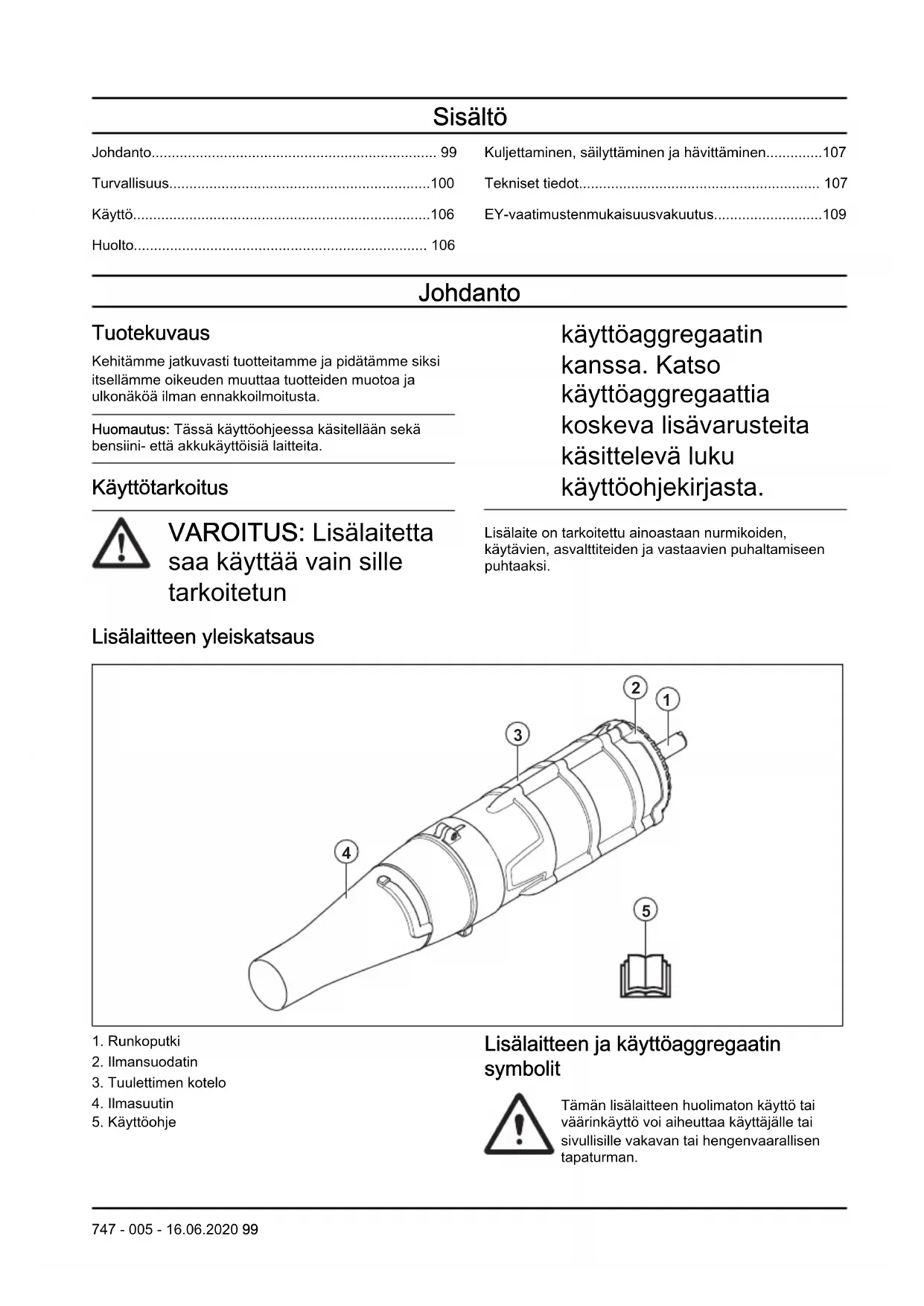 ta, että ymmärrät sen sisällön, ennen kuin alat käyttää lisälaitetta. Tämä lisälaite täyttää sovellettavien EY- direktiivien vaatimukset. Käytä hyväksyttyjä kuulo-, silmä- ja hengityssuojaimia. Käytä hyväksyttyjä suojakäsineitä. Melupäästöt ympäristöön Euroopan yhteisön direktiivin mukaisesti. Lisälaitteen päästöt ilmoitetaan luvussa Tekniset tiedot ja arvokilvessä. Lehtipuhaltimen käyttäjän on varmis- tettava, että ihmiset ja eläimet ovat vähintään 15 metrin etäisyydellä ko- neesta työn aikana. Kun useita lehti- puhaltimia käytetään samassa pai- kassa, on käyttäjien välisen turvaetäi- syyden oltava vähintään 15 metriä. Lehtipuhallin voi singota rajulla voi- malla esineitä, jotka voivat kimmota takaisin. Se voi johtaa vakaviin silmä- vammoihin, mikäli suositeltuja suojai- mia ei käytetä. Lehtipuhallin voi singota ra- julla voimalla esineitä, jotka voivat kimmota takaisin. Se voi johtaa vakaviin silmävam- moihin, mikäli suositeltuja suojaimia ei käytetä. Laitteen käyttäjän on varmis- tettava, etteivät ihmiset ja eläimet tule työn aikana 15 metriä lähemmäksi. Tuulettimen laipat osuvat sormiin tai käteen. Älä avaa äläkä irrota turvalaitteita tai - verkkoja, kun moottori on käynnissä. Huomautus: Muita lisälaitteen tunnuksia/tarroja tarvitaan tietyillä markkina-alueilla ilmaisemaan erityisiä sertifiointivaatimuksia. Turvallisuus Turvallisuusmääritelmät Varoituksia, huomioita ja huomautuksia käytetään, kun jotakin käyttöohjeen osaa halutaan erityisesti korostaa. VAROITUS: Tätä käytetään, jos käyttöohjeen noudattamatta jättämisestä voi seurata käyttäjän tai sivullisen vamma tai kuolema. HUOMAUTUS: Tätä käytetään, jos käyttöohjeen noudattamatta jättämisestä voi seurata tuotteen ja/tai lisälaitteen, muiden materiaalien tai 100 747 - 005 - 16.06.2020ympäristön vaurioituminen. Huomautus: Tätä käytetään tietyissä tilanteissa tarvittavien lisätietojen antamiseen. Yleiset turvaohjeet VAROITUS: Lue seuraavat turvaohjeet ennen lisälaitteen käyttämistä.