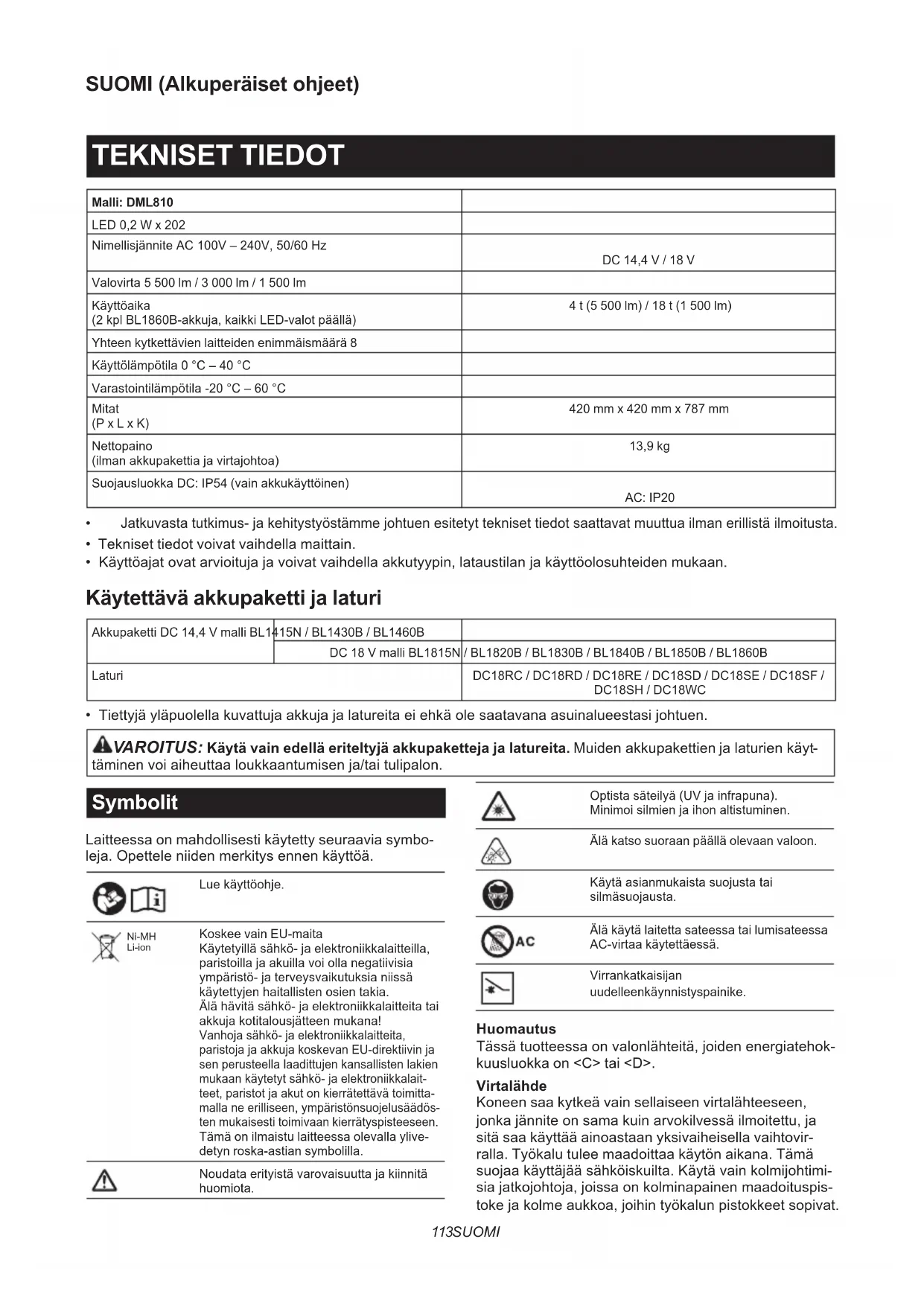 - Makita originalbatteri og lader MERK: Enkelte elementer i listen kan være inkludert som standardtilbehør i verktøypakken. Elementene kan variere fra land til land.113 SUOMI SUOMI (Alkuperäiset ohjeet) TEKNISET TIEDOT Malli: DML810 LED 0,2 W x 202 Nimellisjännite AC 100V – 240V, 50/60 Hz DC 14,4 V / 18 V Valovirta 5 500 lm / 3 000 lm / 1 500 lm Käyttöaika (2 kpl BL1860B-akkuja, kaikki LED-valot päällä) 4 t (5 500 lm) / 18 t (1 500 lm) Yhteen kytkettävien laitteiden enimmäismäärä 8 Käyttölämpötila 0 °C – 40 °C Varastointilämpötila -20 °C – 60 °C Mitat (P x L x K) 420 mm x 420 mm x 787 mm Nettopaino (ilman akkupakettia ja virtajohtoa) 13,9 kg Suojausluokka DC: IP54 (vain akkukäyttöinen) AC: IP20