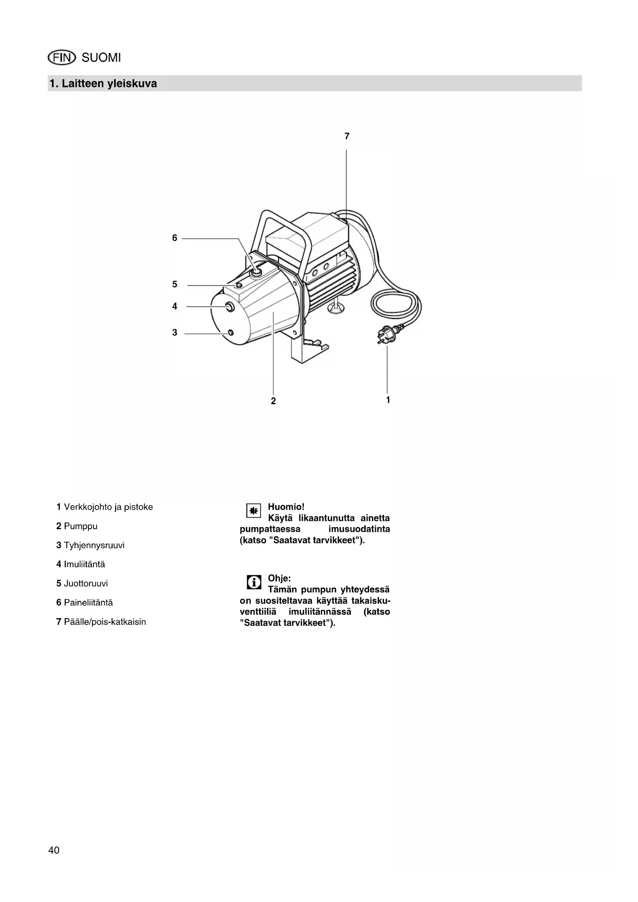 varan toimittajalle. Älä ota laitetta käyttöön. Tarkasta laite, erityisesti verkkojohto ja verkkopistoke ennen jokaista käyttöönottoa mahdollisten vaurioi- den varalta. Sähköiskusta aiheutuu hen genvaara! Vaurio itunutta laitetta saa käyttää jälleen vasta, kun se on korjattu asi- anmukaisesti. Älä ko rjaa laitetta itse! Vain ammat- tilaiset saavat korjata pumppuja ja painesäiliöitä.