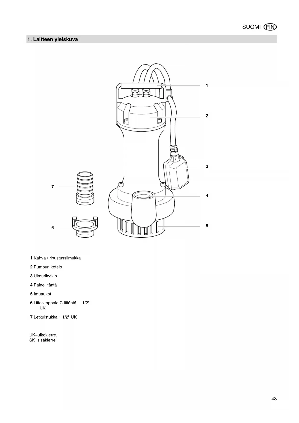 1 Kahva / ripustussilmukka 2 Pumpun kotelo 3 Uimurikytkin 4 Paineliitäntä 5 Imuaukot 6 Liitoskappale C-liitäntä, 1 1/2"