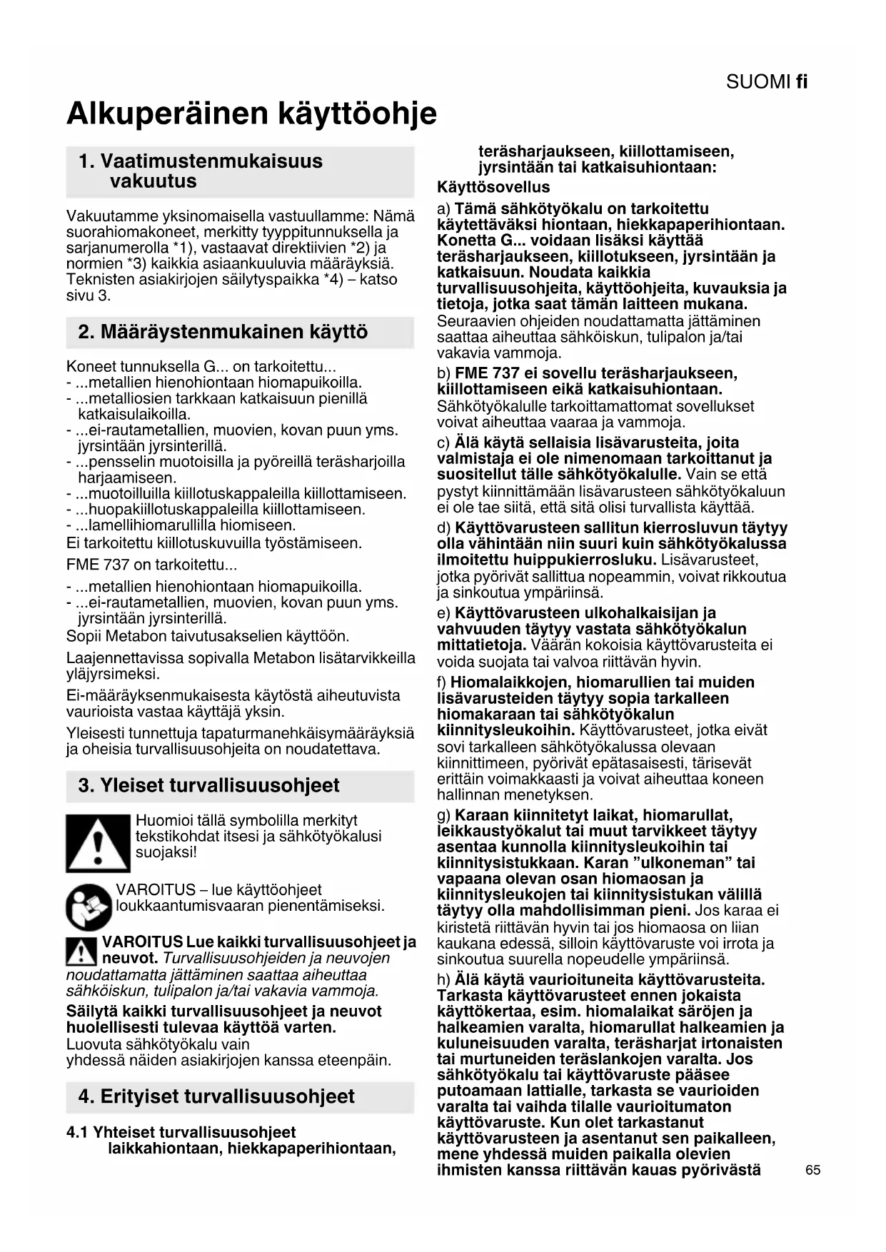 Alkuperäinen käyttöohje Vakuutamme yksinomaisella vastuullamme: Nämä suorahiomakoneet, merkitty tyyppitunnuksella ja sarjanumerolla *1), vastaavat direktiivien *2) ja normien *3) kaikkia asiaankuuluvia määräyksiä. Teknisten asiakirjojen säilytyspaikka *4) – katso sivu 3. Koneet tunnuksella G... on tarkoitettu... - ...metallien hienohiontaan hiomapuikoilla. - ...metalliosien tarkkaan katkaisuun pienillä katkaisulaikoilla. - ...ei-rautametallien, muovien, kovan puun yms. jyrsintään jyrsinterillä. - ...pensselin muotoisilla ja pyöreillä teräsharjoilla harjaamiseen. - ...muotoilluilla kiillotuskappaleilla kiillottamiseen. - ...huopakiillotuskappaleilla kiillottamiseen. - ...lamellihiomarullilla hiomiseen. Ei tarkoitettu kiillotuskuvuilla työstämiseen. FME 737 on tarkoitettu... - ...metallien hienohiontaan hiomapuikoilla. - ...ei-rautametallien, muovien, kovan puun yms. jyrsintään jyrsinterillä. Sopii Metabon taivutusakselien käyttöön. Laajennettavissa sopivalla Metabon lisätarvikkeilla yläjyrsimeksi. Ei-määräyksenmukaisesta käytöstä aiheutuvista vaurioista vastaa käyttäjä yksin. Yleisesti tunnettuja tapaturmanehkäisymääräyksiä ja oheisia turvallisuusohjeita on noudatettava. Huomioi tällä symbolilla merkityt tekstikohdat itsesi ja sähkötyökalusi suojaksi! VAROITUS – lue käyttöohjeet loukkaantumisvaaran pienentämiseksi. VAROITUS Lue kaikki turvallisuusohjeet ja neuvot. Turvallisuusohjeiden ja neuvojen noudattamatta jättäminen saattaa aiheuttaa sähköiskun, tulipalon ja/tai vakavia vammoja. Säilytä kaikki turvallisuusohjeet ja neuvot huolellisesti tulevaa käyttöä varten. Luovuta sähkötyökalu vain yhdessä näiden asiakirjojen kanssa eteenpäin.