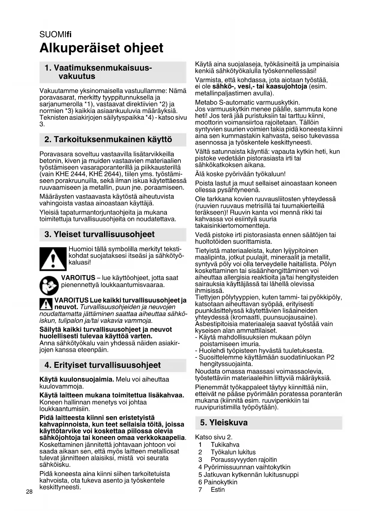 Poravasara soveltuu vastaavilla lisätarvikkeilla betonin, kiven ja muiden vastaavien materiaalien työstämiseen vasaraporanterillä ja piikkausterillä (vain KHE 2444, KHE 2644), tiilen yms. työstämi- seen porakruunuilla, sekä ilman iskua käytettäessä ruuvaamiseen ja metallin, puun jne. poraamiseen. Määräysten vastaavasta käytöstä aiheutuvista vahingoista vastaa ainoastaan käyttäjä. Yleisiä tapaturmantorjuntaohjeita ja mukana toimitettuja turvallisuusohjeita on noudatettava. Huomioi tällä symbolilla merkityt teksti- kohdat suojataksesi itseäsi ja sähkötyö- kaluasi! VAROITUS – lue käyttöohjeet, jotta saat pienennettyä loukkaantumisvaaraa. VAROITUS Lue kaikki turvallisuusohjeet ja neuvot. Turvallisuusohjeiden ja neuvojen noudattamatta jättäminen saattaa aiheuttaa sähkö- iskun, tulipalon ja/tai vakavia vammoja. Säilytä kaikki turvallisuusohjeet ja neuvot huolellisesti tulevaa käyttöä varten. Anna sähkötyökalu vain yhdessä näiden asiakir- jojen kanssa eteenpäin. Käytä kuulonsuojaimia. Melu voi aiheuttaa kuulovammoja. Käytä laitteen mukana toimitettua lisäkahvaa. Koneen hallinnan menetys voi johtaa loukkaantumisiin. Pidä laitteesta kiinni sen eristetyistä kahvapinnoista, kun teet sellaisia töitä, joissa käyttötarvike voi koskettaa piilossa olevia sähköjohtoja tai koneen omaa verkkokaapelia. Koskettaminen jännitettä johtavaan johtoon voi saada aikaan sen, että myös laitteen metalliosat tulevat jännitteen alaisiksi, mistä voi seurata sähköisku. Pidä koneesta aina kiinni siihen tarkoitetuista kahvoista, ota tukeva asento ja työskentele keskittyneesti. Käytä aina suojalaseja, työkäsineitä ja umpinaisia kenkiä sähkötyökalulla työskennellessäsi! Varmista, että kohdassa, jota aiotaan työstää, ei ole sähkö-, vesi,- tai kaasujohtoja (esim. metallinpaljastimen avulla). Metabo S-automatic varmuuskytkin. Jos varmuuskytkin menee päälle, sammuta kone heti! Jos terä jää puristuksiin tai tarttuu kiinni, moottorin voimansiirtoa rajoitetaan. Tällöin syntyvien suurien voimien takia pidä koneesta kiinni aina sen kummastakin kahvasta, seiso tukevassa asennossa ja työskentele keskittyneesti. Vältä satunnaista käyntiä: vapauta kytkin heti, kun pistoke vedetään pistorasiasta irti tai sähkökatkoksen aikana. Älä koske pyörivään työkaluun! Poista lastut ja muut sellaiset ainoastaan koneen ollessa pysähtyneenä. Ole tarkkana kovien ruuvausliitosten yhteydessä (ruuvien ruuvaus metrisillä tai tuumakierteillä teräkseen)! Ruuvin kanta voi mennä rikki tai kahvassa voi esiintyä suuria takaisinkiertomomentteja. Vedä pistoke irti pistorasiasta ennen säätöjen tai huoltotöiden suorittamista. Tietyistä materiaaleista, kuten lyijypitoinen maalipinta, jotkut puulajit, mineraalit ja metallit, syntyvä pöly voi olla terveydelle haitallista. Pölyn koskettaminen tai sisäänhengittäminen voi aiheuttaa allergisia reaktioita ja/tai hengitysteiden sairauksia käyttäjässä tai lähellä olevissa ihmisissä. Tiettyjen pölytyyppien, kuten tammi- tai pyökkipöly, katsotaan aiheuttavan syöpää, erityisesti puunkäsittelyssä käytettävien lisäaineiden yhteydessä (kromaatti, puunsuojausaine). Asbestipitoisia materiaaleja saavat työstää vain kyseisen alan ammattilaiset. - Käytä mahdollisuuksien mukaan pölyn poistamiseen imuria. - Huolehdi työpisteen hyvästä tuuletuksesta. - Suosittelemme käyttämään suodatinluokan P2 hengityssuojainta. Noudata omassa maassasi voimassaolevia, työstettäviin materiaaleihin liittyviä määräyksiä. Pienemmät työkappaleet täytyy kiinnittää niin, etteivät ne pääse pyörimään poratessa poranterän mukana (kiinnitä esim. ruuvipenkkiin tai ruuvipuristimilla työpöytään). Katso sivu 2.
