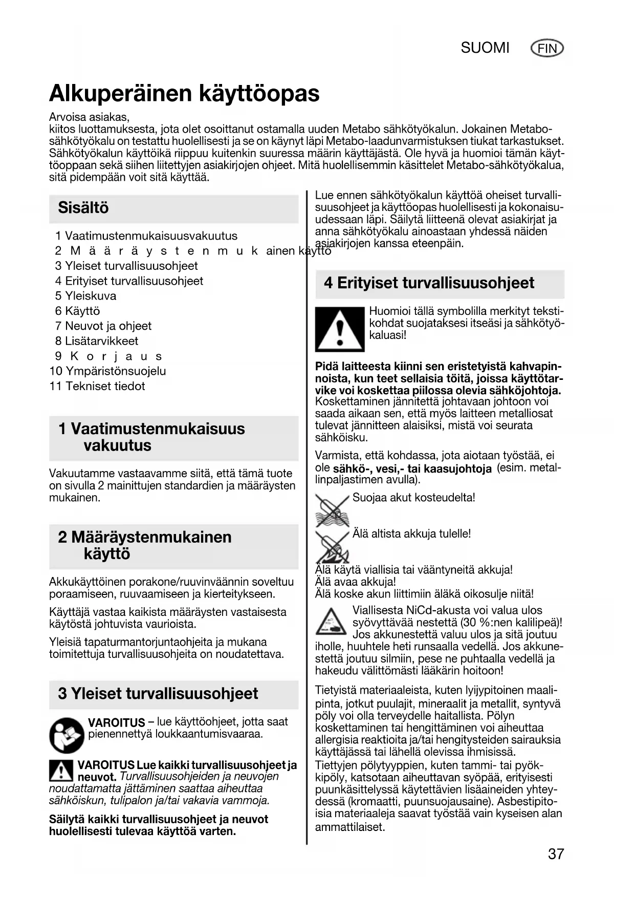 FIN 1 Vaatimustenmukaisuusvakuutus 2Määräystenmukainen käyttö 3 Yleiset turvallisuusohjeet 4 Erityiset turvallisuusohjeet 5 Yleiskuva 6 Käyttö 7 Neuvot ja ohjeet 8 Lisätarvikkeet 9Korjaus 10 Ympäristönsuojelu 11 Tekniset tiedot Vakuutamme vastaavamme siitä, että tämä tuote on sivulla 2 mainittujen standardien ja määräysten mukainen. Akkukäyttöinen porakone/ruuvinväännin soveltuu poraamiseen, ruuvaamiseen ja kierteitykseen. Käyttäjä vastaa kaikista määräysten vastaisesta käytöstä johtuvista vaurioista. Yleisiä tapaturmantorjuntaohjeita ja mukana toimitettuja turvallisuusohjeita on noudatettava. VAROITUS – lue käyttöohjeet, jotta saat pienennettyä loukkaantumisvaaraa. VAROITUS Lue kaikki turvallisuusohjeet ja neuvot. Turvallisuusohjeiden ja neuvojen noudattamatta jättäminen saattaa aiheuttaa sähköiskun, tulipalon ja/tai vakavia vammoja. Säilytä kaikki turvallisuusohjeet ja neuvot huolellisesti tulevaa käyttöä varten. Lue ennen sähkötyökalun käyttöä oheiset turvalli- suusohjeet ja käyttöopas huolellisesti ja kokonaisu- udessaan läpi. Säilytä liitteenä olevat asiakirjat ja anna sähkötyökalu ainoastaan yhdessä näiden asiakirjojen kanssa eteenpäin. Huomioi tällä symbolilla merkityt teksti- kohdat suojataksesi itseäsi ja sähkötyö- kaluasi! Pidä laitteesta kiinni sen eristetyistä kahvapin- noista, kun teet sellaisia töitä, joissa käyttötar- vike voi koskettaa piilossa olevia sähköjohtoja. Koskettaminen jännitettä johtavaan johtoon voi saada aikaan sen, että myös laitteen metalliosat tulevat jännitteen alaisiksi, mistä voi seurata sähköisku. Varmista, että kohdassa, jota aiotaan työstää, ei ole sähkö-, vesi,- tai kaasujohtoja (esim. metal- linpaljastimen avulla). Suojaa akut kosteudelta! Älä altista akkuja tulelle! Älä käytä viallisia tai vääntyneitä akkuja! Älä avaa akkuja! Älä koske akun liittimiin äläkä oikosulje niitä! Viallisesta NiCd-akusta voi valua ulos syövyttävää nestettä (30 %:nen kalilipeä)! Jos akkunestettä valuu ulos ja sitä joutuu iholle, huuhtele heti runsaalla vedellä. Jos akkune- stettä joutuu silmiin, pese ne puhtaalla vedellä ja hakeudu välittömästi lääkärin hoitoon! Tietyistä materiaaleista, kuten lyijypitoinen maali- pinta, jotkut puulajit, mineraalit ja metallit, syntyvä pöly voi olla terveydelle haitallista. Pölyn koskettaminen tai hengittäminen voi aiheuttaa allergisia reaktioita ja/tai hengitysteiden sairauksia käyttäjässä tai lähellä olevissa ihmisissä. Tiettyjen pölytyyppien, kuten tammi- tai pyök- kipöly, katsotaan aiheuttavan syöpää, erityisesti puunkäsittelyssä käytettävien lisäaineiden yhtey- dessä (kromaatti, puunsuojausaine). Asbestipito- isia materiaaleja saavat työstää vain kyseisen alan ammattilaiset. Alkuperäinen käyttöopas Arvoisa asiakas, kiitos luottamuksesta, jota olet osoittanut ostamalla uuden Metabo sähkötyökalun. Jokainen Metabo- sähkötyökalu on testattu huolellisesti ja se on käynyt läpi Metabo-laadunvarmistuksen tiukat tarkastukset. Sähkötyökalun käyttöikä riippuu kuitenkin suuressa määrin käyttäjästä. Ole hyvä ja huomioi tämän käyt- töoppaan sekä siihen liitettyjen asiakirjojen ohjeet. Mitä huolellisemmin käsittelet Metabo-sähkötyökalua, sitä pidempään voit sitä käyttää. Sisältö 1 Vaatimustenmukaisuus vakuutus 2 Määräystenmukainen käyttö 3 Yleiset turvallisuusohjeet 4 Erityiset turvallisuusohjeet 17026985_1010 BS 12 NiCd.book Seite 37 Mittwoch, 13. Oktober 2010 8:31 0838 SUOMI FIN - Käytä mahdollisuuksien mukaan pölyn poistami- seen imuria. - Huolehdi työpisteen hyvästä tuuletuksesta. - Suosittelemme käyttämään suodatinluokan P2 hengityssuojainta. Noudata omassa maassasi voimassaolevia, työstettäviin materiaaleihin liittyviä määräyksiä. Varmista työkappaleen paikallaan pysyminen esim. puristimilla. LED-valo (7): Älä katso LED-valoon suoraan opti- silla laitteilla, LED luokka 1M, luokitusnormina DIN EN 60825-1: 2003, aallonpituus: 400-780 nm; 5 lm. Ks. sivu 3 (taita esiin).