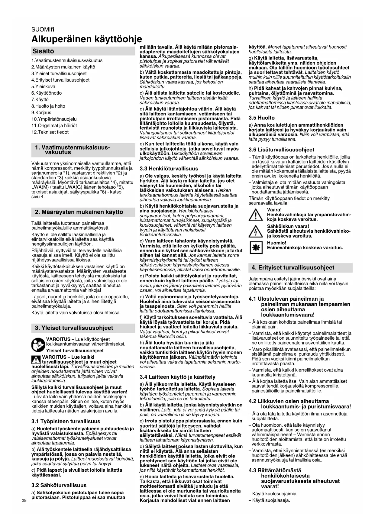 – Tämä käyttöopas on tarkoitettu henkilöille, joilla on tässä kuvatun kaltaisten laitteiden käsittelyn edellyttämät tekniset perustiedot. Jos sinulla ei ole mitään kokemusta tällaisista laitteista, pyydä ensin avuksi kokeneita henkilöitä. – Valmistaja ei ota mitään vastuuta vahingoista, jotka aiheutuvat tämän käyttöoppaan noudattamatta jättämisestä. Tämän käyttöoppaan tiedot on merkitty seuraavalla tavalla: Vaara! Henkilövahinkoja tai ympäristövahin- koja koskeva varoitus. Sähköiskun vaara! Sähköstä aiheutuvia henkilövahinko- ja koskeva varoitus. Huomio! Esinevahinkoja koskeva varoitus. Jäljempänä esitetyt jäännösriskit ovat aina olemassa paineilmalaitteissa eikä niitä voi täysin poistaa myöskään suojalaitteilla:
