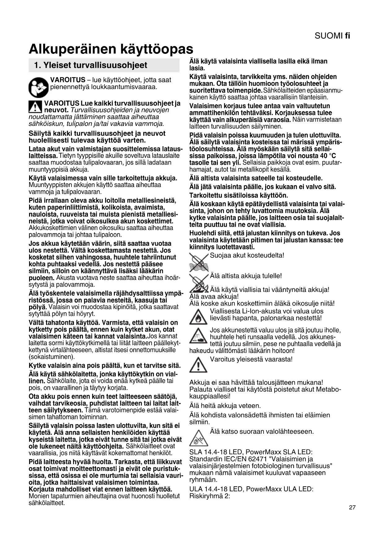 Alkuperäinen käyttöopas VAROITUS – lue käyttöohjeet, jotta saat pienennettyä loukkaantumisvaaraa. VAROITUS Lue kaikki turvallisuusohjeet ja neuvot. Turvallisuusohjeiden ja neuvojen noudattamatta jättäminen saattaa aiheuttaa sähköiskun, tulipalon ja/tai vakavia vammoja. Säilytä kaikki turvallisuusohjeet ja neuvot huolellisesti tulevaa käyttöä varten. Lataa akut vain valmistajan suosittelemissa lataus- laitteissa. Tietyn tyyppisille akuille soveltuva latauslaite saattaa muodostaa tulipalovaaran, jos sillä ladataan muuntyyppisiä akkuja. Käytä valaisimessa vain sille tarkoitettuja akkuja. Muuntyyppisten akkujen käyttö saattaa aiheuttaa vammoja ja tulipalovaaran. Pidä irrallaan oleva akku loitolla metalliesineistä, kuten paperinliittimistä, kolikoista, avaimista, nauloista, ruuveista tai muista pienistä metalliesi- neistä, jotka voivat oikosulkea akun koskettimet. Akkukoskettimien välinen oikosulku saattaa aiheuttaa palovammoja tai johtaa tulipaloon. Jos akkua käytetään väärin, siitä saattaa vuotaa ulos nestettä. Vältä koskettamasta nestettä. Jos kosketat siihen vahingossa, huuhtele tahriintunut kohta puhtaaksi vedellä. Jos nestettä pääsee silmiin, silloin on käännyttävä lisäksi lääkärin puoleen. Akusta vuotava neste saattaa aiheuttaa ihoär- sytystä ja palovammoja. Älä työskentele valaisimella räjähdysalttiissa ympä- ristössä, jossa on palavia nesteitä, kaasuja tai pölyä. Valaisin voi muodostaa kipinöitä, jotka saattavat sytyttää pölyn tai höyryt. Vältä tahatonta käyttöä. Varmista, että valaisin on kytketty pois päältä, ennen kuin kytket akun, otat valaisimen käteen tai kannat valaisinta. Jos kannat laitetta sormi käyttökytkimellä tai liität laitteen päällekyt- kettynä virtalähteeseen, altistat itsesi onnettomuuksille (sokaistuminen). Kytke valaisin aina pois päältä, kun et tarvitse sitä. Älä käytä sähkölaitetta, jonka käyttökytkin on vial- linen. Sähkölaite, jota ei voida enää kytkeä päälle tai pois, on vaarallinen ja täytyy korjata. Ota akku pois ennen kuin teet laitteeseen säätöjä, vaihdat tarvikeosia, puhdistat laitteen tai laitat lait- teen säilytykseen. Tämä varotoimenpide estää valai- simen tahattoman toiminnan. Säilytä valaisin poissa lasten ulottuvilta, kun sitä ei käytetä. Älä anna sellaisten henkilöiden käyttää kyseistä laitetta, jotka eivät tunne sitä tai jotka eivät ole lukeneet näitä käyttöohjeita. Sähkölaitteet ovat vaarallisia, jos niitä käyttävät kokemattomat henkilöt. Pidä laitteesta hyvää huolta. Tarkasta, että liikkuvat osat toimivat moitteettomasti ja eivät ole puristuk- sissa, että osissa ei ole murtumia tai sellaisia vauri- oita, jotka haittaisivat valaisimen toimintaa. Korjauta mahdolliset viat ennen laitteen käyttöä. Monien tapaturmien aiheuttajina ovat huonosti huolletut sähkölaitteet. Älä käytä valaisinta viallisella lasilla eikä ilman lasia. Käytä valaisinta, tarvikkeita yms. näiden ohjeiden mukaan. Ota tällöin huomioon työolosuhteet ja suoritettava toimenpide. Sähkölaitteiden epäasianmu- kainen käyttö saattaa johtaa vaarallisiin tilanteisiin. Valaisimen korjaus tulee antaa vain valtuutetun ammattihenkilön tehtäväksi. Korjauksessa tulee käyttää vain alkuperäisiä varaosia. Näin varmistetaan laitteen turvallisuuden säilyminen. Pidä valaisin poissa kuumuuden ja tulen ulottuvilta. Älä säilytä valaisinta kosteissa tai märissä ympäris- töolosuhteissa. Älä myöskään säilytä sitä sellai- sissa paikoissa, joissa lämpötila voi nousta 40 °C tasolle tai sen yli. Sellaisia paikkoja ovat esim. puutar- hamajat, autot tai metallikopit kesällä. Älä altista valaisinta sateelle tai kosteudelle. Älä jätä valaisinta päälle, jos kukaan ei valvo sitä. Tarkoitettu sisätiloissa käyttöön. Älä koskaan käytä epätäydellistä valaisinta tai valai- sinta, johon on tehty luvattomia muutoksia. Älä kytke valaisinta päälle, jos laitteen osia tai suojalait- teita puuttuu tai ne ovat viallisia. Huolehdi siitä, että jalustan kiinnitys on tukeva. Jos valaisinta käytetään pitimen tai jalustan kanssa: tee kiinnitys luotettavasti. Suojaa akut kosteudelta! Älä altista akkuja tulelle! Älä käytä viallisia tai vääntyneitä akkuja! Älä avaa akkuja! Älä koske akun koskettimiin äläkä oikosulje niitä! Viallisesta Li-Ion-akusta voi valua ulos lievästi hapanta, palonarkaa nestettä! Jos akkunestettä valuu ulos ja sitä joutuu iholle, huuhtele heti runsaalla vedellä. Jos akkunes- tettä joutuu silmiin, pese ne puhtaalla vedellä ja hakeudu välittömästi lääkärin hoitoon! Varoitus yleisestä vaarasta! Akkuja ei saa hävittää talousjätteen mukana! Palauta vialliset tai käytöstä poistetut akut Metabo- kauppiaallesi! Älä heitä akkuja veteen. Älä kohdista valonsädettä ihmisten tai eläimien silmiin. Älä katso suoraan valolähteeseen. SLA 14.4-18 LED, PowerMaxx SLA LED: Standardin IEC/EN 62471 "Valaisimien ja valaisinjärjestelmien fotobiologinen turvallisuus" mukaan nämä valaisimet kuuluvat vapaaseen ryhmään. ULA 14.4-18 LED, PowerMaxx ULA LED: Riskiryhmä 2: