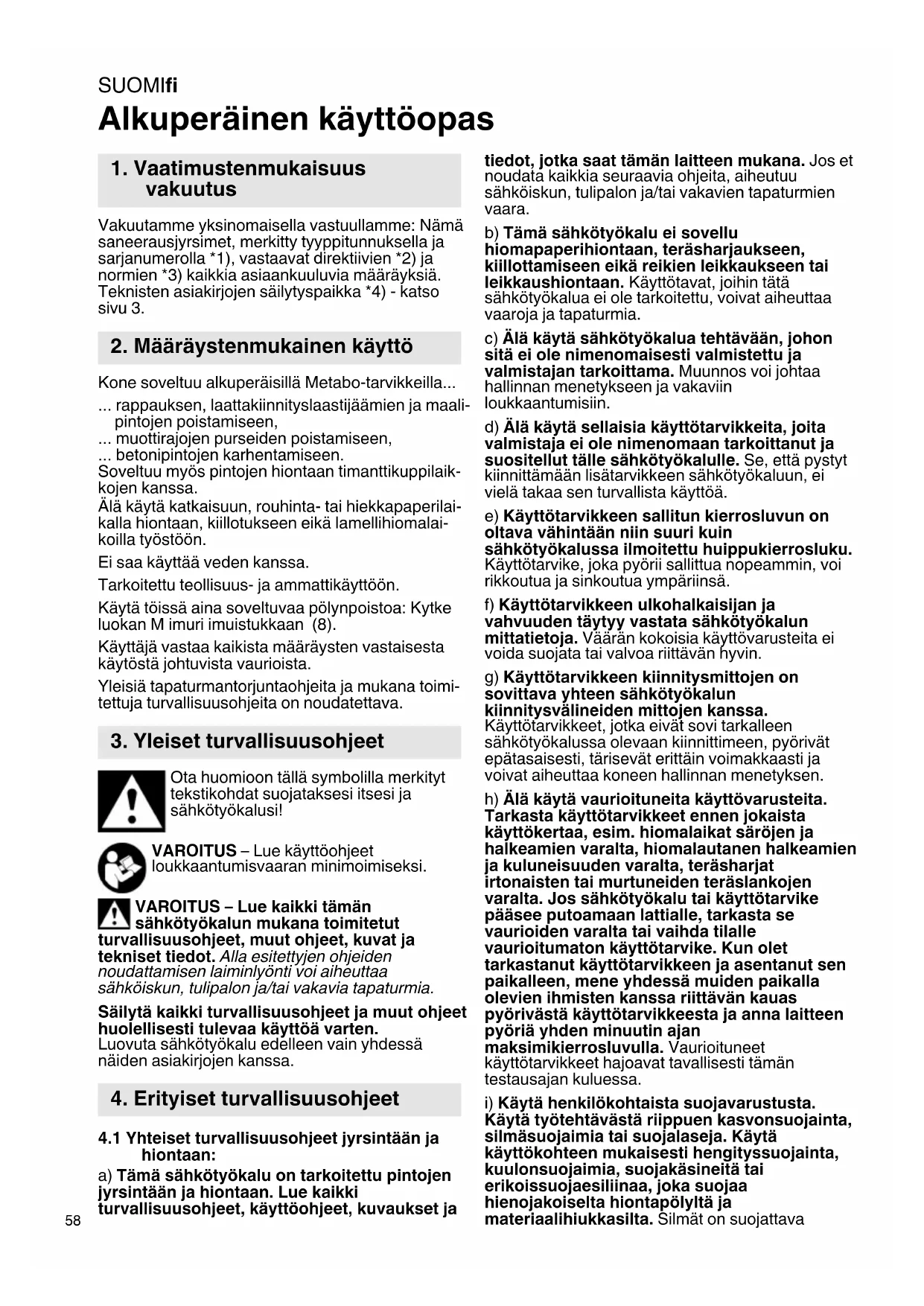 Alkuperäinen käyttöopas Vakuutamme yksinomaisella vastuullamme: Nämä saneerausjyrsimet, merkitty tyyppitunnuksella ja sarjanumerolla *1), vastaavat direktiivien *2) ja normien *3) kaikkia asiaankuuluvia määräyksiä. Teknisten asiakirjojen säilytyspaikka *4) - katso sivu 3. Kone soveltuu alkuperäisillä Metabo-tarvikkeilla... ... rappauksen, laattakiinnityslaastijäämien ja maali- pintojen poistamiseen, ... muottirajojen purseiden poistamiseen, ... betonipintojen karhentamiseen. Soveltuu myös pintojen hiontaan timanttikuppilaik- kojen kanssa. Älä käytä katkaisuun, rouhinta- tai hiekkapaperilai- kalla hiontaan, kiillotukseen eikä lamellihiomalai- koilla työstöön. Ei saa käyttää veden kanssa. Tarkoitettu teollisuus- ja ammattikäyttöön. Käytä töissä aina soveltuvaa pölynpoistoa: Kytke luokan M imuri imuistukkaan (8). Käyttäjä vastaa kaikista määräysten vastaisesta käytöstä johtuvista vaurioista. Yleisiä tapaturmantorjuntaohjeita ja mukana toimi- tettuja turvallisuusohjeita on noudatettava. Ota huomioon tällä symbolilla merkityt tekstikohdat suojataksesi itsesi ja sähkötyökalusi! VAROITUS – Lue käyttöohjeet loukkaantumisvaaran minimoimiseksi. VAROITUS – Lue kaikki tämän sähkötyökalun mukana toimitetut turvallisuusohjeet, muut ohjeet, kuvat ja tekniset tiedot. Alla esitettyjen ohjeiden noudattamisen laiminlyönti voi aiheuttaa sähköiskun, tulipalon ja/tai vakavia tapaturmia. Säilytä kaikki turvallisuusohjeet ja muut ohjeet huolellisesti tulevaa käyttöä varten. Luovuta sähkötyökalu edelleen vain yhdessä näiden asiakirjojen kanssa.