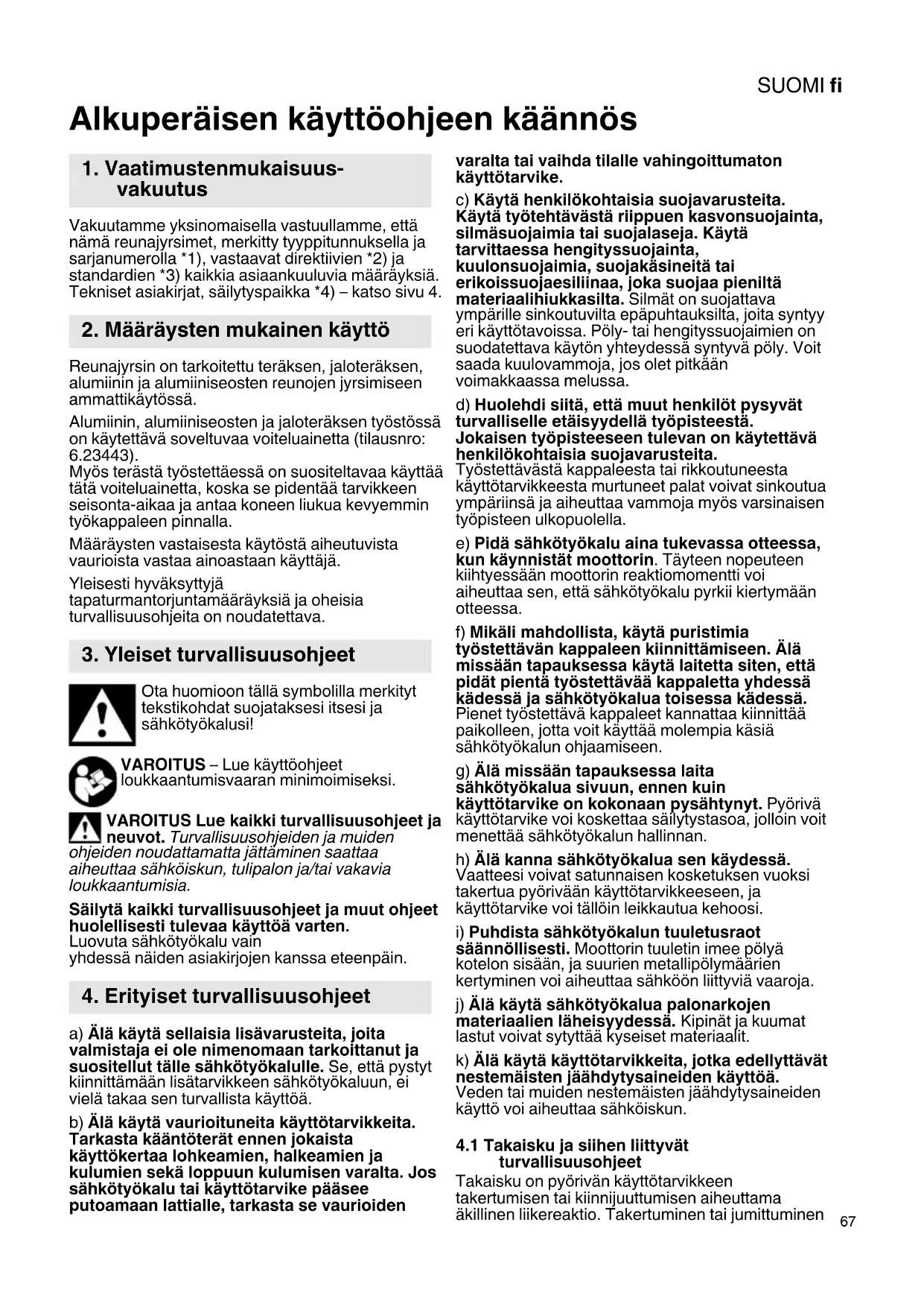 Alkuperäisen käyttöohjeen käännös Vakuutamme yksinomaisella vastuullamme, että nämä reunajyrsimet, merkitty tyyppitunnuksella ja sarjanumerolla *1), vastaavat direktiivien *2) ja standardien *3) kaikkia asiaankuuluvia määräyksiä. Tekniset asiakirjat, säilytyspaikka *4) – katso sivu 4. Reunajyrsin on tarkoitettu teräksen, jaloteräksen, alumiinin ja alumiiniseosten reunojen jyrsimiseen ammattikäytössä. Alumiinin, alumiiniseosten ja jaloteräksen työstössä on käytettävä soveltuvaa voiteluainetta (tilausnro: 6.23443). Myös terästä työstettäessä on suositeltavaa käyttää tätä voiteluainetta, koska se pidentää tarvikkeen seisonta-aikaa ja antaa koneen liukua kevyemmin työkappaleen pinnalla. Määräysten vastaisesta käytöstä aiheutuvista vaurioista vastaa ainoastaan käyttäjä. Yleisesti hyväksyttyjä tapaturmantorjuntamääräyksiä ja oheisia turvallisuusohjeita on noudatettava. Ota huomioon tällä symbolilla merkityt tekstikohdat suojataksesi itsesi ja sähkötyökalusi! VAROITUS – Lue käyttöohjeet loukkaantumisvaaran minimoimiseksi. VAROITUS Lue kaikki turvallisuusohjeet ja neuvot. Turvallisuusohjeiden ja muiden ohjeiden noudattamatta jättäminen saattaa aiheuttaa sähköiskun, tulipalon ja/tai vakavia loukkaantumisia. Säilytä kaikki turvallisuusohjeet ja muut ohjeet huolellisesti tulevaa käyttöä varten. Luovuta sähkötyökalu vain yhdessä näiden asiakirjojen kanssa eteenpäin. a) Älä käytä sellaisia lisävarusteita, joita valmistaja ei ole nimenomaan tarkoittanut ja suositellut tälle sähkötyökalulle. Se, että pystyt kiinnittämään lisätarvikkeen sähkötyökaluun, ei vielä takaa sen turvallista käyttöä. b) Älä käytä vaurioituneita käyttötarvikkeita. Tarkasta kääntöterät ennen jokaista käyttökertaa lohkeamien, halkeamien ja kulumien sekä loppuun kulumisen varalta. Jos sähkötyökalu tai käyttötarvike pääsee putoamaan lattialle, tarkasta se vaurioiden varalta tai vaihda tilalle vahingoittumaton käyttötarvike. c) Käytä henkilökohtaisia suojavarusteita. Käytä työtehtävästä riippuen kasvonsuojainta, silmäsuojaimia tai suojalaseja. Käytä tarvittaessa hengityssuojainta, kuulonsuojaimia, suojakäsineitä tai erikoissuojaesiliinaa, joka suojaa pieniltä materiaalihiukkasilta. Silmät on suojattava ympärille sinkoutuvilta epäpuhtauksilta, joita syntyy eri käyttötavoissa. Pöly- tai hengityssuojaimien on suodatettava käytön yhteydessä syntyvä pöly. Voit saada kuulovammoja, jos olet pitkään voimakkaassa melussa. d) Huolehdi siitä, että muut henkilöt pysyvät turvalliselle etäisyydellä työpisteestä. Jokaisen työpisteeseen tulevan on käytettävä henkilökohtaisia suojavarusteita. Työstettävästä kappaleesta tai rikkoutuneesta käyttötarvikkeesta murtuneet palat voivat sinkoutua ympäriinsä ja aiheuttaa vammoja myös varsinaisen työpisteen ulkopuolella. e) Pidä sähkötyökalu aina tukevassa otteessa, kun käynnistät moottorin. Täyteen nopeuteen kiihtyessään moottorin reaktiomomentti voi aiheuttaa sen, että sähkötyökalu pyrkii kiertymään otteessa. f) Mikäli mahdollista, käytä puristimia työstettävän kappaleen kiinnittämiseen. Älä missään tapauksessa käytä laitetta siten, että pidät pientä työstettävää kappaletta yhdessä kädessä ja sähkötyökalua toisessa kädessä. Pienet työstettävä kappaleet kannattaa kiinnittää paikolleen, jotta voit käyttää molempia käsiä sähkötyökalun ohjaamiseen. g) Älä missään tapauksessa laita sähkötyökalua sivuun, ennen kuin käyttötarvike on kokonaan pysähtynyt. Pyörivä käyttötarvike voi koskettaa säilytystasoa, jolloin voit menettää sähkötyökalun hallinnan. h) Älä kanna sähkötyökalua sen käydessä. Vaatteesi voivat satunnaisen kosketuksen vuoksi takertua pyörivään käyttötarvikkeeseen, ja käyttötarvike voi tällöin leikkautua kehoosi.
