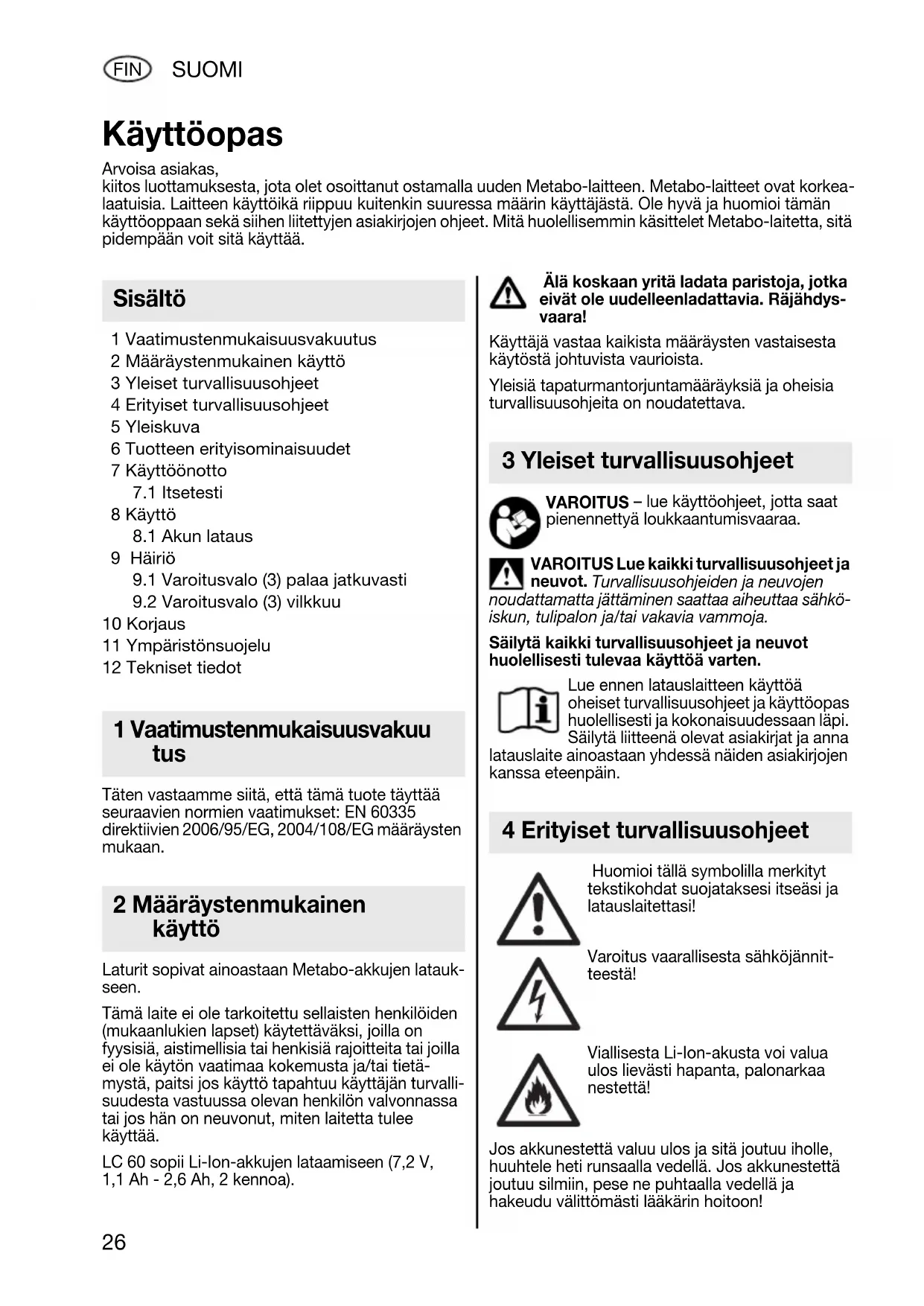 10 Korjaus 11 Ympäristönsuojelu 12 Tekniset tiedot Täten vastaamme siitä, että tämä tuote täyttää seuraavien normien vaatimukset: EN 60335 direktiivien 2006/95/EG, 2004/108/EG määräysten mukaan. Laturit sopivat ainoastaan Metabo-akkujen latauk- seen. Tämä laite ei ole tarkoitettu sellaisten henkilöiden (mukaanlukien lapset) käytettäväksi, joilla on fyysisiä, aistimellisia tai henkisiä rajoitteita tai joilla ei ole käytön vaatimaa kokemusta ja/tai tietä- mystä, paitsi jos käyttö tapahtuu käyttäjän turvalli- suudesta vastuussa olevan henkilön valvonnassa tai jos hän on neuvonut, miten laitetta tulee käyttää. LC 60 sopii Li-Ion-akkujen lataamiseen (7,2 V, 1,1 Ah - 2,6 Ah, 2 kennoa). Älä koskaan yritä ladata paristoja, jotka eivät ole uudelleenladattavia. Räjähdys- vaara! Käyttäjä vastaa kaikista määräysten vastaisesta käytöstä johtuvista vaurioista. Yleisiä tapaturmantorjuntamääräyksiä ja oheisia turvallisuusohjeita on noudatettava. VAROITUS – lue käyttöohjeet, jotta saat pienennettyä loukkaantumisvaaraa. VAROITUS Lue kaikki turvallisuusohjeet ja neuvot. Turvallisuusohjeiden ja neuvojen noudattamatta jättäminen saattaa aiheuttaa sähkö- iskun, tulipalon ja/tai vakavia vammoja. Säilytä kaikki turvallisuusohjeet ja neuvot huolellisesti tulevaa käyttöä varten. Lue ennen latauslaitteen käyttöä oheiset turvallisuusohjeet ja käyttöopas huolellisesti ja kokonaisuudessaan läpi. Säilytä liitteenä olevat asiakirjat ja anna latauslaite ainoastaan yhdessä näiden asiakirjojen kanssa eteenpäin. Huomioi tällä symbolilla merkityt tekstikohdat suojataksesi itseäsi ja latauslaitettasi! Varoitus vaarallisesta sähköjännit- teestä! Viallisesta Li-Ion-akusta voi valua ulos lievästi hapanta, palonarkaa nestettä! Jos akkunestettä valuu ulos ja sitä joutuu iholle, huuhtele heti runsaalla vedellä. Jos akkunestettä joutuu silmiin, pese ne puhtaalla vedellä ja hakeudu välittömästi lääkärin hoitoon! Käyttöopas Arvoisa asiakas, kiitos luottamuksesta, jota olet osoittanut ostamalla uuden Metabo-laitteen. Metabo-laitteet ovat korkea- laatuisia. Laitteen käyttöikä riippuu kuitenkin suuressa määrin käyttäjästä. Ole hyvä ja huomioi tämän käyttöoppaan sekä siihen liitettyjen asiakirjojen ohjeet. Mitä huolellisemmin käsittelet Metabo-laitetta, sitä pidempään voit sitä käyttää. Sisältö 1 Vaatimustenmukaisuusvakuu tus 2 Määräystenmukainen käyttö 3 Yleiset turvallisuusohjeet 4 Erityiset turvallisuusohjeetSUOMI