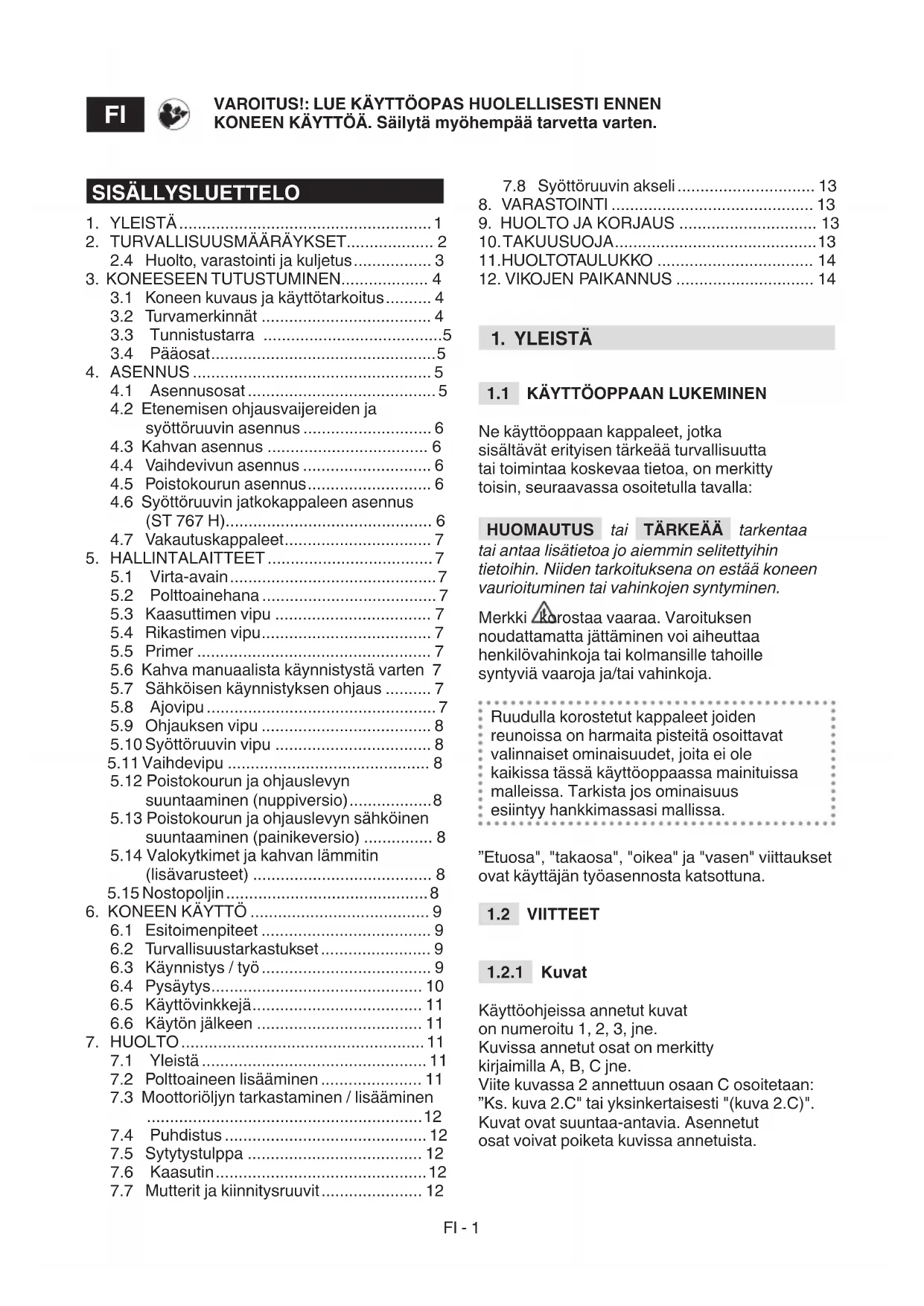 Käyttöohjeissa annetut kuvat on numeroitu 1, 2, 3, jne. Kuvissa annetut osat on merkitty kirjaimilla A, B, C jne. Viite kuvassa 2 annettuun osaan C osoitetaan: ”Ks. kuva 2.C" tai yksinkertaisesti "(kuva 2.C)". Kuvat ovat suuntaa-antavia. Asennetut osat voivat poiketa kuvissa annetuista. VAROITUS!: LUE KÄYTTÖOPAS HUOLELLISESTI ENNEN KONEEN KÄYTTÖÄ. Säilytä myöhempää tarvetta varten.
