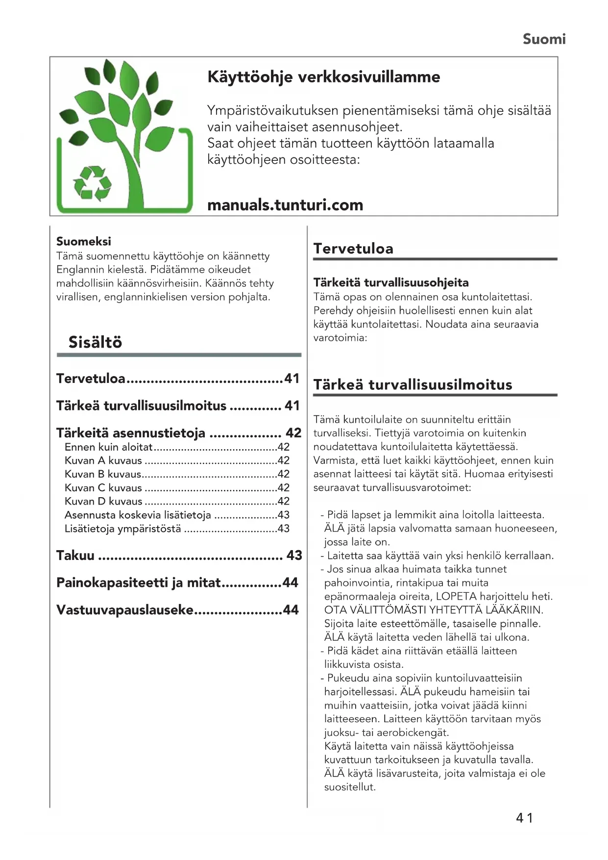 - Se till att alla vridbara komponenter kan röra sig fritt. Dra inte åt alla skruvar och muttrar i detta steg. VIKTIG Eftersom din träningsmaskin kommer/kan ställa in de första timmarna rekommenderar vi att du gör en snabb kontroll av hårdvaran du monterat under hopsättningen. Vi föreslår att du drar åt alla skruvar och muttrar igen efter de första träningspassen (ungefär 10 timmar). För att säkerställa att skruvarna och muttrarna fortfarande är väl åtdragna för bästa möjliga prestanda hos din träningsmaskin. ‼ ANMÄRKNING Vi rekommenderar att du kontrollerar hårdvaran regelbundet, minst en gång var tredje månad. Ytterligare miljö- information Bortskaffande av förpackning Riktlinjer från myndigheter uppmanar att vi minskar mängden avfall som placeras i deponier. Vi ber dig därför att borstskaffa allt förpackningsavfall på ett ansvarsfullt sätt på allmänna återvinningscentraler. Bortskaffande av uttjänt redskap Vi på Tunturi hoppas att du får många års trevlig användning av ditt träningsredskap. Men det kommer en tid när ditt träningsredskap är uttjänt. Enligt den europeiska WEEE-lagstiftningen, ansvarar du för korrekt bortskaffande av ditt träningsredskap på en allmän återvinningsanläggning. Garanti Tunturis ágargarantitunt Garantivillkor Konsumenten har rätt till tillämpliga lagliga rättigheter som anges i den nationella lagstiftningen om handel med konsumentvaror. Denna garanti begränsar inte dessa rättigheter. Köparens garanti är endast giltig om produkten används i en miljö som är godkänd av Tunturi New Fitness BV och underhålls enligt instruktionerna för den specifika utrustningen. Den produktspecifika godkända miljön och underhållsinstruktionerna anges i produktens ”användarhandbok”. ”Användarhandboken” kan laddas ned från vår webbplats. http://manuals.tunturi.com Viktkapacitet och dimension (Fig W#1) - Maximal lastvikt : 135 kg. - Mått monterad: 120x 104x 215 cm. 120 cm104 cm 215 cm40 Svenska Friskrivning © 2025 Tunturi New Fitness BV Alla rättigheter förbehålles. - Produkten och handboken kan komma att ändras. - Specifikationer kan ändras utan förvarning. - På vår webbplats finns den senaste bruksanvisningen.41 Suomi Suomeksi Tämä suomennettu käyttöohje on käännetty Englannin kielestä. Pidätämme oikeudet mahdollisiin käännösvirheisiin. Käännös tehty virallisen, englanninkielisen version pohjalta. Sisältö Käyttöohje verkkosivuillamme Ympäristövaikutuksen pienentämiseksi tämä ohje sisältää vain vaiheittaiset asennusohjeet. Saat ohjeet tämän tuotteen käyttöön lataamalla käyttöohjeen osoitteesta: manuals.tunturi.com Tervetuloa Tärkeitä turvallisuusohjeita Tämä opas on olennainen osa kuntolaitettasi. Perehdy ohjeisiin huolellisesti ennen kuin alat käyttää kuntolaitettasi. Noudata aina seuraavia varotoimia: Tärkeä turvallisuusilmoitus Tämä kuntoilulaite on suunniteltu erittäin turvalliseksi. Tiettyjä varotoimia on kuitenkin noudatettava kuntoilulaitetta käytettäessä. Varmista, että luet kaikki käyttöohjeet, ennen kuin asennat laitteesi tai käytät sitä. Huomaa erityisesti seuraavat turvallisuusvarotoimet: - Pidä lapset ja lemmikit aina loitolla laitteesta. ÄLÄ jätä lapsia valvomatta samaan huoneeseen, jossa laite on. - Laitetta saa käyttää vain yksi henkilö kerrallaan. - Jos sinua alkaa huimata taikka tunnet pahoinvointia, rintakipua tai muita epänormaaleja oireita, LOPETA harjoittelu heti. OTA VÄLITTÖMÄSTI YHTEYTTÄ LÄÄKÄRIIN. Sijoita laite esteettömälle, tasaiselle pinnalle. ÄLÄ käytä laitetta veden lähellä tai ulkona. - Pidä kädet aina riittävän etäällä laitteen liikkuvista osista. - Pukeudu aina sopiviin kuntoiluvaatteisiin harjoitellessasi. ÄLÄ pukeudu hameisiin tai muihin vaatteisiin, jotka voivat jäädä kiinni laitteeseen. Laitteen käyttöön tarvitaan myös juoksu- tai aerobickengät. Käytä laitetta vain näissä käyttöohjeissa kuvattuun tarkoitukseen ja kuvatulla tavalla. ÄLÄ käytä lisävarusteita, joita valmistaja ei ole suositellut. Tervetuloa 41 Tärkeä turvallisuusilmoitus 41 Tärkeitä asennustietoja 42 Ennen kuin aloitat 42 Kuvan A kuvaus 42 Kuvan B kuvaus 42 Kuvan C kuvaus 42 Kuvan D kuvaus 42 Asennusta koskevia lisätietoja 43 Lisätietoja ympäristöstä 43 Takuu 43 Painokapasiteetti ja mitat 44 Vastuuvapauslauseke 4442 Suomi - Älä aseta teräviä esineitä laitteen ympärille. - Vammaiset eivät saa käyttää laitetta. - Lämmittele aina hyvin ennen kuntoilulaitteen käyttöä tekemällä venyttelyharjoituksia. - Älä koskaan käytä laitetta, jos se ei toimi oikein. - Harjoittelun aikana suositellaan käytettävän varmistajaa. - Tämä laite on suunniteltu ja tarkoitettu vain kotitalous- ja kuluttajakäyttöön, ei kaupalliseen käyttöön. Varoitus: Kysy lääkäriltäsi neuvoja ennen minkään kuntoiluohjelman aloittamista. Tämä on erityisen tärkeää yli 35-vuotiailla tai henkilöillä, joilla on ennestään terveysongelmia. Lue kaikki ohjeet ennen minkään kuntolaitteen käyttöä. Tunturi New fitness bv. ei ota mitään vastuuta henkilö- tai omaisuusvahingoista, jotka aiheutuvat tämän laitteen käytöstä tai tämän laitteen käytön kautta. Säilytä nämä ohjeet! Tärkeitä asennustietoja Ennen kuin aloitat Suosittelemme käyttämään kahta säädettävää jakoavainta tuotteen kokoamiseen. Jos sinulla on oikean kokoisia metrijärjestelmän avaimia, se sopii myös. ‼ HUOMAUTUS