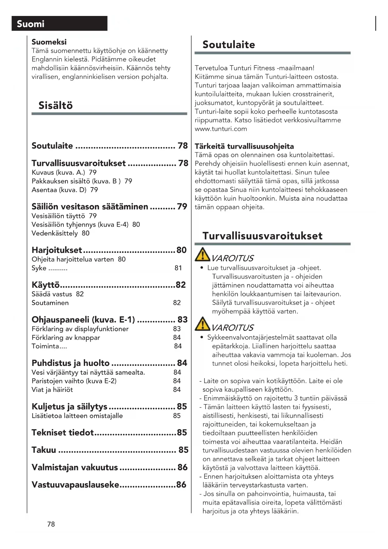 - Sykkeenvalvontajärjestelmät saattavat olla epätarkkoja. Liiallinen harjoittelu saattaa aiheuttaa vakavia vammoja tai kuoleman. Jos tunnet olosi heikoksi, lopeta harjoittelu heti. - Laite on sopiva vain kotikäyttöön. Laite ei ole sopiva kaupalliseen käyttöön. - Enimmäiskäyttö on rajoitettu 3 tuntiin päivässä - Tämän laitteen käyttö lasten tai fyysisesti, aistillisesti, henkisesti, tai liikunnallisesti rajoittuneiden, tai kokemukseltaan ja tiedoiltaan puutteellisten henkilöiden toimesta voi aiheuttaa vaaratilanteita. Heidän turvallisuudestaan vastuussa olevien henkilöiden on annettava selkeät ja tarkat ohjeet laitteen käytöstä ja valvottava laitteen käyttöä. - Ennen harjoituksen aloittamista ota yhteys lääkäriin terveystarkastusta varten. - Jos sinulla on pahoinvointia, huimausta, tai muita epätavallisia oireita, lopeta välittömästi harjoitus ja ota yhteys lääkäriin. Suomeksi Tämä suomennettu käyttöohje on käännetty Englannin kielestä. Pidätämme oikeudet mahdollisiin käännösvirheisiin. Käännös tehty virallisen, englanninkielisen version pohjalta. Sisältö Soutulaite ....................................... 78 Turvallisuusvaroitukset ................... 78 Kuvaus (kuva. A.) 79Pakkauksen sisältö (kuva. B ) 79Asentaa (kuva. D) 79 Säiliön vesitason säätäminen .......... 79 Vesisäiliön täyttö 79Vesisäiliön tyhjennys (kuva E-4) 80Vedenkäsittely 80 Harjoitukset .................................... 80 Ohjeita harjoittelua varten 80Syke .......... 81 Käyttö ............................................. 82 Säädä vastus 82Soutaminen 82 Ohjauspaneeli (kuva. E-1) ............... 83 Förklaring av displayfunktioner 83Förklaring av knappar 84Toiminta .... 84 Puhdistus ja huolto ......................... 84 Vesi värjääntyy tai näyttää samealta. 84Paristojen vaihto (kuva E-2) 84Viat ja häiriöt 84 Kuljetus ja säilytys .......................... 85 Lisätietoa laitteen omistajalle 85 Tekniset tiedot ................................ 85 Takuu .............................................. 85 Valmistajan vakuutus ...................... 86 Vastuuvapauslauseke ...................... 8679 Suomi - Vältä lihaskipuja ja venähdyksiä aloittamalla jokainen harjoitus lämmittelyjaksolla ja päätä jokainen harjoitus jäähdyttelyjaksolla. Muista venytellä harjoittelun lopuksi. - Laite on sopiva vain sisäkäyttöön. Laite ei ole sopiva ulkokäyttöön. - Käytä laitetta riittävällä tuuletuksella varustetuissa tiloissa. Älä käytä laitetta vetoisissa tiloissa välttääksesi kylmettymisen. - Käytä laitetta vain ympäristölämpötilassa 10 °C - 35 °C. Säilytä laitetta vain ympäristölämpötilassa 5 °C - 45 °C. - Älä käytä tai säilytä laitetta kosteissa tiloissa. Ilmankosteus ei saa koskaan olla yli 80 %. - Käytä laitetta vain sen aiottuun tarkoitukseen. Älä käytä laitetta muihin, kuin tässä käyttöoppaassa esitettyihin tarkoituksiin. - Älä käytä laitetta, jos sen jokin osa on vaurioitunut tai viallinen. Jos osa on vaurioitunut tai viallinen, ota yhteys jälleenmyyjään. - Pidä kätesi, jalkasi ja kehon muut osat pois liikkuvista osista. - Pidä hiuksesi pois liikkuvista osista. - Käytä asianmukaista vaatetusta ja kenkiä. - Pidä vaatteet, korut ja muut esineet pois liikkuvista osista. - Varmista, että vain yksi henkilö kerrallaan käyttää laitetta. Yli 135 kg (300 lbs) ainava henkilö ei saa käyttää laitetta. - Älä avaa laitetta ilman yhteydenottoa jälleenmyyjääsi. Kuvaus (kuva. A.) Soutulaitteesi on paikallaan pysyvä kuntoilulaite, jota käytetään simuloimaan soutua ilman liiallista rasitusta niveliin. Pakkauksen sisältö (kuva. B ) - Pakkaus sisältää kuvassa B näytetyt osat. ILMOITUS