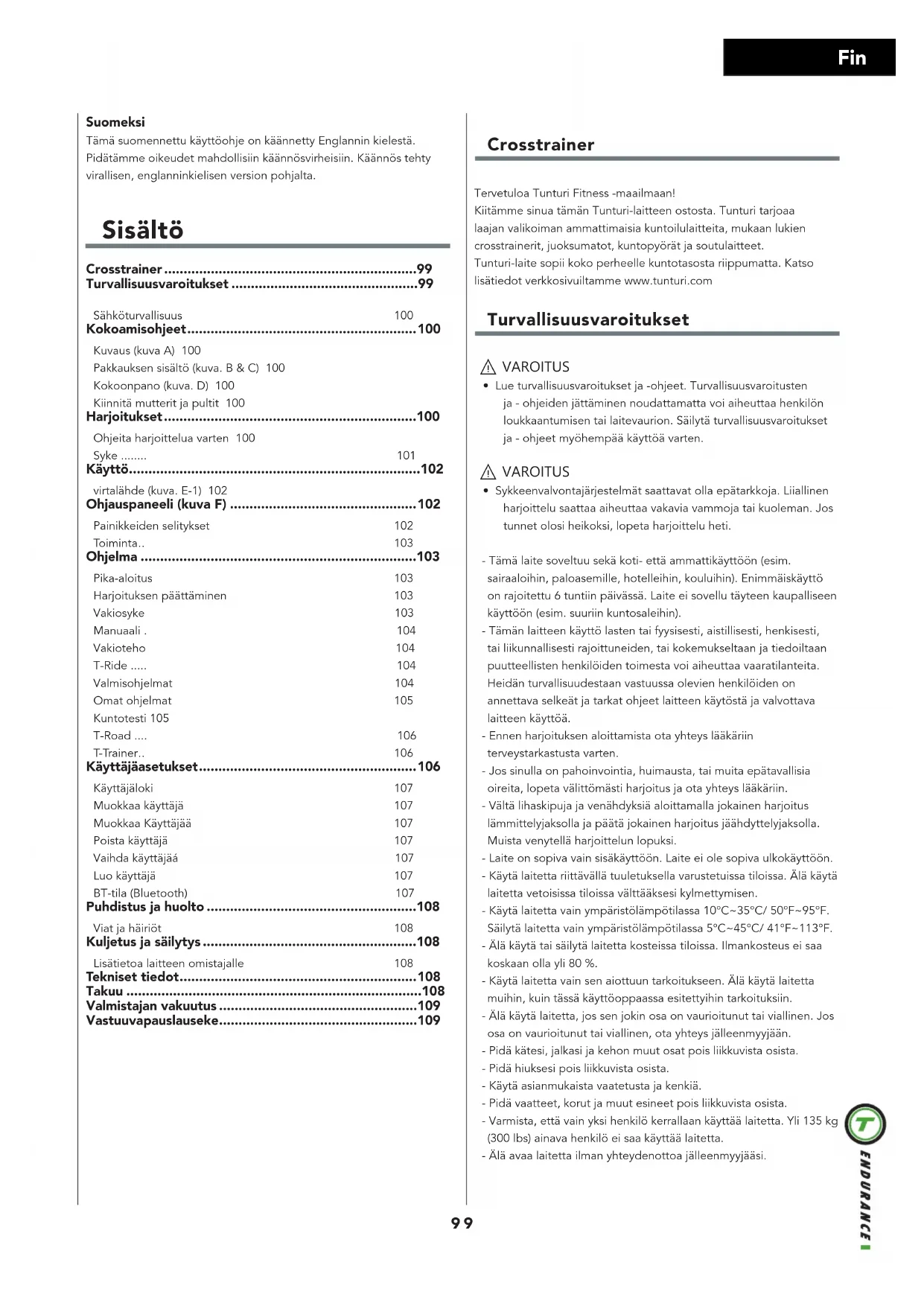 - Sykkeenvalvontajärjestelmät saattavat olla epätarkkoja. Liiallinen harjoittelu saattaa aiheuttaa vakavia vammoja tai kuoleman. Jos tunnet olosi heikoksi, lopeta harjoittelu heti. - Tämä laite soveltuu sekä koti- että ammattikäyttöön (esim. sairaaloihin, paloasemille, hotelleihin, kouluihin). Enimmäiskäyttö on rajoitettu 6 tuntiin päivässä. Laite ei sovellu täyteen kaupalliseen käyttöön (esim. suuriin kuntosaleihin). - Tämän laitteen käyttö lasten tai fyysisesti, aistillisesti, henkisesti, tai liikunnallisesti rajoittuneiden, tai kokemukseltaan ja tiedoiltaan puutteellisten henkilöiden toimesta voi aiheuttaa vaaratilanteita. Heidän turvallisuudestaan vastuussa olevien henkilöiden on annettava selkeät ja tarkat ohjeet laitteen käytöstä ja valvottava laitteen käyttöä. - Ennen harjoituksen aloittamista ota yhteys lääkäriin terveystarkastusta varten. - Jos sinulla on pahoinvointia, huimausta, tai muita epätavallisia oireita, lopeta välittömästi harjoitus ja ota yhteys lääkäriin. - Vältä lihaskipuja ja venähdyksiä aloittamalla jokainen harjoitus lämmittelyjaksolla ja päätä jokainen harjoitus jäähdyttelyjaksolla. Muista venytellä harjoittelun lopuksi. - Laite on sopiva vain sisäkäyttöön. Laite ei ole sopiva ulkokäyttöön. - Käytä laitetta riittävällä tuuletuksella varustetuissa tiloissa. Älä käytä laitetta vetoisissa tiloissa välttääksesi kylmettymisen. - Käytä laitetta vain ympäristölämpötilassa 10°C~35°C/ 50°F~95°F. Säilytä laitetta vain ympäristölämpötilassa 5°C~45°C/ 41°F~113°F. - Älä käytä tai säilytä laitetta kosteissa tiloissa. Ilmankosteus ei saa koskaan olla yli 80 %. - Käytä laitetta vain sen aiottuun tarkoitukseen. Älä käytä laitetta muihin, kuin tässä käyttöoppaassa esitettyihin tarkoituksiin. - Älä käytä laitetta, jos sen jokin osa on vaurioitunut tai viallinen. Jos osa on vaurioitunut tai viallinen, ota yhteys jälleenmyyjään. - Pidä kätesi, jalkasi ja kehon muut osat pois liikkuvista osista. - Pidä hiuksesi pois liikkuvista osista. - Käytä asianmukaista vaatetusta ja kenkiä. - Pidä vaatteet, korut ja muut esineet pois liikkuvista osista. - Varmista, että vain yksi henkilö kerrallaan käyttää laitetta. Yli 135 kg (300 lbs) ainava henkilö ei saa käyttää laitetta. - Älä avaa laitetta ilman yhteydenottoa jälleenmyyjääsi.Crosstrainer .................................................................99Turvallisuusvaroitukset ................................................99Sähköturvallisuus 100 Kokoamisohjeet ........................................................... 100 Kuvaus (kuva A) 100Pakkauksen sisältö (kuva. B & C) 100Kokoonpano (kuva. D) 100Kiinnitä mutterit ja pultit 100Harjoitukset .................................................................100Ohjeita harjoittelua varten 100Syke ........ 101Käyttö ...........................................................................102virtalähde (kuva. E-1) 102 Ohjauspaneeli (kuva F) ................................................102 Painikkeiden selitykset 102 Toiminta . . 103 Ohjelma .......................................................................103Pika-aloitus 103Harjoituksen päättäminen 103Vakiosyke 103Manuaali . 104Vakioteho 104T-Ride ..... 104Valmisohjelmat 104Omat ohjelmat 105Kuntotesti 105T-Road .... 106 T-Trainer . . 106 Käyttäjäasetukset ........................................................ 106 Käyttäjäloki 107Muokkaa käyttäjä 107Muokkaa Käyttäjää 107Poista käyttäjä 107Vaihda käyttäjäá 107Luo käyttäjä 107BT-tila (Bluetooth) 107Puhdistus ja huolto ......................................................108Viat ja häiriöt 108Kuljetus ja säilytys .......................................................108Lisätietoa laitteen omistajalle 108 Tekniset tiedot ............................................................. 108 Takuu ............................................................................108Valmistajan vakuutus ...................................................109Vastuuvapauslauseke ...................................................109100 Fin Sähköturvallisuus (koskee vain sähköistä laitetta) - Varmista aina ennen käyttöä, että sähkölähteen jännite on sama kuin laitekilvessä ilmoitettu laitteen nimellisjännite. - Älä käytä jatkojohtoa. - Pidä virtajohto pois kuumasta, öljystä ja terävistä kulmista. - Älä tee muutoksia virtajohtoon tai pistokkeeseen. - Älä käytä laitetta, jos virtajohto tai virtajohdon pistoke on vaurioitunut tai viallinen. Jos virtajohto tai virtajohdon pistoke on vaurioitunut tai viallinen, ota yhteys jälleenmyyjääsi. - Suorista aina virtajohto täysin. - Älä vie virtajohtoa laitteen alitse. Älä laita virtajohtoa maton alle. Älä laita virtajohdon päälle mitään esineitä. - Varmista, ettei virtajohto roiku pöydän kulman yli. Varmista, ettei virtajohtoon voi vahingossa tarttua kiinni tai kompastua. - Älä jätä laitetta ilman valvontaa virtajohdon ollessa liitettynä pistorasiaan. - Älä vedä pistoketta irti pistorasiasta virtajohdosta vetämällä. - Irrota pistoke pistorasiasta, kun laite ei ole käytössä, ennen asennusta tai purkamista ja ennen puhdistusta sekä huoltoa. Kokoamisohjeet Kuvaus (kuva A) Crosstrainer on paikallaan pysyvä kuntoilulaite, jota käytetään simuloimaan kävelyä tai juoksua ilman liiallista rasitusta niveliin. Pakkauksen sisältö (kuva. B & C) - Pakkaus sisältää kuvassa B näytetyt osat. - Pakkaus sisältää kuvassa C näytetyt kiinnittimet. Katso “Kuvaus”-osiota. ‼ ILMOITUS