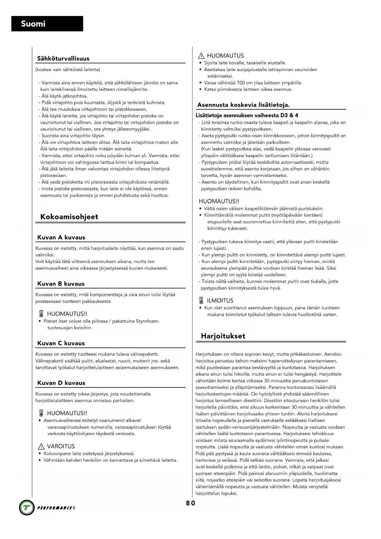 - Sykkeenvalvontajärjestelmät saattavat olla epätarkkoja Liiallinen harjoittelu saattaa aiheuttaa vakavia vammoja tai kuoleman Jos tunnet olosi heikoksi, lopeta harjoittelu heti - Laite on sopiva vain kotikäyttöön Laite ei ole sopiva kaupalliseen käyttöön - Enimmäiskäyttö on rajoitettu 5 tuntiin päivässä - Tämän laitteen käyttö lasten tai fyysisesti, aistillisesti, henkisesti, tai liikunnallisesti rajoittuneiden, tai kokemukseltaan ja tiedoiltaan puutteellisten henkilöiden toimesta voi aiheuttaa vaaratilanteita Heidän turvallisuudestaan vastuussa olevien henkilöiden on annettava selkeät ja tarkat ohjeet laitteen käytöstä ja valvottava laitteen käyttöä - Ennen harjoituksen aloittamista ota yhteys lääkäriin terveystarkastusta varten - Jos sinulla on pahoinvointia, huimausta, tai muita epätavallisia oireita, lopeta välittömästi harjoitus ja ota yhteys lääkäriin - Vältä lihaskipuja ja venähdyksiä aloittamalla jokainen harjoitus lämmittelyjaksolla ja päätä jokainen harjoitus jäähdyttelyjaksolla Muista venytellä harjoittelun lopuksi - Laite on sopiva vain sisäkäyttöön Laite ei ole sopiva ulkokäyttöön - Käytä laitetta riittävällä tuuletuksella varustetuissa tiloissa Älä käytä laitetta vetoisissa tiloissa välttääksesi kylmettymisen - Käytä laitetta vain ympäristölämpötilassa 10 °C - 35 °C Säilytä laitetta vain ympäristölämpötilassa 5 °C - 45 °C - Älä käytä tai säilytä laitetta kosteissa tiloissa Ilmankosteus ei saa koskaan olla yli 80 % - Käytä laitetta vain sen aiottuun tarkoitukseen Älä käytä laitetta muihin, kuin tässä käyttöoppaassa esitettyihin tarkoituksiin - Älä käytä laitetta, jos sen jokin osa on vaurioitunut tai viallinen Jos osa on vaurioitunut tai viallinen, ota yhteys jälleenmyyjään - Pidä kätesi, jalkasi ja kehon muut osat pois liikkuvista osista - Pidä hiuksesi pois liikkuvista osista - Käytä asianmukaista vaatetusta ja kenkiä - Pidä vaatteet, korut ja muut esineet pois liikkuvista osista - Varmista, että vain yksi henkilö kerrallaan käyttää laitetta Yli 135 kg (300 lbs) ainava henkilö ei saa käyttää laitetta - Älä avaa laitetta ilman yhteydenottoa jälleenmyyjääsi80 Suomi Sähköturvallisuus (koskee vain sähköistä laitetta) - Varmista aina ennen käyttöä, että sähkölähteen jännite on sama kuin laitekilvessä ilmoitettu laitteen nimellisjännite - Älä käytä jatkojohtoa - Pidä virtajohto pois kuumasta, öljystä ja terävistä kulmista - Älä tee muutoksia virtajohtoon tai pistokkeeseen - Älä käytä laitetta, jos virtajohto tai virtajohdon pistoke on vaurioitunut tai viallinen Jos virtajohto tai virtajohdon pistoke on vaurioitunut tai viallinen, ota yhteys jälleenmyyjääsi - Suorista aina virtajohto täysin - Älä vie virtajohtoa laitteen alitse Älä laita virtajohtoa maton alle Älä laita virtajohdon päälle mitään esineitä - Varmista, ettei virtajohto roiku pöydän kulman yli Varmista, ettei virtajohtoon voi vahingossa tarttua kiinni tai kompastua - Älä jätä laitetta ilman valvontaa virtajohdon ollessa liitettynä pistorasiaan - Älä vedä pistoketta irti pistorasiasta virtajohdosta vetämällä - Irrota pistoke pistorasiasta, kun laite ei ole käytössä, ennen asennusta tai purkamista ja ennen puhdistusta sekä huoltoa Kokoamisohjeet Kuvan A kuvaus Kuvassa on esitetty, miltä harjoituslaite näyttää, kun asennus on saatu valmiiksi Voit käyttää tätä viitteenä asennuksen aikana, mutta tee asennusvaiheet aina oikeassa järjestyksessä kuvien mukaisesti Kuvan B kuvaus Kuvassa on esitetty, mitä komponentteja ja osia sinun tulisi löytää poistaessasi tuotteen pakkauksesta ‼ HUOMAUTUS!!