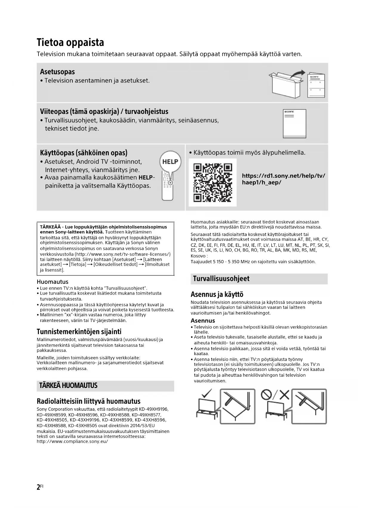 - Mallinimen ”xx”-kirjain vastaa numeroa, joka liittyy rakenteeseen, väriin tai TV-järjestelmään. Tunnistemerkintöjen sijainti Mallinumerotiedot, valmistuspäivämäärä (vuosi/kuukausi) ja jännitemerkintä sijaitsevat television takaosassa tai pakkauksessa. Malleille, joiden toimitukseen sisältyy verkkolaite: Verkkolaitteen mallinumero- ja sarjanumerotiedot sijaitsevat verkkolaitteen pohjassa. Radiolaitteisiin liittyvä huomautus Sony Corporation vakuuttaa, että radiolaitetyypit KD-49XH9196, KD-49XH8599, KD-49XH8596, KD-49XH8588, KD-49XH8577, KD-49XH8505, KD-43XH9196, KD-43XH8599, KD-43XH8596, KD-43XH8588, KD-43XH8505 ovat direktiivin 2014/53/EU mukaisia. EU-vaatimustenmukaisuusvakuutuksen täysimittainen teksti on saatavilla seuraavassa internetosoitteessa: http://www.compliance.sony.eu/ Huomautus asiakkaille: seuraavat tiedot koskevat ainoastaan laitteita, joita myydään EU:n direktiivejä noudattavissa maissa. Seuraavat tätä radiolaitetta koskevat käyttörajoitukset tai käyttövaltuutusvaatimukset ovat voimassa maissa AT, BE, HR, CY, CZ, DK, EE, FI, FR, DE, EL, HU, IE, IT, LV, LT, LU, MT, NL, PL, PT, SK, SI, ES, SE, UK, IS, LI, NO, CH, BG, RO, TR, AL, BA, MK, MD, RS, ME, Kosovo : Taajuudet 5 150 - 5 350 MHz on rajoitettu vain sisäkäyttöön. Asennus ja käyttö Noudata television asennuksessa ja käytössä seuraavia ohjeita välttääksesi tulipalon tai sähköiskun vaaran tai laitteen vaurioitumisen ja/tai henkilövahingot. Asennus