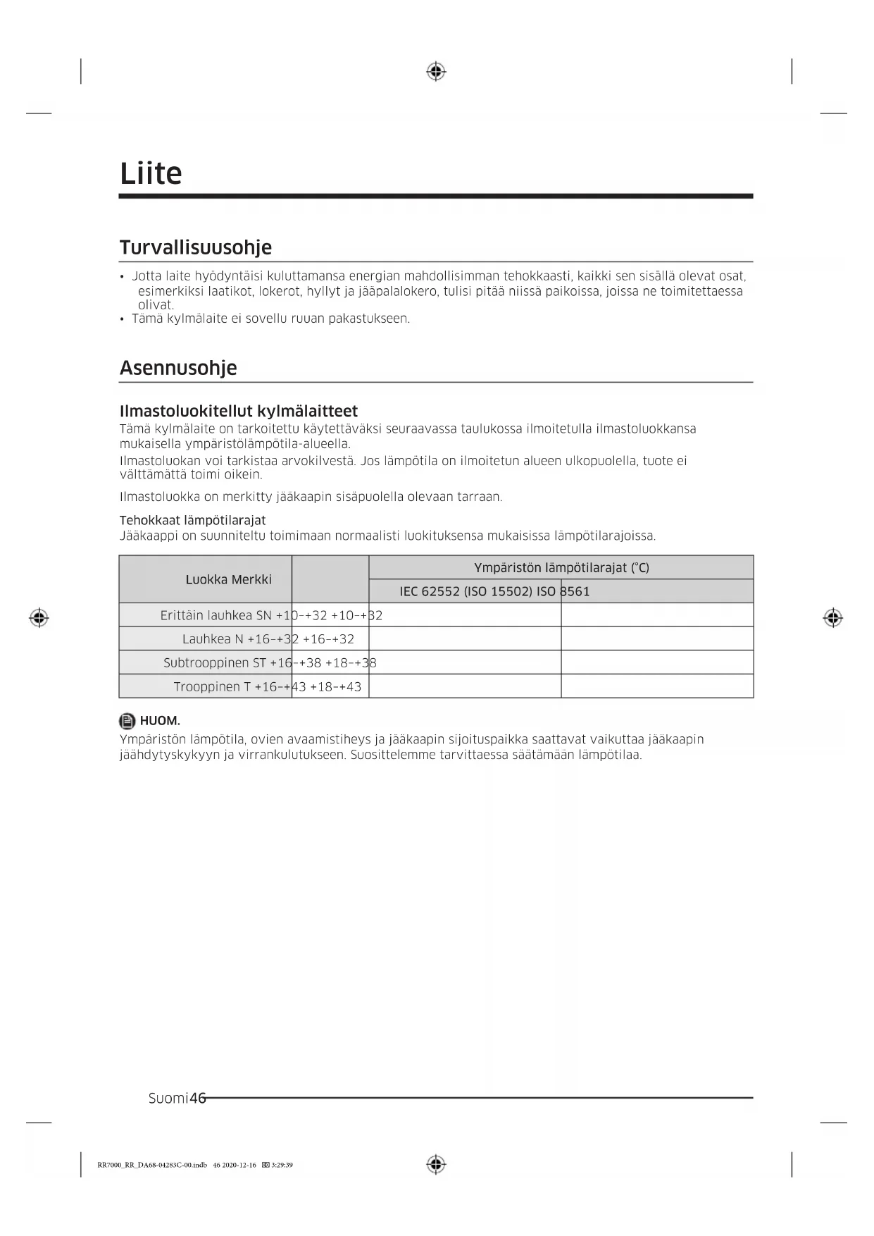 Erittäin lauhkea SN +10–+32 +10–+32 Lauhkea N +16–+32 +16–+32 Subtrooppinen ST +16–+38 +18–+38 Trooppinen T +16–+43 +18–+43 HUOM. Ympäristön lämpötila, ovien avaamistiheys ja jääkaapin sijoituspaikka saattavat vaikuttaa jääkaapin jäähdytyskykyyn ja virrankulutukseen. Suosittelemme tarvittaessa säätämään lämpötilaa. RR7000_RR_DA68-04283C-00.indb 46 2020-12-16 3:29:39Suomi 47 Lämpötilaohje Suositeltu lämpötila Ihanteellinen säilytyslämpötila-asetus: