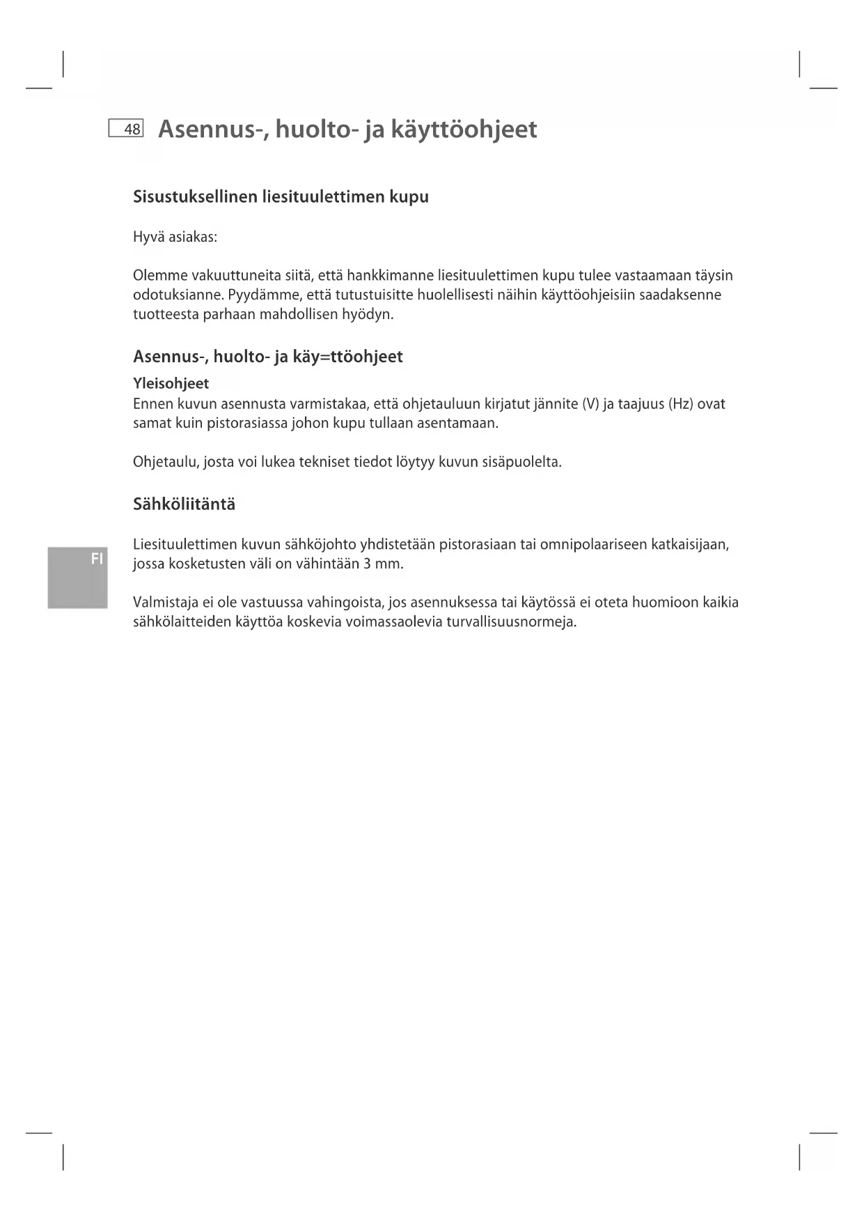 Sisustuksellinen liesituulettimen kupu Hyvä asiakas: Olemme vakuuttuneita siitä, että hankkimanne liesituulettimen kupu tulee vastaamaan täysin odotuksianne. Pyydämme, että tutustuisitte huolellisesti näihin käyttöohjeisiin saadaksenne tuotteesta parhaan mahdollisen hyödyn. Asennus-, huolto- ja käy=ttöohjeet Yleisohjeet Ennen kuvun asennusta varmistakaa, että ohjetauluun kirjatut jännite (V) ja taajuus (Hz) ovat samat kuin pistorasiassa johon kupu tullaan asentamaan. Ohjetaulu, josta voi lukea tekniset tiedot löytyy kuvun sisäpuolelta. Sähköliitäntä Liesituulettimen kuvun sähköjohto yhdistetään pistorasiaan tai omnipolaariseen katkaisijaan, jossa kosketusten väli on vähintään 3 mm. Valmistaja ei ole vastuussa vahingoista, jos asennuksessa tai käytössä ei oteta huomioon kaikia sähkölaitteiden käyttöa koskevia voimassaolevia turvallisuusnormeja. Asennus-, huolto- ja käyttöohjeet49