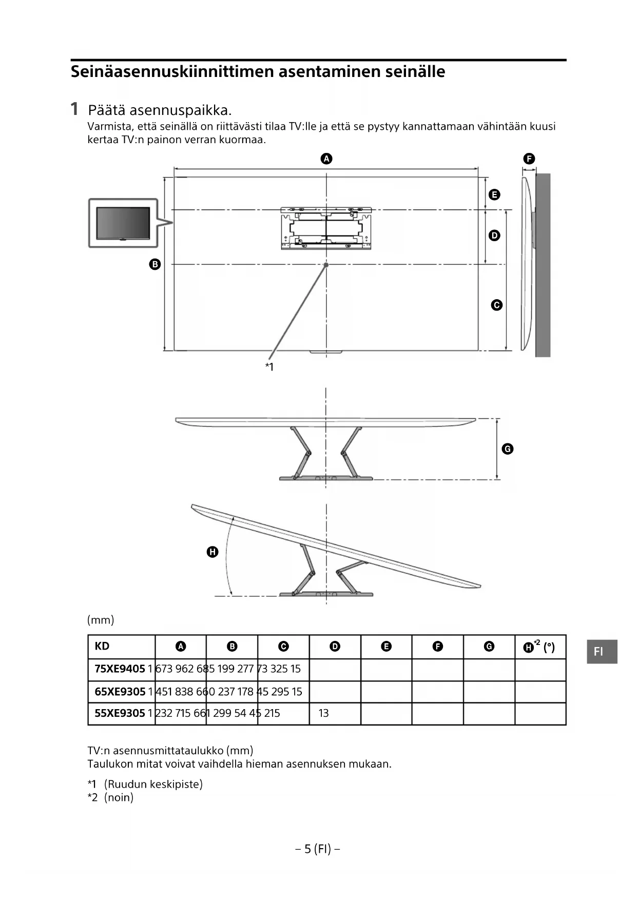 75XE9405 1 673 962 685 199 277 73 325 15 65XE9305 1 451 838 660 237 178 45 295 15 55XE9305 1 232 715 661 299 54 45 215 13 TV:n asennusmittataulukko (mm) Taulukon mitat voivat vaihdella hieman asennuksen mukaan. *1 (Ruudun keskipiste) *2 (noin)− 6 (FI) − Huomautus