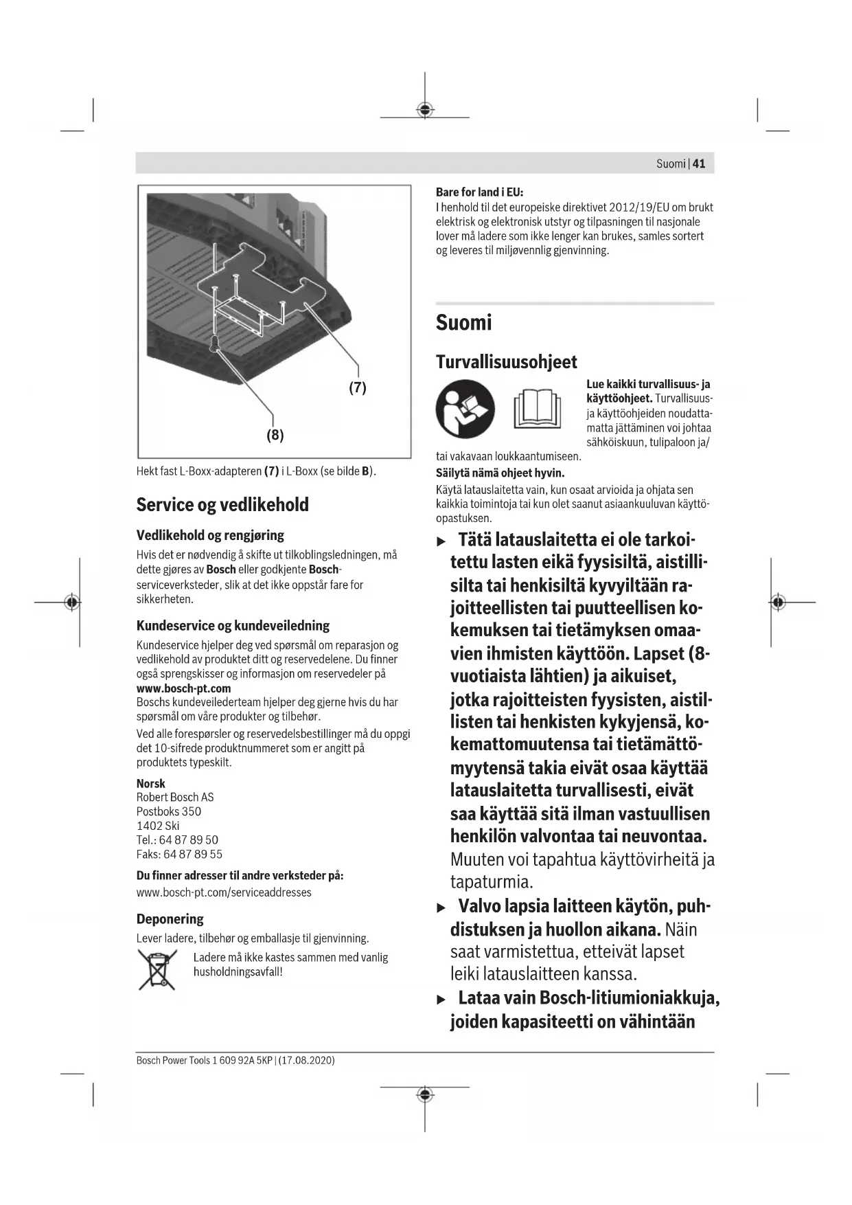 – 4,0Ah min 23 / 37 – 5,0Ah min 28 / 47 – 6,0Ah min 32 / 57 Lisää latausaikoja osoitteessa www.bosch-professional.com Akkukennojen määrä 4–15 Paino EPTA-Procedure01:2014 - ohjeiden mukaan kg 1,8 Suojausluokka / II A) riippuu lämpötilasta ja akkutyypistä B) Akun lataustila 80 %. Akun voi ottaa heti käyttöön. C) Akun lataustila 95%–100%. Käyttö Käyttöönotto u Huomioi sähköverkon jännite! Virtalähteen jännitteen tulee vastata latauslaitteen kilvessä olevia tietoja. 230V - 1 609 92A 5KP | (17.08.2020) Bosch Power ToolsSuomi | 43 tunnuksella merkittyjä latauslaitteita voi käyttää myös 220V:n verkoissa. Lataus Akut (1) ladataan peräkkäin kahdessa latausjaksossa. – Ensimmäinen latausjakso lataa kaikki laitteeseen asetetut akut n.80% täyttöasteeseen. – Toinen latausjakso lataa akut n.80% täyttöasteesta n.100% täyttöasteeseen. Toinen latausjakso alkaa, kun kaikki laitteeseen asetetut akut on ladattu n.80% täyttö- asteeseen. Varmista, että kaikki latausaukot (2) ja akun koskettimet ovat vapaita karkeasta liasta. Varmista, että akut on asetettu täydellisesti paikoilleen. Lataus alkaa heti kun olet kytkenyt pistotulpan pistorasiaan ja asettanut akun laitteeseen. Jos lataus käynnistetään sa- manaikaisesti useamman akun kanssa, ne ladataan peräk- käin laitteeseen merkittyjen nuolten(6)suuntaan (vastapäi- vään). Jos akun varaus on yli n.80%, se ohitetaan ensimmäisessä latausjaksossa ja ladataan toisessa latausjaksossa (n.80% täyttöasteesta n.100% täyttöasteeseen). Jos asetat toisen latausjakson aikana (n.80% täyttöasteesta n.100% täyttö- asteeseen) uuden akun, jonka lataustila on alle n.80%, ky- seinen akku ladataan välittömästi. Kun tämä akku on ladattu n.80% täyttöasteeseen, latausjärjestys määritetään uudel- leen. Seuraava toisessa latausjaksossa ladattava akku (n.80% täyttöasteesta n.100% täyttöasteeseen) noudat- taa latauslaitteen nuolten(6)osoittamaa järjestystä (vasta- päivään). Älykkään lataustoiminnon avulla akun lataustila tunnistetaan automaattisesti ja akku ladataan aina optimaalisella lataus- virralla akun lämpötilan ja jännitteen mukaan. Tämä suojaa akkua ja pitää akun aina täyteen ladattuna la- tauslaitteessa. Huomautus: lataus on mahdollista vain, kun akun lämpötila on sallitun latauslämpötila-alueen sisällä, katso kappale "Tekniset tiedot". Prio-painike (Priority Start)(3) Jokaisen latausaukon(2)kohdalla on Prio- painike(3)jolla kyseisen latausaukon akun la- tauksen voi käynnistää välittömästi. – Kun painat yhden kerran Prio- painiketta(3), tämän latausaukon akku ladataan etusijai- sesti n.80% täyttöasteeseen (ensimmäinen latausjakso). Latauksen käynnistymisen merkiksi akun lataustilan näytön(4)neljä ensimmäistä LED-valoa syttyvät het- keksi. Kun akku on ladattu n.80% täyttöasteeseen, nuo- len suunnassa(6)seuraavana oleva akku ladataan (vasta- päivään). – Kun paina kaksi kertaa Prio-painiketta(3), tämän latau- saukon akku ladataan etusijaisesti n.100% täyttöastee- seen. Latauksen käynnistymisen merkiksi akun lataustilan näytön(4)viisi LED-valoa syttyy hetkeksi. Tämän lataus- kerran jälkeen muut akut ladataan n.80% täyttöastee- seen. Kun etusijainen akku(1)on ladattu täyteen, tämän jälkeen siirrytään seuraavan latausaukon akun lataamiseen. Lataus tapahtuu latauslaitteen nuolten(6)osoittamassa järjestyk- sessä (vastapäivään). Merkkivalojen merkitys Akun lataustilan näytön(4)vihreät merkkivalot Kun asetat akun(1)paikalleen, sen kohdalla oleva akun la- taustilan näyttö (4) ilmoittaa akun lataustilan. Latauksen aikana näet ladatun akkukapasiteetin jatkuvasti palavista LED-valoista. Peräkkäin vilkkuvat LED-valot (nykyi- nen tila) näyttävät parhaillaan ladattavan kapasiteetin. Lataustilan LED-merkkivalot ilmoittavat akun(1)varauksen latauksen aikana ja sen jälkeen. LED-valojen tila Akun kapasi- teetti, n. Ensimmäinen LED-valo palaa jatku- vasti. ≥20% Kaksi ensimmäistä LED-valoa palaa jatkuvasti. ≥40% Kolme ensimmäistä LED-valoa palaa jatkuvasti. ≥60% Neljä ensimmäistä LED-valoa palaa jatkuvasti. ≥80% Viisi ensimmäistä LED-valoa palaa jat- kuvasti. >95% Huomautus: lataus on mahdollista vain, kun akun lämpötila on sallitun latauslämpötila-alueen sisällä, katso kappale "Tekniset tiedot". Latausaukon(2)valmiustilassa kyseisen akun lataustilan näytön(4)ensimmäinen LED-valo palaa jatkuvasti vihreänä. Lämpötilavalvonnan/virheilmoituksen punainen merkkivalo (5) Jatkuva palaminen Jatkuvasti palava punainen valo ilmoittaa, että akun lämpötila on sallitun latauslämpötila-alu- een ulkopuolella, katso kappale "Tekniset tie- dot". Lataustoimenpide alkaa heti kun sallittu lämpötila-alue on saavutettu. Vilkkuva valo Punaisena vilkkuva valo ilmoittaa kyseisen la- tausaukon akun viasta. Kuusi samanaikaisesti vilkkuvaa punaista valoa ilmoittaa latauslaitteen viasta. Vika – syyt ja korjausohjeet Syy Korjausohje Lämpötilavalvonnan/virheilmoituksen punainen merkkivalo(5) vilkkuu (yksittäisessä latausaukossa) Lataaminen ei ole mahdollista Akkua ei ole asennettu (kun- nolla) Asenna akku kunnolla lataus- laitteeseen Bosch Power Tools 1 609 92A 5KP | (17.08.2020)44 | Suomi Syy Korjausohje Akku- ja latauskoskettimet li- kaantuneet Puhdista akku- ja latauskos- kettimet; esim. asenna ja ir- rota akku useamman kerran, vaihda akku tarvittaessa Akku on viallinen Vaihda akku uuteen Lämpötilavalvonnan/virheilmoituksen kuusi punaista merkkivaloa(5)vilkkuu samanaikaisesti Latauslaite on havainnut si- säisen virheen Varmista, että kaikki akut on asetettu täydellisesti paikoil- leen, irrota verkkopistoke ja aseta takaisin paikalleen. Jos vika ilmenee uudelleen, tar- kistuta tarvittaessa lataus- laite valtuutetussaBoschhuoltopi steessä Merkkivalot eivät syty Latauslaitteen pistotulppaa ei ole kytketty (kunnolla) pis- torasiaan Kytke pistotulppa (kunnolla) pistorasiaan Pistorasia, verkkojohto tai la- tauslaite o