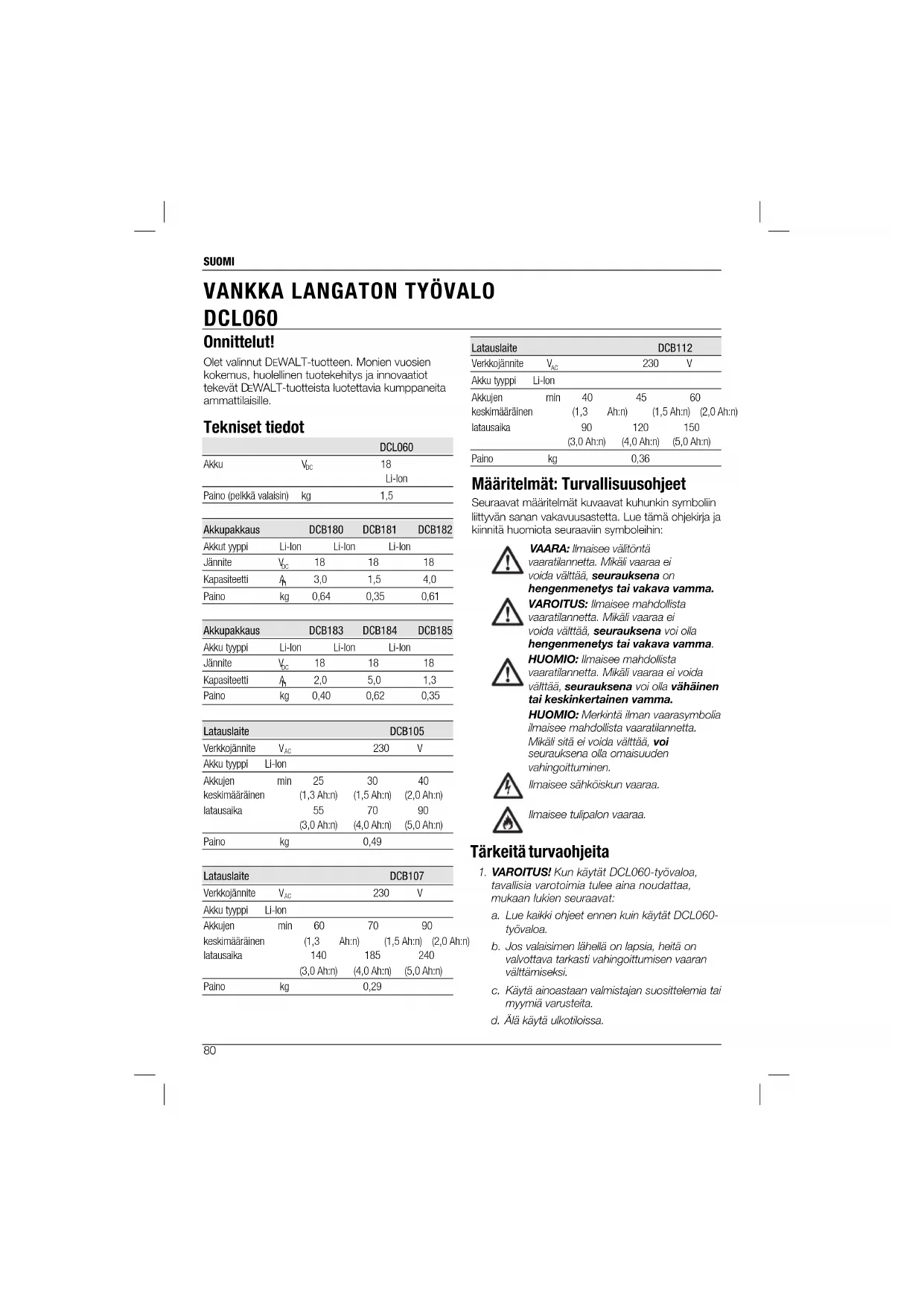 230 V Akku tyyppi Li-Ion Akkujen min 40 45 60 keskimääräinen (1,3 Ah:n) (1,5 Ah:n) (2,0 Ah:n) latausaika 90 120 150 (3,0 Ah:n) (4,0 Ah:n) (5,0 Ah:n) Paino kg 0,36 Määritelmät: Turvallisuusohjeet Seuraavat määritelmät kuvaavat kuhunkin symboliin liittyvän sanan vakavuusastetta. Lue tämä ohjekirja ja kiinnitä huomiota seuraaviin symboleihin: VAARA: Ilmaisee välitöntä vaaratilannetta. Mikäli vaaraa ei voida välttää, seurauksena on hengenmenetys tai vakava vamma. VAROITUS: Ilmaisee mahdollista vaaratilannetta. Mikäli vaaraa ei voida välttää, seurauksena voi olla hengenmenetys tai vakava vamma. HUOMIO: Ilmaisee mahdollista vaaratilannetta. Mikäli vaaraa ei voida välttää, seurauksena voi olla vähäinen tai keskinkertainen vamma. HUOMIO: Merkintä ilman vaarasymbolia ilmaisee mahdollista vaaratilannetta. Mikäli sitä ei voida välttää, voi seurauksena olla omaisuuden vahingoittuminen. Ilmaisee sähköiskun vaaraa. Ilmaisee tulipalon vaaraa. Tärkeitä turvaohjeita