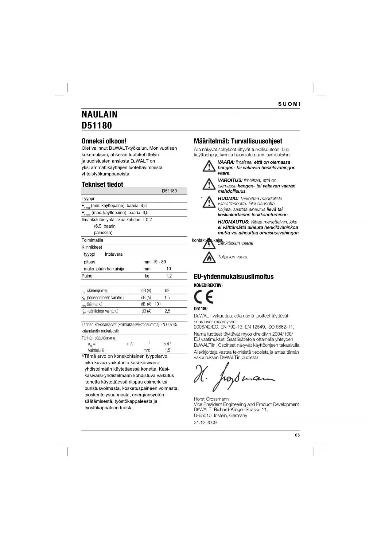 EWALTiin. Osoitteet näkyvät käyttöohjeen takasivulla. Allekirjoittaja vastaa teknisistä tiedoista ja antaa tämän vakuutuksen D EWALTin puolesta. Horst Grossmann Vice President Engineering and Product Development DEWALT, Richard-Klinger-Strasse 11, D-65510, Idstein, Germany