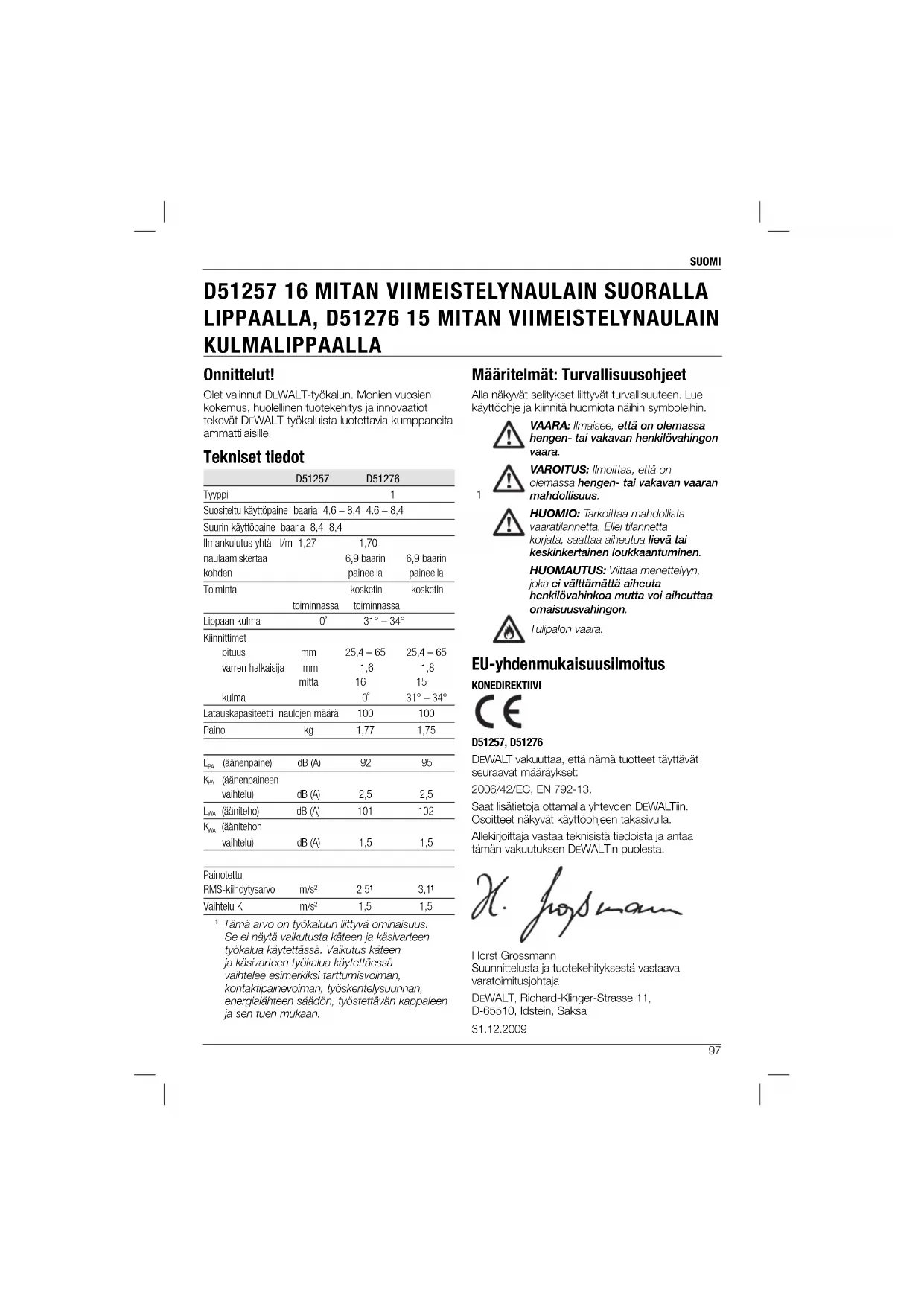 Tämä arvo on työkaluun liittyvä ominaisuus. Se ei näytä vaikutusta käteen ja käsivarteen työkalua käytettässä. Vaikutus käteen ja käsivarteen työkalua käytettäessä vaihtelee esimerkiksi tarttumisvoiman, kontaktipainevoiman, työskentelysuunnan, energialähteen säädön, työstettävän kappaleen ja sen tuen mukaan. Määritelmät: Turvallisuusohjeet Alla näkyvät selitykset liittyvät turvallisuuteen. Lue käyttöohje ja kiinnitä huomiota näihin symboleihin. VAARA: Ilmaisee, että on olemassa hengen- tai vakavan henkilövahingon vaara. VAROITUS: Ilmoittaa, että on olemassa hengen- tai vakavan vaaran mahdollisuus. HUOMIO: Tarkoittaa mahdollista vaaratilannetta. Ellei tilannetta korjata, saattaa aiheutua lievä tai keskinkertainen loukkaantuminen. HUOMAUTUS: Viittaa menettelyyn, joka ei välttämättä aiheuta henkilövahinkoa mutta voi aiheuttaa omaisuusvahingon. Tulipalon vaara. EU-yhdenmukaisuusilmoitus KONEDIREKTIIVI D51257, D51276 DEWALT vakuuttaa, että nämä tuotteet täyttävät seuraavat määräykset: 2006/42/EC, EN 792-13. Saat lisätietoja ottamalla yhteyden DEWALTiin. Osoitteet näkyvät käyttöohjeen takasivulla. Allekirjoittaja vastaa teknisistä tiedoista ja antaa tämän vakuutuksen DEWALTin puolesta. Horst Grossmann Suunnittelusta ja tuotekehityksestä vastaava varatoimitusjohtaja DEWALT, Richard-Klinger-Strasse 11, D-65510, Idstein, Saksa