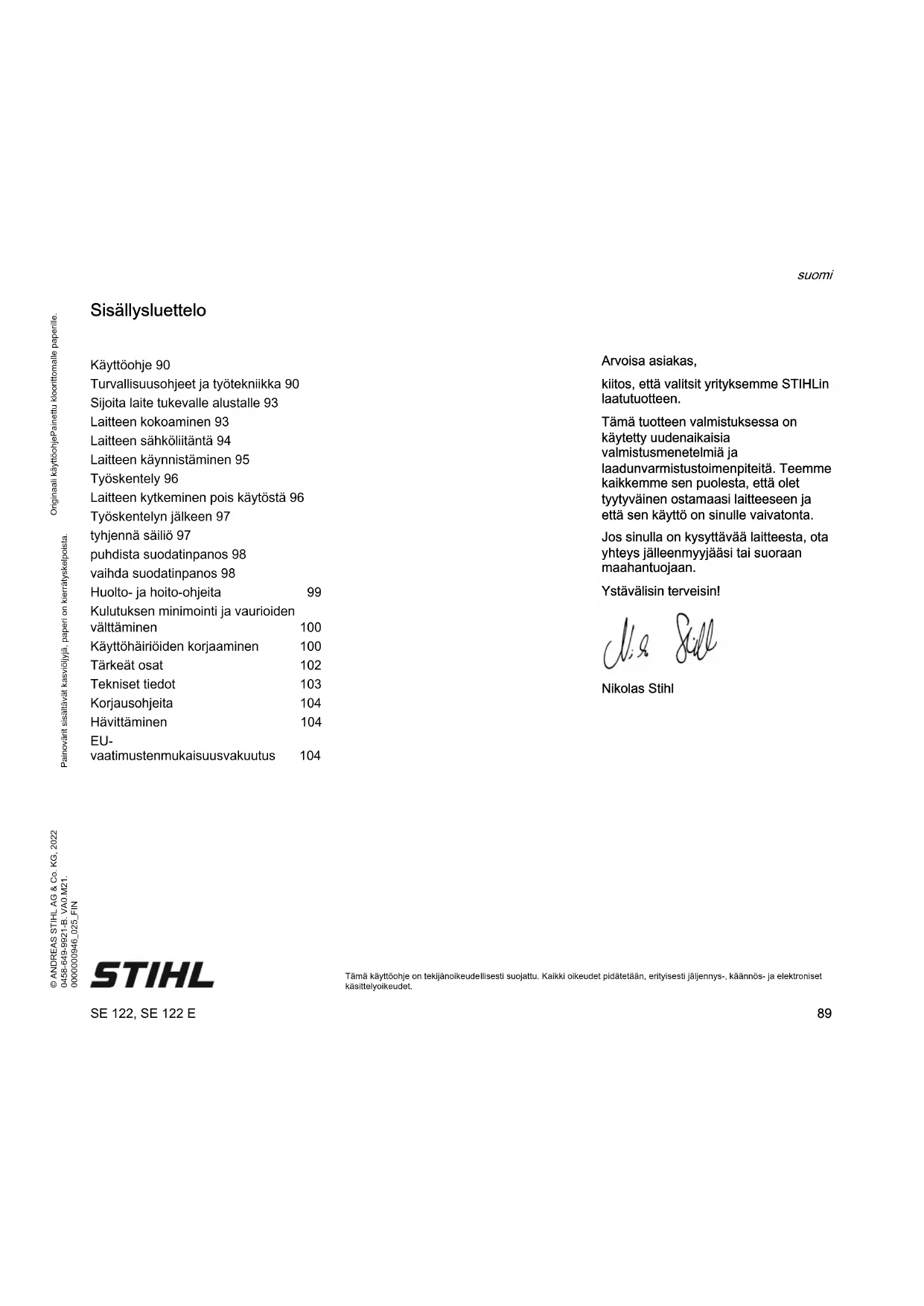 Waiblingen, 2020-02-03 ANDREAS STIHL AG & Co. KG enligt fullmakt Dr. Jürgen Hoffmann Avdelningschef produktgodkännande, regleringOriginaali käyttöohjePainettu kloorittomalle paperille. Painovärit sisältävät kasviöljyjä, paperi on kierrätyskelpoista. © ANDREAS STIHL AG & Co. KG, 2022 0458-649-9921-B. VA0.M21. 0000000946_025_FIN SE 122, SE 122 E suomi