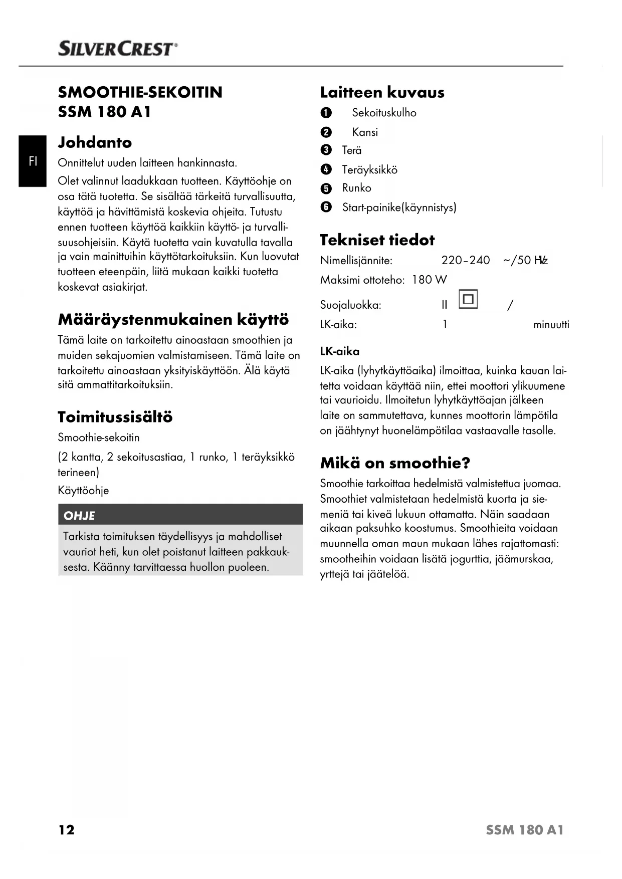 /50 Hz Maksimi ottoteho: 180 W Suojaluokka: II / LK-aika: 1 minuutti LK-aika LK-aika (lyhytkäyttöaika) ilmoittaa, kuinka kauan lai- tetta voidaan käyttää niin, ettei moottori ylikuumene tai vaurioidu. Ilmoitetun lyhytkäyttöajan jälkeen laite on sammutettava, kunnes moottorin lämpötila on jäähtynyt huonelämpötilaa vastaavalle tasolle. Mikä on smoothie? Smoothie tarkoittaa hedelmistä valmistettua juomaa. Smoothiet valmistetaan hedelmistä kuorta ja sie- meniä tai kiveä lukuun ottamatta. Näin saadaan aikaan paksuhko koostumus. Smoothieita voidaan muunnella oman maun mukaan lähes rajattomasti: smootheihin voidaan lisätä jogurttia, jäämurskaa, yrttejä tai jäätelöä.13 SSM 180 A1