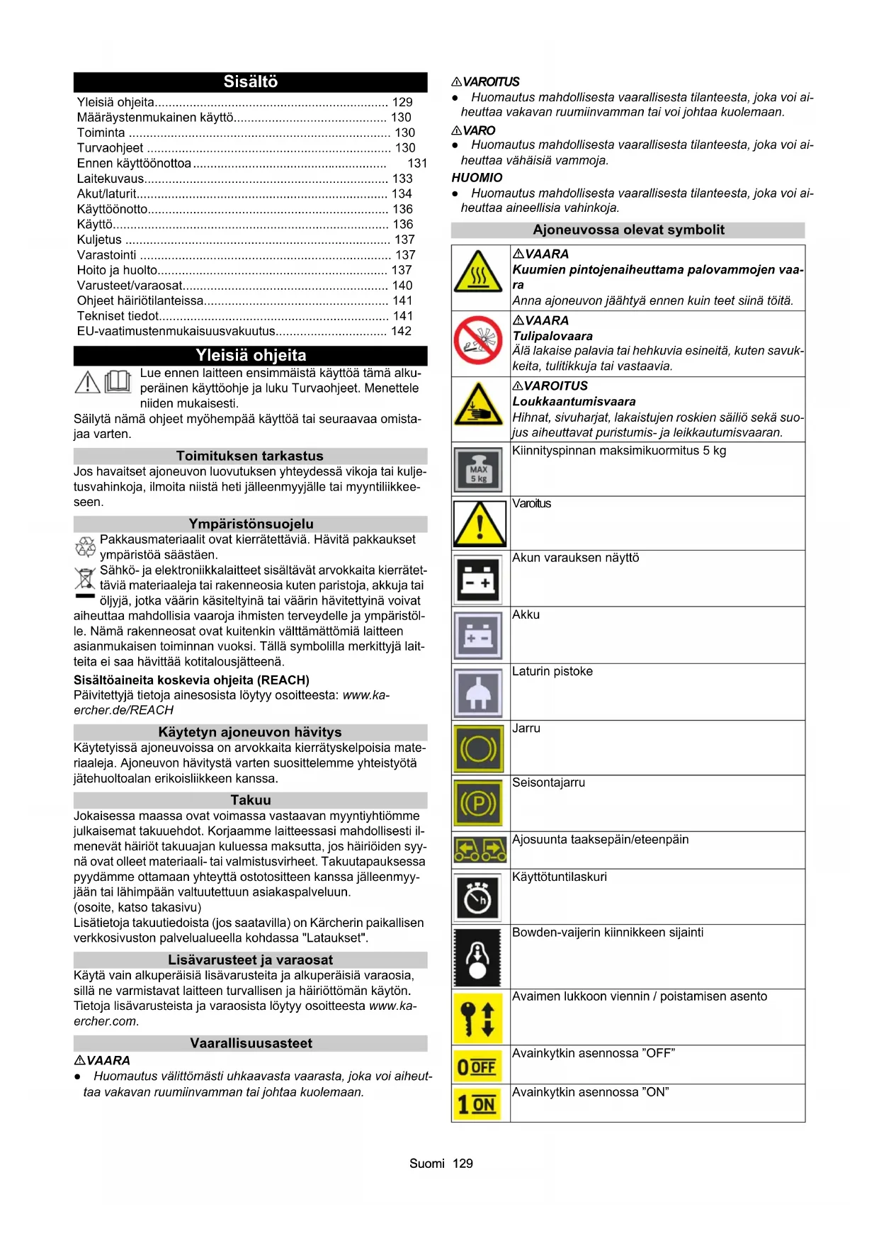 - dB(A)333 KM 85/50 W Bp (1.351-116.0) KM 85/50 W Bp *IN (1.351-118.0) KM 85/50 W Bp Pack (1.351-117.0) KM 85/50 W Bp Pack 2SB (1.351-119.0)Suomi 129 Sisältö Yleisiä ohjeita Lue ennen laitteen ensimmäistä käyttöä tämä alku- peräinen käyttöohje ja luku Turvaohjeet. Menettele niiden mukaisesti. Säilytä nämä ohjeet myöhempää käyttöä tai seuraavaa omista- jaa varten. Toimituksen tarkastus Jos havaitset ajoneuvon luovutuksen yhteydessä vikoja tai kulje- tusvahinkoja, ilmoita niistä heti jälleenmyyjälle tai myyntiliikkee- seen. Ympäristönsuojelu Pakkausmateriaalit ovat kierrätettäviä. Hävitä pakkaukset ympäristöä säästäen. Sähkö- ja elektroniikkalaitteet sisältävät arvokkaita kierrätet- täviä materiaaleja tai rakenneosia kuten paristoja, akkuja tai öljyjä, jotka väärin käsiteltyinä tai väärin hävitettyinä voivat aiheuttaa mahdollisia vaaroja ihmisten terveydelle ja ympäristöl- le. Nämä rakenneosat ovat kuitenkin välttämättömiä laitteen asianmukaisen toiminnan vuoksi. Tällä symbolilla merkittyjä lait- teita ei saa hävittää kotitalousjätteenä. Sisältöaineita koskevia ohjeita (REACH) Päivitettyjä tietoja ainesosista löytyy osoitteesta: www.ka- ercher.de/REACH Käytetyn ajoneuvon hävitys Käytetyissä ajoneuvoissa on arvokkaita kierrätyskelpoisia mate- riaaleja. Ajoneuvon hävitystä varten suosittelemme yhteistyötä jätehuoltoalan erikoisliikkeen kanssa. Takuu Jokaisessa maassa ovat voimassa vastaavan myyntiyhtiömme julkaisemat takuuehdot. Korjaamme laitteessasi mahdollisesti il- menevät häiriöt takuuajan kuluessa maksutta, jos häiriöiden syy- nä ovat olleet materiaali- tai valmistusvirheet. Takuutapauksessa pyydämme ottamaan yhteyttä ostotositteen kanssa jälleenmyy- jään tai lähimpään valtuutettuun asiakaspalveluun. (osoite, katso takasivu) Lisätietoja takuutiedoista (jos saatavilla) on Kärcherin paikallisen verkkosivuston palvelualueella kohdassa "Lataukset". Lisävarusteet ja varaosat Käytä vain alkuperäisiä lisävarusteita ja alkuperäisiä varaosia, sillä ne varmistavat laitteen turvallisen ja häiriöttömän käytön. Tietoja lisävarusteista ja varaosista löytyy osoitteesta www.ka- ercher.com. Vaarallisuusasteet VAARA ● Huomautus välittömästi uhkaavasta vaarasta, joka voi aiheut- taa vakavan ruumiinvamman tai johtaa kuolemaan. 몇 VAROITUS ● Huomautus mahdollisesta vaarallisesta tilanteesta, joka voi ai- heuttaa vakavan ruumiinvamman tai voi johtaa kuolemaan. 몇 VARO ● Huomautus mahdollisesta vaarallisesta tilanteesta, joka voi ai- heuttaa vähäisiä vammoja. HUOMIO ● Huomautus mahdollisesta vaarallisesta tilanteesta, joka voi ai- heuttaa aineellisia vahinkoja. Ajoneuvossa olevat symbolit Yleisiä ohjeita p. 129