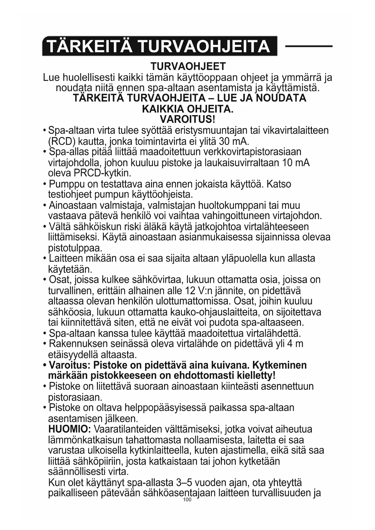 TÄRKEITÄ TURVALLISUUSOHJEITA pg 100 TARKISTUKSET ENNEN ASENNUSTA pg 109 ASENNUS pg 110 ASENNUSOHJEET TALVELLA pg 110 SPA-ALTAAN KÄYTTÄMINEN pg 114 HUOLTO pg 117 PURKAMINEN JA VARASTOINTI pg 119 VIANETSINTÄ pg 121 VIKAOODIT pg 122TURVAOHJEET Lue huolellisesti kaikki tämän käyttöoppaan ohjeet ja ymmärrä ja noudata niitä ennen spa-altaan asentamista ja käyttämistä.