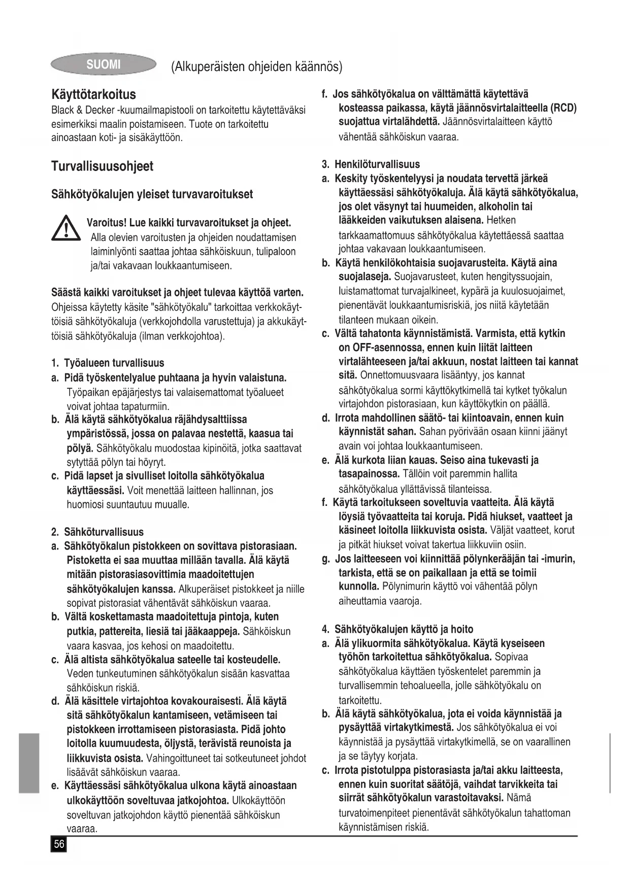 Jos virtajohto vahingoittuu, sen vaihtaminen tulee turvalisuussyista jattaa valmistajan tai valtuutetun Black & Decker -huollon tehtavaksi.