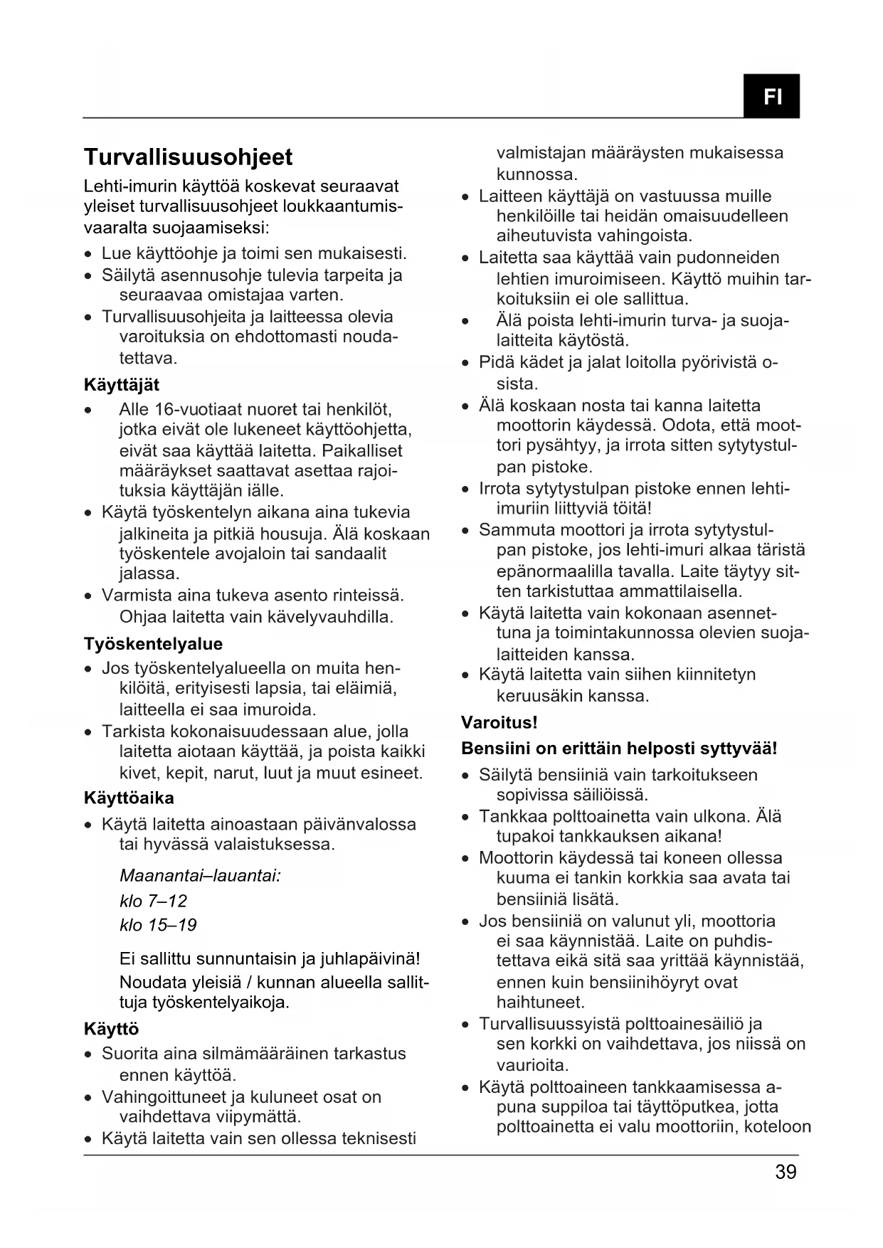- Laitetta saa käyttää vain pudonneiden lehtien imuroimiseen. Käyttö muihin tar- koituksiin ei ole sallittua.