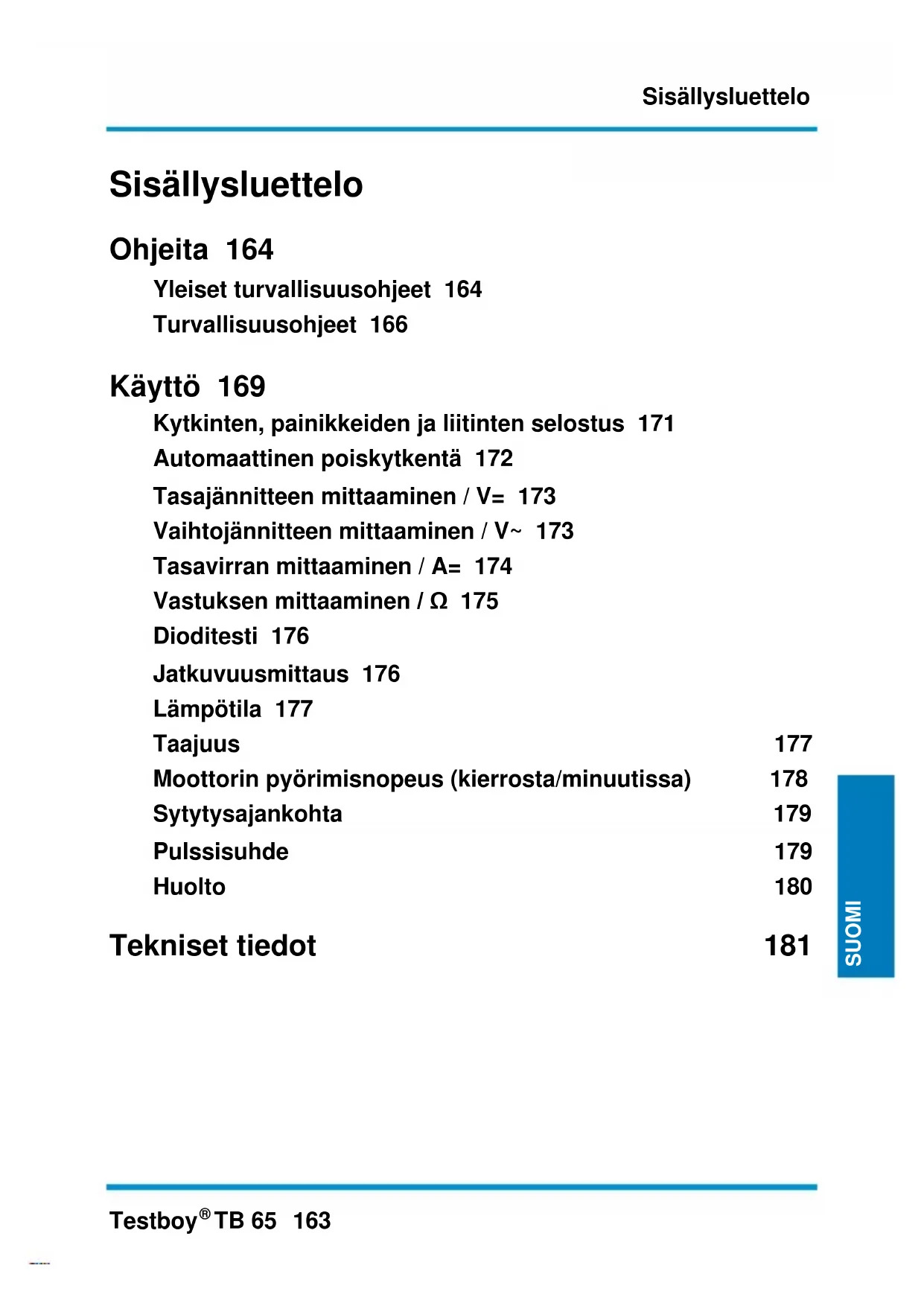 TB 65 163 SUOMI SUOMI SUOMI SUOMI Sisällysluettelo Ohjeita 164 Yleiset turvallisuusohjeet 164 Turvallisuusohjeet 166 Käyttö 169 Kytkinten, painikkeiden ja liitinten selostus 171 Automaattinen poiskytkentä 172 Tasajännitteen mittaaminen / V= 173 Vaihtojännitteen mittaaminen / V~ 173 Tasavirran mittaaminen / A= 174 Vastuksen mittaaminen / Ω 175 Dioditesti 176 Jatkuvuusmittaus 176 Lämpötila 177 Taajuus 177 Moottorin pyörimisnopeus (kierrosta/minuutissa) 178 Sytytysajankohta 179 Pulssisuhde 179 Huolto 180 Tekniset tiedot 181Ohjeita