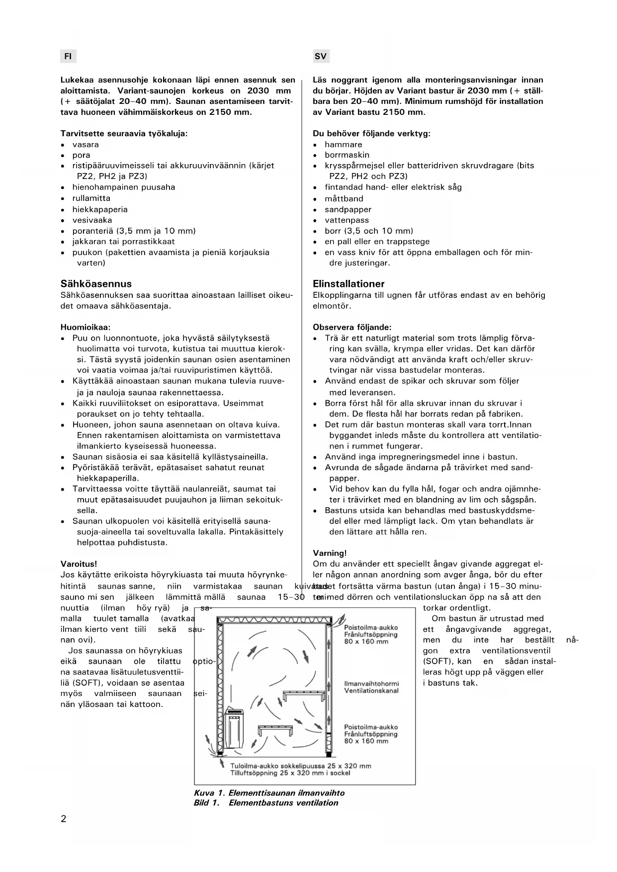 - Saunanulkopuolenvoikäsitelläerityiselläsauna- suoja-aineellataisoveltuvallalakalla.Pintakäsittely helpottaapuhdistusta. Varoitus! Joskäytätteerikoistahöyrykiuastataimuutahöyrynke- hitintä saunassanne, niin varmistakaa saunan kuivatus saunomisen jälkeen lämmittämällä saunaa 15–30 mi- nuuttia (ilman höyryä) ja sa- malla tuulettamalla (avatkaa ilmankiertoventtiili sekä sau- nanovi). Jossaunassaonhöyrykiuas eikä saunaan ole tilattu optio- nasaatavaalisätuuletusventtii- liä(SOFT),voidaanseasentaa myös valmiiseen saunaan sei- nänyläosaantaikattoon. Läs noggrant igenom alla monteringsanvisningar innan du börjar. Höjden av Variant bastur är 2030 mm (+ ställ- bara ben 20–40 mm). Minimum rumshöjd för installation av Variant bastu 2150 mm. Du behöver följande verktyg: