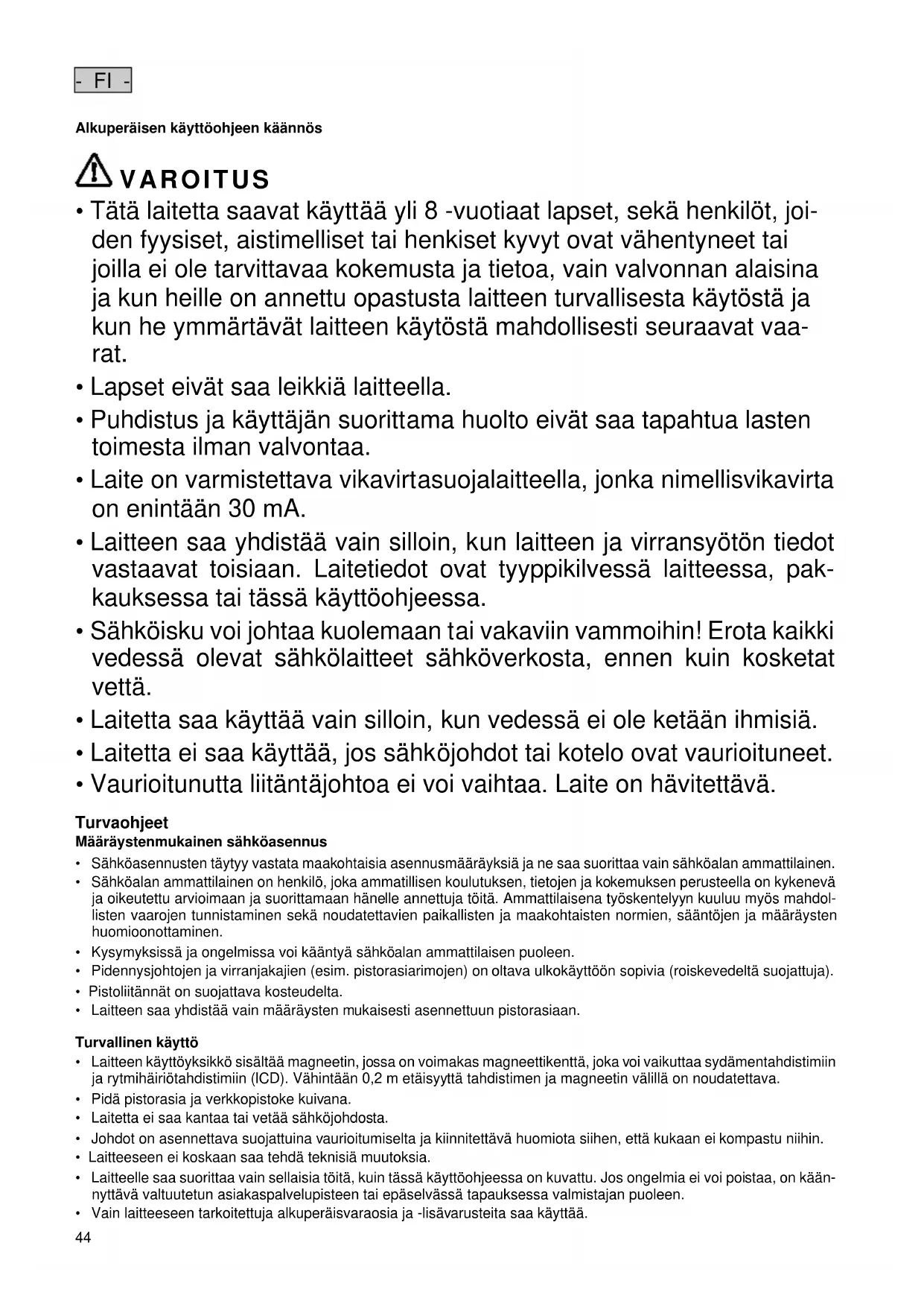 - Vaurioitunutta liitäntäjohtoa ei voi vaihtaa. Laite on hävitettävä. Turvaohjeet Määräystenmukainen sähköasennus
