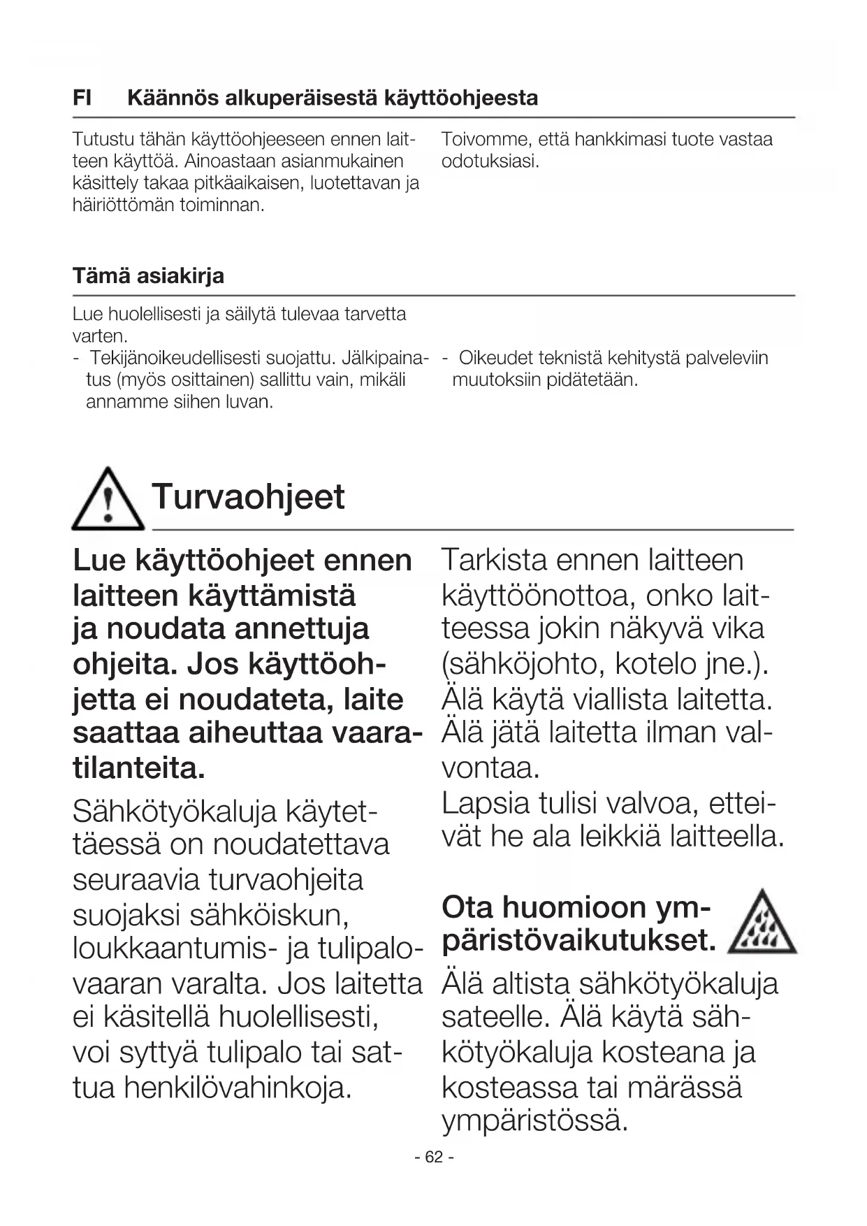 Ole varovainen käyt- täessäsi laitteita helposti syttyvien materiaalien lä- hellä. Älä suuntaa laitetta pitkäksi aikaa samaan kohtaan. Älä käytä räjäh- dysalttiissa ympäristössä. Ulos tuleva lämpö voi joh- tua piilossa oleviin palaviin materiaaleihin. Suojaudu sähköiskulta. Vältä kosketusta maa- doitettuihin osiin (putkiin, lämpöpattereihin, liesiin, jääkaappeihin). Älä jätä laitetta ilman val- vontaa, kun se on toimin- nassa. Säilytä työkaluja turvallisesti. Aseta laite käytön jälkeen alustalle ja anna sen jääh- tyä, ennen kuin se paka- taan pois. Työkaluja, jotka eivät ole käytössä, on säilytettä- vä kuivissa, suljetuissa tiloissa ja lapsilta ulottu- mattomissa. Yli 8-vuotiaat lapset ja henkilöt, joiden fyysiset ominaisuudet, aistit tai henkiset valmiu- det ovat rajoittuneet tai joilta puuttuu tarvittava kokemus ja osaaminen, saavat käyttää laitetta, jos heitä valvotaan tai hei- dät on opastettu laitteen toimintaan siten, että he osaavat käyttää laitetta turvallisesti ja tunnistavat käyttöön liittyvät vaarat. Lapset eivät saa leikkiä laitteella. Lapset eivät saa puh- distaa tai huoltaa laitetta ilman valvontaa. Turvaohjeet- 64 - Älä ylikuormita työkalujasi. Ne toimivat paremmin ja turvallisemmin annetulla tehoalueella. Älä kanna työkalua johdosta äläkä vedä johdosta irrottaessa- si pistoketta pistorasiasta. Suojaa johto kuumuu- delta, öljyltä ja teräviltä reunoilta. Varo myrkyllisiä kaasuja ja huomioi syttymisvaara. Muoveja, maaleja ja mui- ta vastaavia materiaaleja lämmitettäessä saattaa syntyä myrkyllisiä kaasuja. Huomioi palo- ja syttymis- vaara. Käytä oman turvallisuutesi vuoksi vain käyttöohjees- sa ilmoitettuja tai työkalun valmistajan suosittelemia tai ilmoittamia lisävarustei- ta ja lisälaitteita. Muiden kuin käyttöoh- jeessa tai luettelossa suo- siteltujen käyttötyökalujen tai lisävarusteiden käyttö voi merkitä henkilökoh- taista loukkaantumisvaa- raa. Vain sähköalan ammat- tilainen saa suorit- taa korjaukset Tämä sähkötyökalu vastaa voimassa olevia turvallisuusmääräyksiä. Korjaukset saa suorittaa ainoastaan sähköalan ammattilainen. Jos tämän laitteen virtajohto vaurioi- tuu, se on annettava valmistajan tai tämän asiakaspalvelun tai muun pätevän henkilön vaihdet- tavaksi. Säilytä näitä turvaoh- jeita yhdessä laitteen kanssa. Turvaohjeet- 65 -