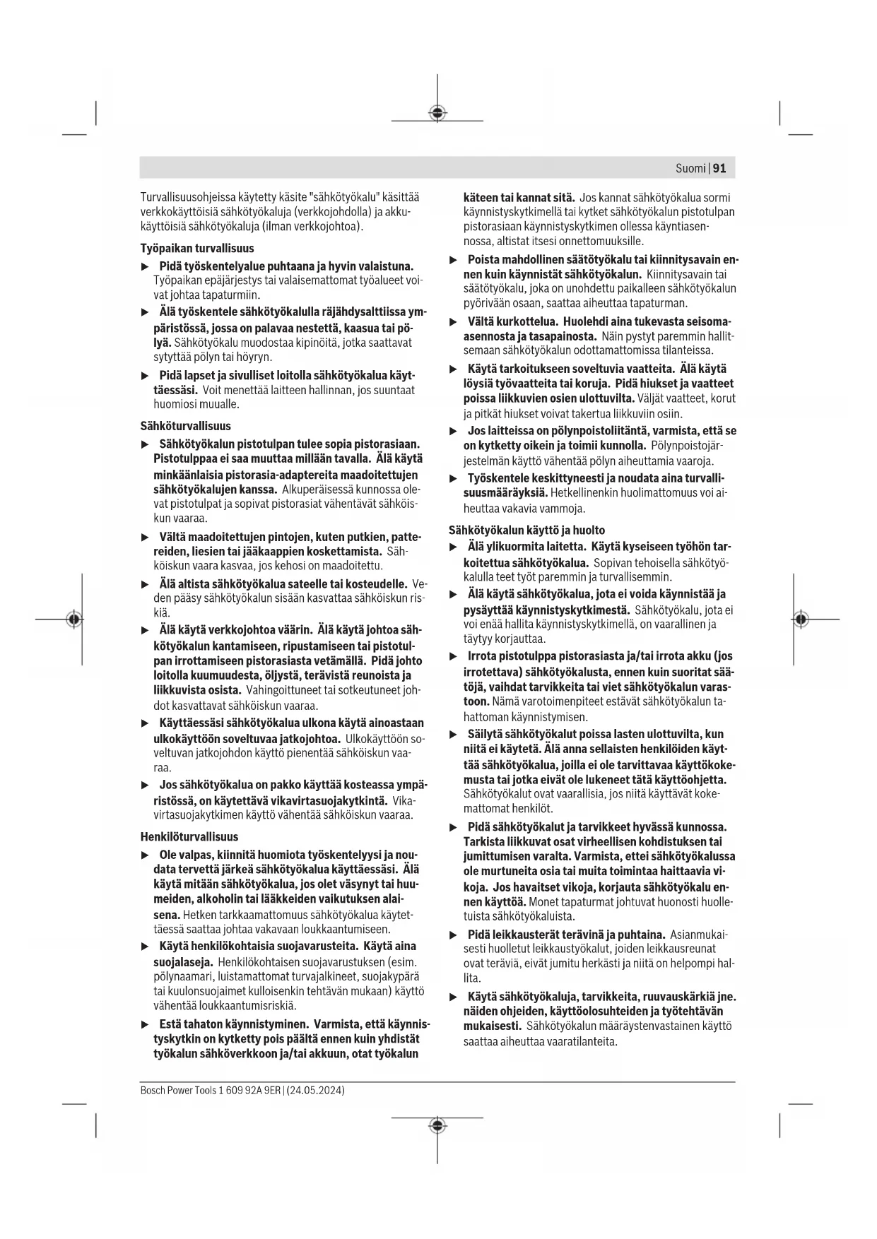 Dette avsugssystemet er ikke egnet for støv fra tre, metall og plast og helseskadelig støv (foreksempel asbest). Bruk Igangsetting Stille inn driftsmodus Med slag-/dreiestoppbryteren (13) velger du driftsmodus for elektroverktøyet. – For å skifte driftsmodus trykker du på utløserknappen (12) og dreier slag-/dreiestoppbryteren (13) til ønsket stilling, til det høres at den låses. Merknad: Du må bare endre driftsmåte når elektroverktøyet er slått av! Elektroverktøyet kan ellers ta skade. Stilling for hammerboring i betong eller stein Stilling for boring uten slag i tre, metall, keramikk og plast, og for skruing 1 609 92A 9ER | (24.05.2024) Bosch Power ToolsNorsk | 89 Stillingen Vario-Lock for justering av meiselposisjonen I denne stillingen låses ikke slag-/ dreistoppbryteren(13). Stilling for meisling Innstilling av rotasjonsretningen Med dreieretningsvelgeren (8) kan du endre dreieretningen til elektroverktøyet. Dette er ikke mulig når av/på-bryteren (10) er trykt inn. u Du må bare aktivere høyre/venstre-bryteren(8) når elektroverktøyet er stanset. Still alltid verktøyet inn på høyregang ved hammerboring, boring og meisling. Høyregang: For å bore og skru inn skruer trykker du dreieretningsvelgeren(8) mot venstre til den stopper. Venstregang: For å løsne eller skru ut skruer og muttere trykker du dreieretningsvelgeren(8) mot høyre til den stopper. Merknad: Hvis dreieretningsvelgeren står i midtstillingen, er av/på-bryteren blokkert. Inn-/utkobling – For å slå på elektroverktøyet trykker du på av/på- bryteren (10). Arbeidslyset (14) lyser når av/på-bryteren (10) trykkes helt eller delvis inn og gir mulighet til belysning av arbeidsplassen ved ugunstige lysforhold. Første gang elektroverktøyet slås på, kan det starte forsinket, ettersom elektronikken må konfigureres først. Ved lave temperaturer tar det en viss tid før elektroverktøyet oppnår full hammer-/slagytelse. – For å slå av elektroverktøyet slipper du av/på-bryteren (10). Stille inn turtallet/slagtallet Du kan regulere turtallet/slagtallet til det innkoblede elektroverktøyet trinnløst, avhengig av hvor langt inn du trykker av/på-bryteren (10). Et lett trykk på av/på-bryteren (10) gir lavt turtall/slagtall. Turtallet/slagtallet stiger med økende trykk. Endre meiselstillingen (Vario-Lock) Du kan låse meiselen i 36 stillinger. Dette gir mulighet til optimal arbeidsstilling. – Sett meiselen i verktøyholderen. – Drei slag-/dreiestoppbryteren (13) til stillingen "Vario- Lock". – Drei innsatsverktøyet til ønsket meiselstilling. – Drei slag-/dreiestoppbryteren (13) til stillingen "Meisling". Dermed låses verktøyfestet. – Still inn høyregang for meisling. Informasjon om bruk Stille inn boredybden (se bilde H) Med dybdestopperen (17) kan boredybden X bestemmes. – Trykk på knappen for innstilling av dybdestopperen (15), og sett dybdestopperen i ekstrahåndtaket (16). Rillene på dybdestopperen (17) må vende ned. – Skyv SDSplus-innsatsverktøyet inn i SDS plus- verktøyholderen(2) til det stopper. Hvis du ikke gjør dette, kan bevegeligheten til SDSplus-verktøyet føre til feil innstilling av boredybden. – Trekk dybdestoppen ut til avstanden mellom spissen på boret og spissen på dybdestoppen tilsvarer den ønskede boredybden X. Overbelastningskobling u Hvis innsatsverktøyet sitter i klem eller låser seg, avbrytes driften av borspindelen. Hold alltid elektroverktøyet godt fast med begge hender og stå støtt, dette på grunn av kreftene som opptrer. u Slå straks av elektroverktøyet og løsne innsatsverktøyet hvis elektroverktøyet blokkeres. Ved innkobling med blokkert boreverktøy oppstår det høye reaksjonsmomenter. Hurtigutkobling (KickBack Control) Hurtigutkoblingen (KickBack Control) gir bedre kontroll over elektroverktøyet og gir dermed økt beskyttelse for brukeren sammenlignet med elektroverktøy uten KickBack Control. Hvis elektroverktøyet plutselig og uforutsett roterer rundt borakselen, kobles elektroverktøyet ut. – For å slå på igjen slipper du av/på-bryteren (10) og aktiverer den på nytt. Hurtigutkoblingen signaliseres ved at arbeidslyset (14) på elektroverktøyet blinker. Vibrasjonsdemping Den integrerte vibrasjonsdempingen reduserer vibrasjonen som oppstår. u Ikke fortsett å bruke elektroverktøyet hvis dempingselementet er skadet. Sette inn skrutrekkerbits (se bilde I) u Sett elektroverktøyet bare mot mutteren/skruen når det er slått av. Innsatsverktøy som dreier seg kan skli. For å bruke skrutrekkerbits trenger du en universalholder (22) med SDSplus-festeskaft. – Rengjør innstikksenden på festeskaftet, og smør den med litt fett. – Sett universalholderen i verktøyfestet mens du dreier, helt til den låses automatisk. – Kontroller at universalholderen er låst ved å trekke i den. – Sett en skrutrekkerbit i universalholderen. Bruk bare skrutrekkerbits som passer til skruehodet. – For å ta ut universalholderen skyver du låsehylsen (4) bakover og tar universalholderne (22) ut av verktøyfestet. Bosch Power Tools 1 609 92A 9ER | (24.05.2024)90 | Suomi Feste fallsikring (se bildeJ) Merknad: En fallsikringsanordning(24) som er egnet for vekten på systemet skal brukes som beskyttelse mot at elektroverktøyet faller ned. Den maksimalt tillatte lengden på fallsikringsanordningen er1,8 m. Bruk utelukkende det tillatte festeområdet(23) på elektroverktøyet. Som fallsikring bruker du fortrinnsvis en båndslynge festet med ankerstikk eller en fallsikring med falldemper. Det er svært viktig å følge bruksanvisningen for fallsikringen(24) når denne festes. u Det er obligatorisk å feste den motsatte siden av fallsikringen på en stabil konstruksjon (foreksempel bygning eller stillas), aldri på selve brukeren. Fallsikringen må være fritt bevegelig og må utelukkende være festet på det faste anslagspunktet(25) og i det tillatte festeområdet(23) på elektroverktøyet. Velg et fast anslagspunkt(25) som g