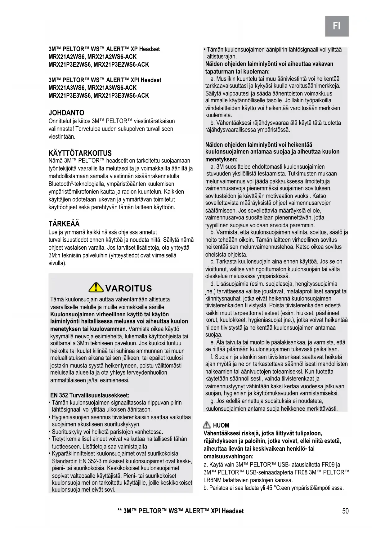 VAROITUS Tämä kuulonsuojain auttaa vähentämään altistusta vaaralliselle melulle ja muille voimakkaille äänille. Kuulonsuojaimen virheellinen käyttö tai käytön laiminlyönti haitallisessa melussa voi aiheuttaa kuulon menetyksen tai kuulovamman. Varmista oikea käyttö kysymällä neuvoja esimieheltä, lukemalla käyttöohjeista tai soittamalla 3M:n tekniseen paveluun. Jos kuulosi tuntuu heikolta tai kuulet kilinää tai suhinaa ammunnan tai muun melualtistuksen aikana tai sen jälkeen, tai epäilet kuulosi jostakin muusta syystä heikentyneen, poistu välittömästi meluisalta alueelta ja ota yhteys terveydenhuollon ammattilaiseen ja/tai esimieheesi.EN 352 Turvallisuuslausekkeet:• Tämän kuulonsuojaimen signaalitasosta riippuvan piirin lähtösignaali voi ylittää ulkoisen äänitason.• Hygieniasuojien asennus tiivisterenkaisiin saattaa vaikuttaa suojaimen akustiseen suorituskykyyn.• Suorituskyky voi heiketä paristojen vanhetessa. • Tietyt kemialliset aineet voivat vaikuttaa haitallisesti tähän tuotteeseen. Lisätietoja saa valmistajalta.• Kypäräkiinnitteiset kuulonsuojaimet ovat suurikokoisia. Standardin EN 352-3 mukaiset kuulonsuojaimet ovat keski-, pieni- tai suurikokoisia. Keskikokoiset kuulonsuojaimet sopivat valtaosalle käyttäjistä. Pieni- tai suurikokoiset kuulonsuojaimet on tarkoitettu käyttäjille, joille keskikokoiset kuulonsuojaimet eivät sovi.• Tämän kuulonsuojaimen äänipiirin lähtösignaali voi ylittää altistusrajan.Näiden ohjeiden laiminlyönti voi aiheuttaa vakavan tapaturman tai kuoleman:a. Musiikin kuuntelu tai muu ääniviestintä voi heikentää tarkkaavaisuuttasi ja kykyäsi kuulla varoitusäänimerkkejä. Säilytä valppautesi ja säädä äänentoiston voimakkuus alimmalle käytännölliselle tasolle. Joillakin työpaikoilla viihdelaitteiden käyttö voi heikentää varoitusäänimerkkien kuulemista.b. Vähentääksesi räjähdysvaaraa älä käytä tätä tuotetta räjähdysvaarallisessa ympäristössä.Näiden ohjeiden laiminlyönti voi heikentää kuulonsuojaimen antamaa suojaa ja aiheuttaa kuulon menetyksen:a. 3M suosittelee ehdottomasti kuulonsuojaimien istuvuuden yksilöllistä testaamista. Tutkimusten mukaan melunvaimennus voi jäädä pakkauksessa ilmoitettuja vaimennusarvoja pienemmäksi suojaimen sovituksen, sovitustaidon ja käyttäjän motivaation vuoksi. Katso sovellettavista määräyksistä ohjeet vaimennusarvojen säätämiseen. Jos sovellettavia määräyksiä ei ole, vaimennusarvoa suositellaan pienennettävän, jotta tyypillinen suojaus voidaan arvioida paremmin.b. Varmista, että kuulonsuojaimen valinta, sovitus, säätö ja hoito tehdään oikein. Tämän laitteen virheellinen sovitus heikentää sen melunvaimennustehoa. Katso oikea sovitus oheisista ohjeista.c. Tarkasta kuulonsuojain aina ennen käyttöä. Jos se on vioittunut, valitse vahingoittumaton kuulonsuojain tai vältä oleskelua meluisassa ympäristössä.d. Lisäsuojaimia (esim. suojalaseja, hengityssuojaimia jne.) tarvittaessa valitse joustavat, matalaproiliset sangat tai kiinnitysnauhat, jotka eivät heikennä kuulonsuojaimen tiivisterenkaiden tiivistystä. Poista tiivisterenkaiden edestä kaikki muut tarpeettomat esteet (esim. hiukset, päähineet, korut, kuulokkeet, hygieniasuojat jne.), jotka voivat heikentää niiden tiivistystä ja heikentää kuulonsuojaimen antamaa suojaa.e. Älä taivuta tai muotoile päälakisankaa, ja varmista, että se riittää pitämään kuulonsuojaimen tukevasti paikallaan.f. Suojain ja etenkin sen tiivisterenkaat saattavat heiketä ajan myötä ja ne on tarkastettava säännöllisesti mahdollisten halkeamien tai äänivuotojen toteamiseksi. Kun tuotetta käytetään säännöllisesti, vaihda tiivisterenkaat ja vaimennustyynyt vähintään kaksi kertaa vuodessa jatkuvan suojan, hygienian ja käyttömukavuuden varmistamiseksi.g. Jos edellä annettuja suosituksia ei noudateta, kuulonsuojaimien antama suoja heikkenee merkittävästi. HUOM Vähentääksesi riskejä, jotka liittyvät tulipaloon, räjähdykseen ja paloihin, jotka voivat, ellei niitä estetä, aiheuttaa lievän tai keskivaikean henkilö- tai omaisuusvahingon:a. Käytä vain 3M™ PELTOR™ USB-latauslaitetta FR09 ja 3M™ PELTOR™ USB-seinäadapteria FR08 3M™ PELTOR™ LR6NM ladattavien paristojen kanssa. b. Paristoa ei saa ladata yli 45 °C:een ympäristölämpötilassa.