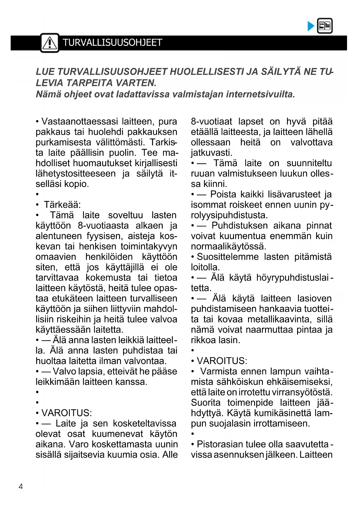 LEVIA TARPEITA VARTEN. Nämä ohjeet ovat ladattavissa valmistajan internetsivuilta.5 TURVALLISUUSOHJEET TURVALLISUUSOHJEET erottaminen virransyötöstä tulisi olla mahdollista joko irrottamal