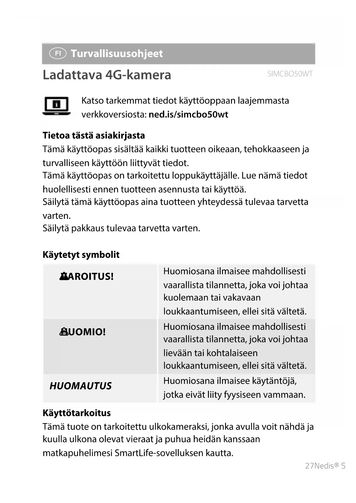 Turvallisuusohjeet Ladattava 4G-kamera SIMCBO50WT Katso tarkemmat tiedot käyttöoppaan laajemmasta verkkoversiosta: ned.is/simcbo50wt Tietoa tästä asiakirjasta Tämä käyttöopas sisältää kaikki tuotteen oikeaan, tehokkaaseen ja turvalliseen käyttöön liittyvät tiedot. Tämä käyttöopas on tarkoitettu loppukäyttäjälle. Lue nämä tiedot huolellisesti ennen tuotteen asennusta tai käyttöä. Säilytä tämä käyttöopas aina tuotteen yhteydessä tulevaa tarvetta varten. Säilytä pakkaus tulevaa tarvetta varten. Käytetyt symbolit VAROITUS! Huomiosana ilmaisee mahdollisesti vaarallista tilannetta, joka voi johtaa kuolemaan tai vakavaan loukkaantumiseen, ellei sitä vältetä. HUOMIO! Huomiosana ilmaisee mahdollisesti vaarallista tilannetta, joka voi johtaa lievään tai kohtalaiseen loukkaantumiseen, ellei sitä vältetä. HUOMAUTUS Huomiosana ilmaisee käytäntöjä, jotka eivät liity fyysiseen vammaan. Käyttötarkoitus Tämä tuote on tarkoitettu ulkokameraksi, jonka avulla voit nähdä ja kuulla ulkona olevat vieraat ja puhua heidän kanssaan matkapuhelimesi SmartLife-sovelluksen kautta.28 Käytä tuotetta vain tässä käyttöoppaassa kuvatun mukaisesti. Turvallisuusohjeet