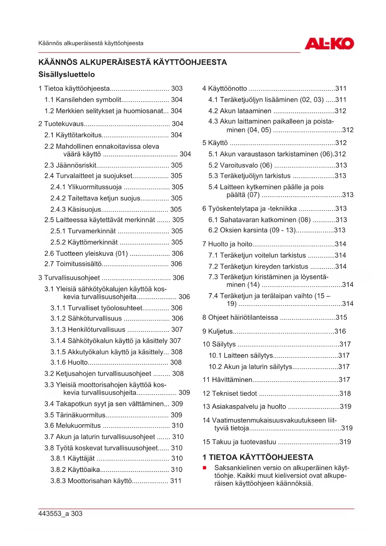 Nro Osa 1 Takakahva (kädensija on merkitty) 2 Lukituspainike 3 Virtakytkin 4 Etukahva 5 Ketjuöljysäiliön korkki 6 Ketjuöljysäiliön tarkastuslasi 7 Taitettava ketjusuojus 8 Ketjun kiristysruuvi 9 Ketjupyörän suojus 10 Ketjupyörän suojuksen kiinnitysrengas 11 Terälaippa 12 Teräketju 13 Rajoitin 14 Käsisuojus 15 Varaustason näyttö ja varoitusvalo 16 Painike teräketjun voiteluun 17 Kulmaruuvinväännin, ristipää 18 Akkukisko 19* Akku* 20* Laturi* 21 Kuljetuslaukku 22 Käyttöohje Akku (2,5 Ah) ja laturi sisältyvät pakkaukseen (tuotenumero 114023). Jos kyseessä on yksit- täislaite (tuotenumero 114016), akku ja laturi ei- vät sisälly toimitukseen. Katso tekniset tiedot si- vulla 6 ja 7 sekä kohta katso Luku 12 "Tekniset tiedot", sivu318.