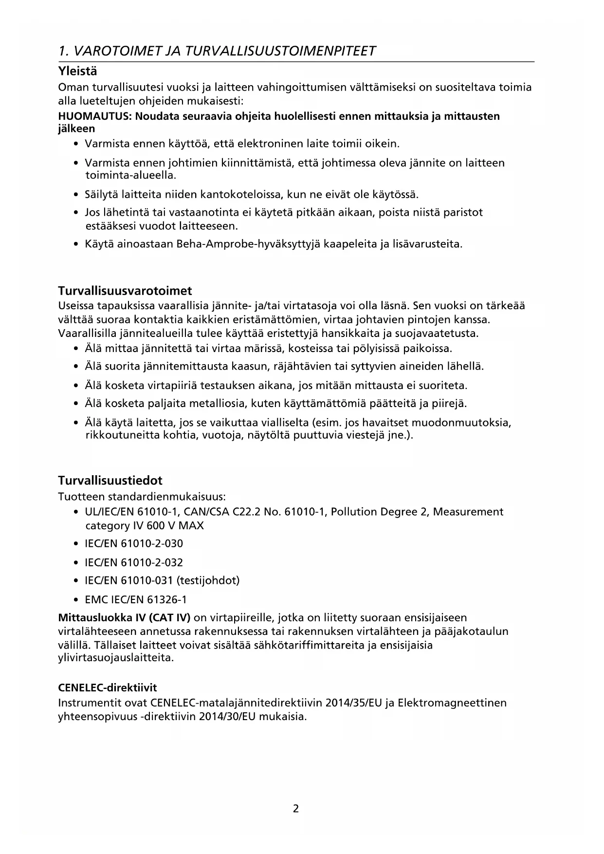 - EMC IEC/EN 61326-1 Mittausluokka IV (CAT IV) on virtapiireille, jotka on liitetty suoraan ensisijaiseen virtalähteeseen annetussa rakennuksessa tai rakennuksen virtalähteen ja pääjakotaulun välillä. Tällaiset laitteet voivat sisältää sähkötariffimittareita ja ensisijaisia ylivirtasuojauslaitteita. CENELEC-direktiivit Instrumentit ovat CENELEC-matalajännitedirektiivin 2014/35/EU ja Elektromagneettinen yhteensopivuus -direktiivin 2014/30/EU mukaisia.3 Varoitukset: Lue ennen käyttöä Sähköiskujen ja loukkaantumisten välttämiseksi: