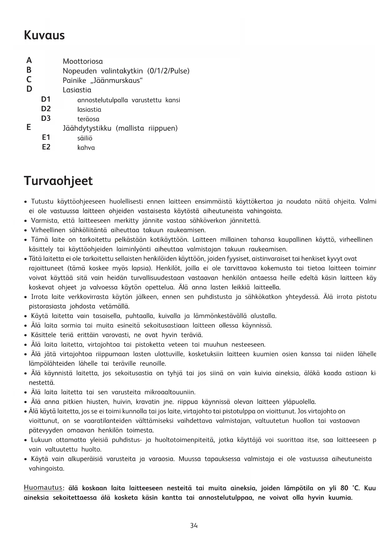 - Käytä vain alkuperäisiä varusteita ja varaosia. Muussa tapauksessa valmistaja ei ole vastuussa aiheutuneista vahingoista. Huomautus : älä koskaan laita laitteeseen nesteitä tai muita aineksia, joiden lämpötila on yli 80 °C. Kuumia aineksia sekoitettaessa älä kosketa käsin kantta tai annostelutulppaa, ne voivat olla hyvin kuumia.35 Ensimmäinen käyttökerta