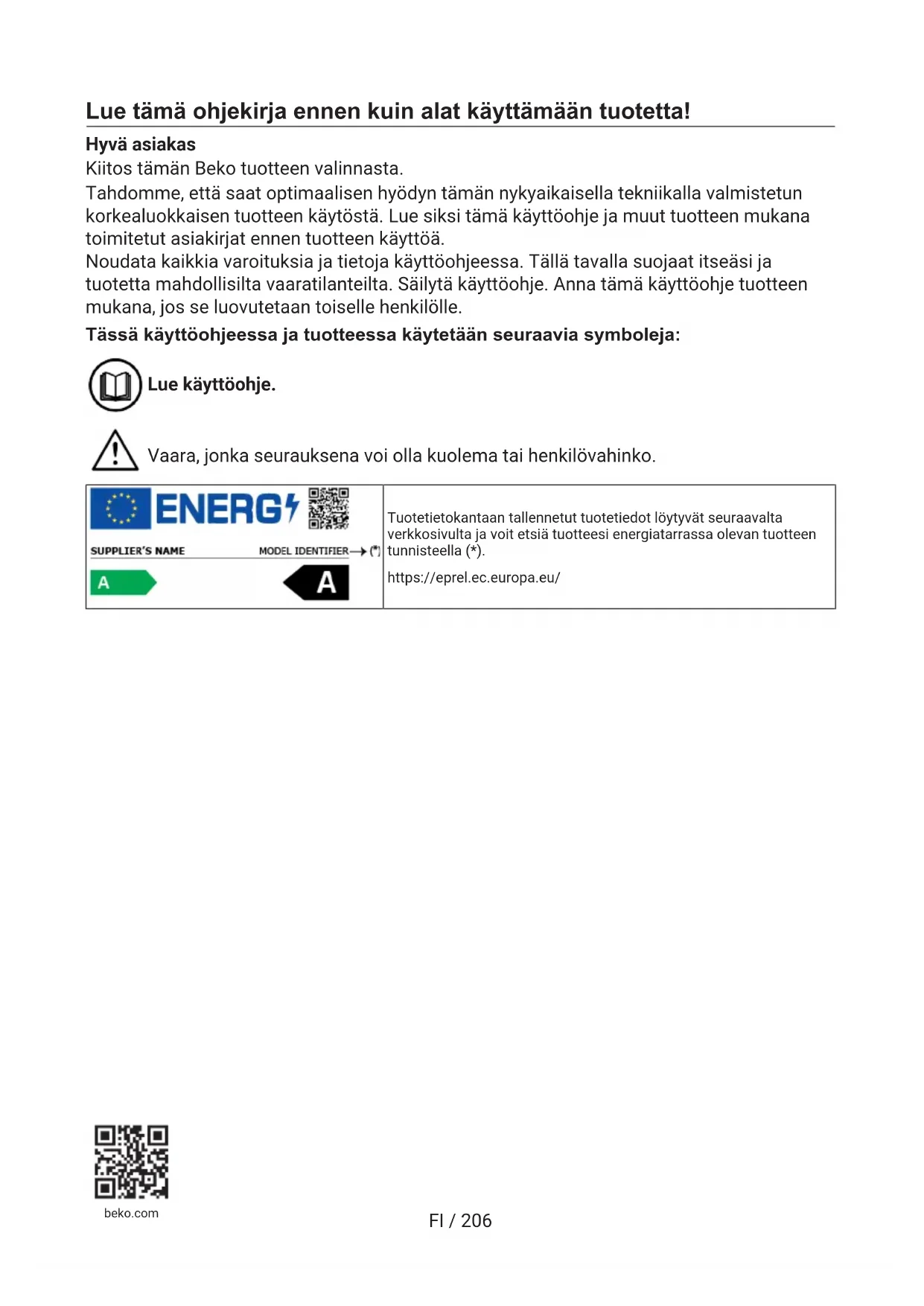 SVFI / 206 Lue tämä ohjekirja ennen kuin alat käyttämään tuotetta! Hyvä asiakas Kiitos tämän Beko tuotteen valinnasta. Tahdomme, että saat optimaalisen hyödyn tämän nykyaikaisella tekniikalla valmistetun korkealuokkaisen tuotteen käytöstä. Lue siksi tämä käyttöohje ja muut tuotteen mukana toimitetut asiakirjat ennen tuotteen käyttöä. Noudata kaikkia varoituksia ja tietoja käyttöohjeessa. Tällä tavalla suojaat itseäsi ja tuotetta mahdollisilta vaaratilanteilta. Säilytä käyttöohje. Anna tämä käyttöohje tuotteen mukana, jos se luovutetaan toiselle henkilölle. Tässä käyttöohjeessa ja tuotteessa käytetään seuraavia symboleja: Lue käyttöohje. Vaara, jonka seurauksena voi olla kuolema tai henkilövahinko. Tuotetietokantaan tallennetut tuotetiedot löytyvät seuraavalta verkkosivulta ja voit etsiä tuotteesi energiatarrassa olevan tuotteen tunnisteella (*). https://eprel.ec.europa.eu/ beko.comFI / 207 Sisältö 1 Turvallisuusohjeet ......................... 208