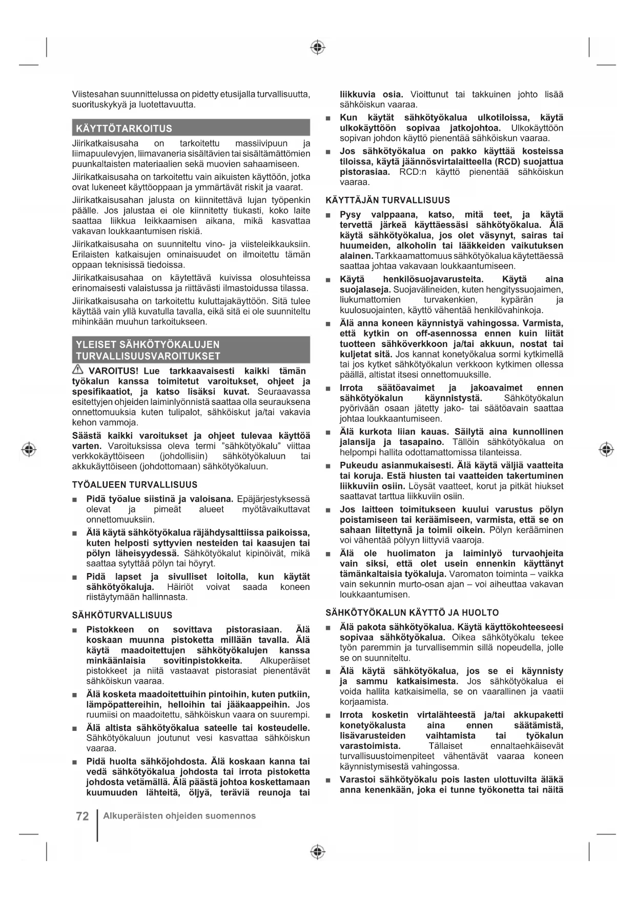 Alkuperäisten ohjeiden suomennosohjeita, käyttää sitä. Sähkötyökalut ovat vaarallisia kouluttamattomien käyttäjien käsissä. ■ Pidä konetyökalusi lisävarusteineen hyvässä kunnossa. Tarkista, onko liikkuvat osat kohdistettu väärin tai ovatko ne takertuneet ja onko rikkoutuneita osia tai muita olosuhteita, jotka voisivat vaikuttaa sähkötyökalun toimintaan. Jos laite on vioittunut, vie se huoltoon ennen sen käyttöä. Monet onnettomuudet johtuvat huonosti huolletuista sähkötyökaluista. ■ Pidä leikkuuterät terävinä ja puhtaina. Kun katkaisutyökalujen terät ovat terävät, ne eivät jumitu ja ohjaaminen on vaivatonta. ■ Käytä sähkötyökalua, tarvikkeita, osia jne. näiden ohjeiden mukaisesti ja ottaen huomioon työskentelyolosuhteet ja tehtävä työ. Sähkötyökalun käyttö muuhun kuin sille tarkoitettuun työhön voi aiheuttaa vaarallisia tilanteita. ■ Pidä kahvat ja tarttumispinnat kuivina, puhtaina ja öljystä ja rasvasta tahriintumattomina. Liukkaat kahvat ja tarttumispinnat vaarantavat laitteen turvallisen käsittelyn ja hallinnan yllättävissä tilanteissa.