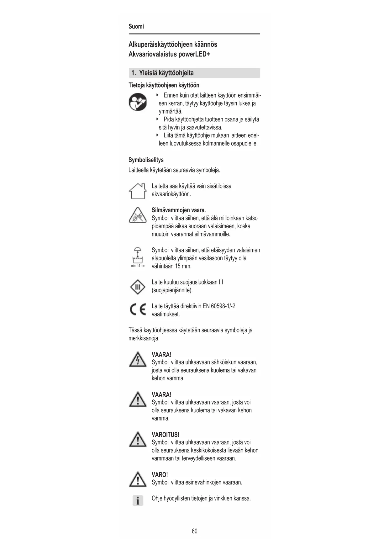 Tietoja käyttöohjeen käyttöön ▶ Ennen kuin otat laitteen käyttöön ensimmäi- sen kerran, täytyy käyttöohje täysin lukea ja ymmärtää. ▶ Pidä käyttöohjetta tuotteen osana ja säilytä sitä hyvin ja saavutettavissa. ▶ Liitä tämä käyttöohje mukaan laitteen edel- leen luovutuksessa kolmannelle osapuolelle. Symboliselitys Laitteella käytetään seuraavia symboleja. Laitetta saa käyttää vain sisätiloissa akvaariokäyttöön. Silmävammojen vaara. Symboli viittaa siihen, että älä milloinkaan katso pidempää aikaa suoraan valaisimeen, koska muutoin vaarannat silmävammoille. Symboli viittaa siihen, että etäisyyden valaisimen alapuolelta ylimpään vesitasoon täytyy olla vähintään 15 mm. Laite kuuluu suojausluokkaan III (suojapienjännite). Laite täyttää direktiivin EN 60598-1/-2 vaatimukset. Tässä käyttöohjeessa käytetään seuraavia symboleja ja merkkisanoja. VAARA! Symboli viittaa uhkaavaan sähköiskun vaaraan, josta voi olla seurauksena kuolema tai vakavan kehon vamma. VAARA! Symboli viittaa uhkaavaan vaaraan, josta voi olla seurauksena kuolema tai vakavan kehon vamma. VAROITUS! Symboli viittaa uhkaavaan vaaraan, josta voi olla seurauksena keskikokoisesta lievään kehon vammaan tai terveydelliseen vaaraan. VARO! Symboli viittaa esinevahinkojen vaaraan. Ohje hyödyllisten tietojen ja vinkkien kanssa. min. 15 mmSuomi