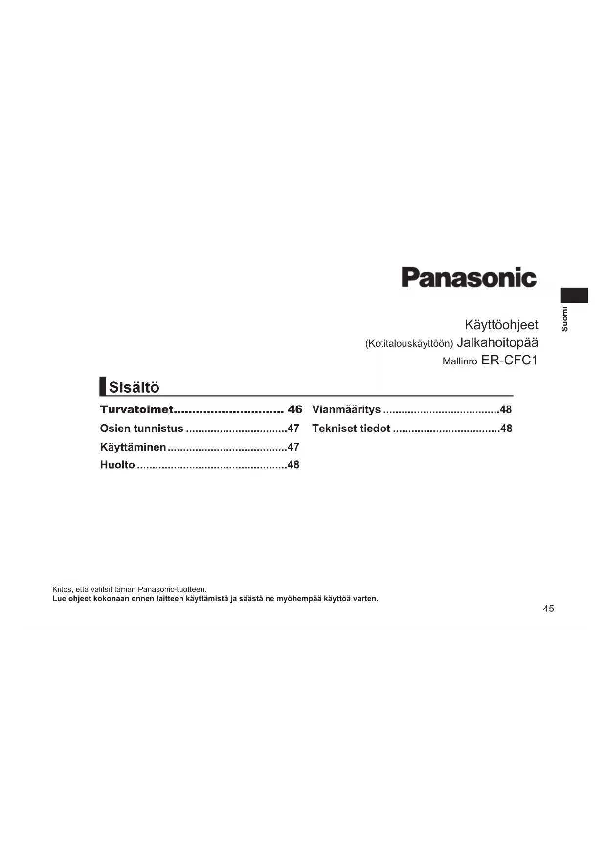 - Elinikä on noin 1 vuosi (olettaen yksittäinen käyttökerta 2 viikon välein n. 10 minuuttia käyttökertaa kohti). Vianmääritys Ongelma ToimenpideLaite ei toimi.Kiinnitä runko takaisin.Laite pysähtyy käytön aikana.Ihokosketus hellävaraisella voimalla.Ei voi hioa.Viila on kulunut loppuun. Ota yhteys valtuutettuun huoltokeskukseen ja osta se.Ei voida päästä irti hajusta.Liota hiontaosaa vedessä noin 24 h ennen pesua.Jos ongelmat eivät poistu, ota yhteyttä jälleenmyyjään tai Panasonicin valtuuttamaan huoltoliikkeeseen korjauksia varten. Tekniset tiedot Ilman kautta leviävä akustinen melu 65 (dB (A) re 1 pW) Tämä tuote on tarkoitettu vain kotitalouskäyttöön.49 Polski Instrukcja obsługi (Do użytku domowego) Głowica do pielęgnacji stóp Nr modelu ER‑CFC1 Dziękujemy za wybór produktu rmy Panasonic. Przed rozpoczęciem użytkowania tego urządzenia prosimy o przeczytanie całej instrukcji i zachowanie jej do wykorzystania w przyszłości. Środki ostrożności 50 Opis części .........................................51 Sposób użytkowania .........................51 Konserwacja ......................................52 Rozwiązywanie problemów ..............52 Dane techniczne ................................52 Spis treści50 Polski OSTRZEŻENIE