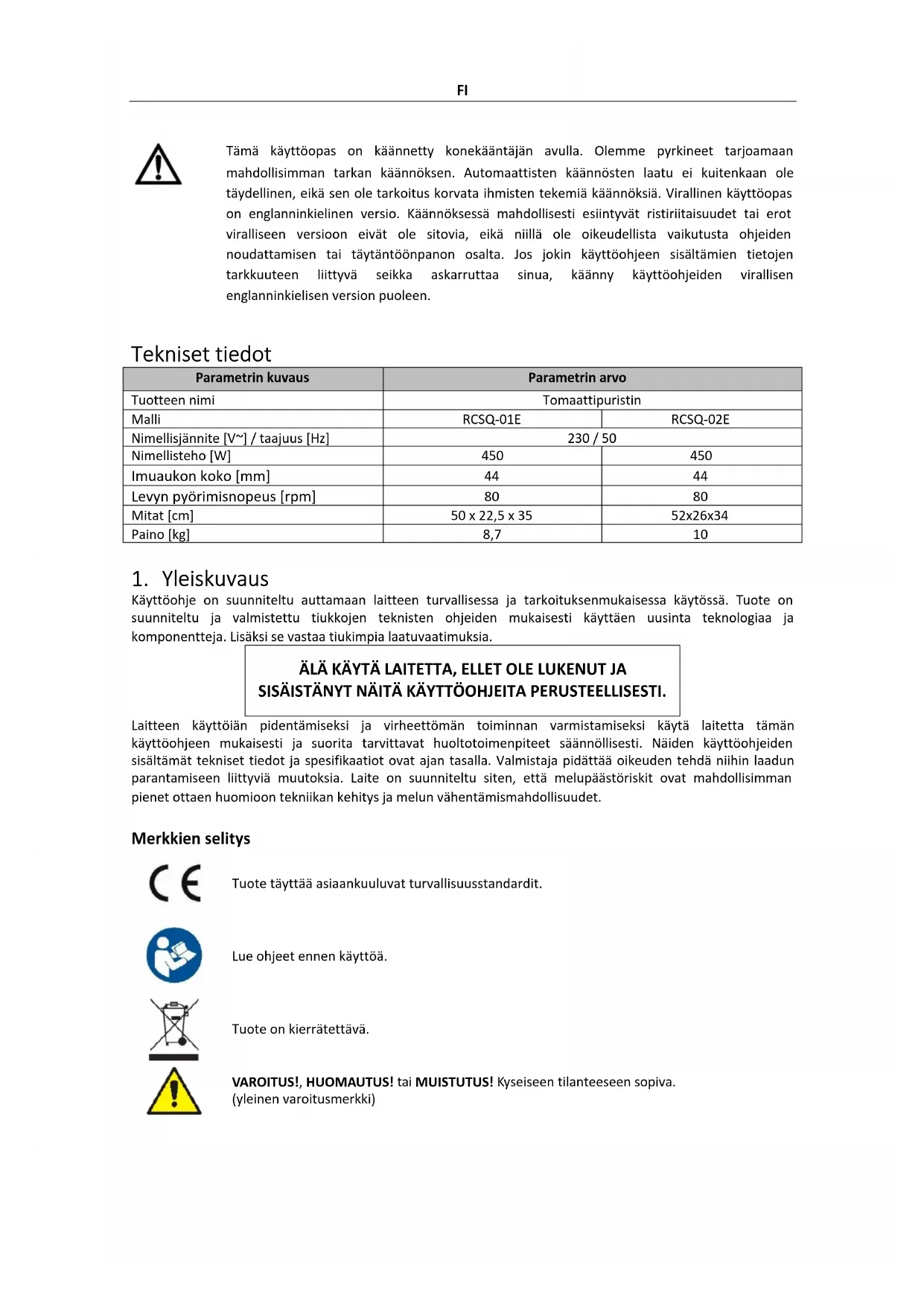 Gummifødder 4FI Tämä käyttöopas on käännetty konekääntäjän avulla. Olemme pyrkineet tarjoamaan mahdollisimman tarkan käännöksen. Automaattisten käännösten laatu ei kuitenkaan ole täydellinen, eikä sen ole tarkoitus korvata ihmisten tekemiä käännöksiä. Virallinen käyttöopas on englanninkielinen versio. Käännöksessä mahdollisesti esiintyvät ristiriitaisuudet tai erot viralliseen versioon eivät ole sitovia, eikä niillä ole oikeudellista vaikutusta ohjeiden noudattamisen tai täytäntöönpanon osalta. Jos jokin käyttöohjeen sisältämien tietojen tarkkuuteen liittyvä seikka askarruttaa sinua, käänny käyttöohjeiden virallisen englanninkielisen version puoleen. Tekniset tiedot Parametrin kuvaus Parametrin arvo Tuotteen nimi Tomaattipuristin Malli RCSQ-01E RCSQ-02E Nimellisjännite [V~] / taajuus [Hz] 230 / 50 Nimellisteho [W]