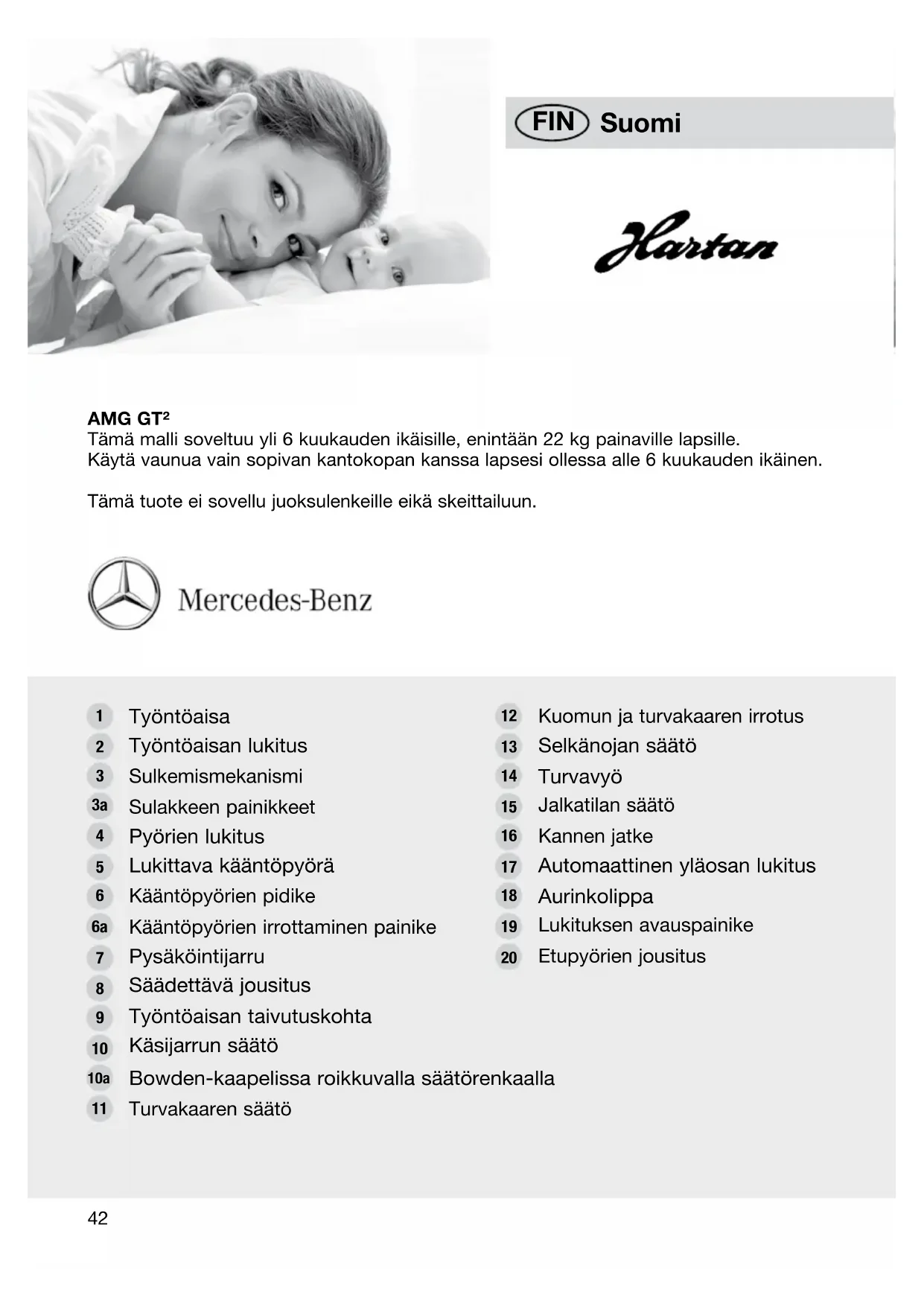 Tarkastus ja hoito-ohje Kaikki käyttämämme materiaalit ovat helppohoitoisia. Kankaisten osien hoito Puhdista likaantuneet kangasosat joko kuivana vaateharjalla tai puhtaalla vedellä (kuivaa hiustenkuivaajal- la), vältä voimakasta hankaamista. Voimakkaammin likaantuneet kohdat voidaan puhdistaa miedolla pesuaineella. Kaikki irrotettavat kangasosat voidaan pestä pesukoneessa hienopesuaineella 30°C:n lämpö- tilassa (hienopesu). Jos vaunut sattuvat kastumaan vesisateessa, kuivaa ne välittömästi pyyhkeellä kuivas- sa, ilmavassa paikassa kuomun ollessa ylöskäännettynä, niin että kosteus ei ehdi kulkeutua saumojen läpi kankaisiin sisäosiin ja jättää läikkiä. Varman suojan vesisateelta antaa vain toimitukseen sisältyvä tai alan liikkeestä saatava sateensuojakelmu. Käyttämillämme kankailla on lukuisia hyviä ominaisuuksia, mutta ne eivät siedä voimakasta auringonpaistetta. Suosittelemme siis pitämään vaunut varjoisessa paikassa. Alustan hoito Alustaa on hoidettava säännöllisesti. Puhdista pyöränakselit 4 viikon välein ja voitele ne kevyesti öljyllä. Liikkuvat muoviosat voidaan pitää toimintakykyisinä suihkuttamalla niihin silikonia. Päällystetyt ja kromatut metalliosat on pidettävä kuivina ja niitä on tarvittaessa käsiteltävä autonkiillotusaineella tai kromitahnalla. Pienet maalivauriot voidaan korjata maalikynällä, joita myydään alan liikkeissä. Älä käytä korkeapainelaitetta vaunujen puhdistukseen sillä se rikkoo pyörien rasvatut kuulalaakerit ja niiden toimintaosat (seuraus on hankava ja vinkuva sivuääni). Pyörät: Varmista, että ilmatäyttöisissä pyörissä on tarpeeksi ilmanpainetta; sen tulisi olla 1,5 ja enint. 2 barin välillä. Renkaiden tyhjeneminen Jos rengas on täysin tyhjentynyt, voit estää pyörän epätasaisen pyörimisen pumppaamalla rengas ensin vain puoliksi täyteen ja suoristamalla rengasta niin, että pyörä kulkee tasaisesti. Pumppaa rengas täyteen vasta sen jälkeen. Käyttöohje VAROITUS! Tarkasta ennen käyttöä, että istuinosa on varmasti kiinnitetty paikoilleen! Avaa lukitus painamalla varmistuspainiketta lukituksen vapautuspai- nikkeen oikealla puolella kääntökaukalon taustapuolella ja paina sitten lukituksen vapautuspainike kokonaan sisään rajoittimeen asti. Ota toisella kädellä kiinni suojakaaresta ja voit irrottaa istuinosan. Soveltuvuus lapselle Istuin on tarkoitettu lapsille alkaen 6 kuukauden iästä päättyen 22kg:n painoon. VAROITUS! Käytä tätä istuinyksikköä vain, jos lapsesi osaa istua itsenäisesti ja 6 kuukauden ikäisestä lähtien. Alle 6 kuukautta vanhoille ja korkeintaan 9 kg painaville lapsille, jotka eivät vielä osaa nousta itse istumaan tai pyörähtää kyljelleen tai tukea itseään käsillä ja polvilla, vain soveltuvan kantokassin kanssa.47 Takuu ja takuuehdot 2 VUODEN takuu Annamme tälle tuotteelle 2 vuoden takuun. Ota yhteys myyjään, jolta olet tuotteen ostanut, jos tahdot tehdä valituksen. Takuuaika alkaa myyjän luovuttaessa tuotteen. Säilytä tämä täytetty kortti, samoin kuin allekirjoittamasi luovutustodistus ja ostokuitti todisteena takuuajan päättymiseen asti, sillä ilman näiden todisteiden esittämistä ei valitusta voida käsitellä. TAKUU KATTAA: Takuu kattaa kaikki materiaali- ja valmistusvirheet, jotka ovat tuotteessa sen luovutushetkellä. TAKUU EI KATA... Takuu ei kata myydyssä tuotteessa sellaisia vikoja tai vahinkoja, joista emme ole vastuussa. Tällaisia ovat erityisesti n luonnolliset kulumisjäljet (kuluminen) ja ylirasituksesta aiheutuvat vahingot n jälki- ja seurausviat, seurauksena vahinkojen/virheiden huomiottajättämisestä, minkä johdosta on täytynyt tehdä vaikeampia korjauksia. n sopimattomasta tai epäasianmukaisesta käytöstä aiheutuvat vahingot (katso käyttöohjetta). n virheellisestä asennuksesta tai käyttöönotosta aiheutuvat vahingot. n kaupan kohteen huolimattomasta käsittelystä tai puutteellisesta huollosta aiheutuvat vahingot. n kaupan kohteen epäasianmukaisesta muuttamisesta aiheutuvat vahingot. KATTAAKO TAKUU VAHINGON VAI EI? Ruoste: Runko on ruostesuojattu, mikä antaa sille hyvän perussuojan. Puutteellisen huollon seurauksena voi ruostetta kuitenkin syntyä. Takuu ei kata tästä aiheutuvaa vahinkoa. Naarmut: Naarmut kuuluvat normaaliin kulumiseen. Takuu ei kata naarmuvahinkoja. Homeen muodostuminen: Jos kankaiset osat ovat kostuneet, niiden on annettava kuivua perusteellisesti homeen välttämiseksi (katso käyttöohjetta). Takuu ei kata homeesta aiheutuvia vahinkoja. Kankaiden haalistuminen: Takaamme, että kankaat vastaavat voimassaolevia normeja. Auringonpaiste, hiki, pesuaineet, han- kaus (erityisesti niissä kohdissa, joihin tartutaan käsin) tai liian usein tapahtuva pesu voivat kuitenkin haalistaa kankaita, mikä ei oikeuta valituksiin. Vähäisiä värieroja yksittäisten valmistuserien välillä ei valitettavasti voida välttää. Ne eivät kuulu takuuseen. Kankaiden nukkaantuminen: Takuu ei kata kankaiden nukkaantumista. Nukkaantuminen kuuluu kankaiden tavallisen hoidon piiriin ja nukka voidaan poistaa vaateharjalla tai nukanpoistokoneella samalla tavalla kuin villapuseroista. Saumojen/neppareiden/kankaan repeämiset: Tarkasta tuotetta ostaessasi huolellisesti, että kaikki kangasosat, saumat ja nepparit on ommeltu ja kiinnitetty oikein. Saumoja/viallisia neppareita koskevat valitukset on tehtävä tuotteen myyjälle viipymättä virheen toteamisen jälkeen. Pyörät: Lastenvaunujen pyöriä ei tasapainoteta ja ne voivat tästä syystä „kulkea hiukan kierossa“. Pyörien kuluminen on normaalia kulumista. Ilmatäyttöisten pyörien puhkeamiseen voi olla vain ulkoinen syy, kuten terävä esine tai että pyörissä on käytön aikana on ollut liian vähän ilmaa. Tämä ei oikeuta takuuvaatimuksiin.