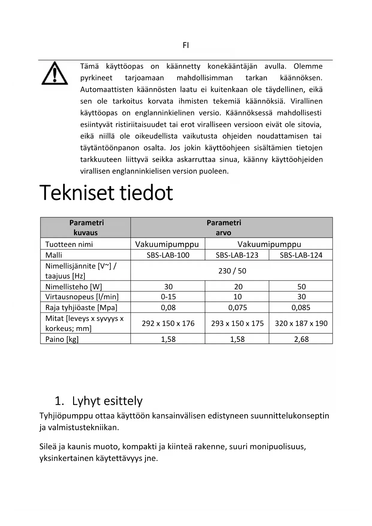 Tämä käyttöopas on käännetty konekääntäjän avulla. Olemme pyrkineet tarjoamaan mahdollisimman tarkan käännöksen. Automaattisten käännösten laatu ei kuitenkaan ole täydellinen, eikä sen ole tarkoitus korvata ihmisten tekemiä käännöksiä. Virallinen käyttöopas on englanninkielinen versio. Käännöksessä mahdollisesti esiintyvät ristiriitaisuudet tai erot viralliseen versioon eivät ole sitovia, eikä niillä ole oikeudellista vaikutusta ohjeiden noudattamisen tai täytäntöönpanon osalta. Jos jokin käyttöohjeen sisältämien tietojen tarkkuuteen liittyvä seikka askarruttaa sinua, käänny käyttöohjeiden virallisen englanninkielisen version puoleen. Tekniset tiedot Parametri kuvaus Parametri arvo Tuotteen nimi Vakuumipumppu Vakuumipumppu Malli SBS-LAB-100 SBS-LAB-123 SBS-LAB-124 Nimellisjännite [V~] / taajuus [Hz] 230 / 50 Nimellisteho [W]