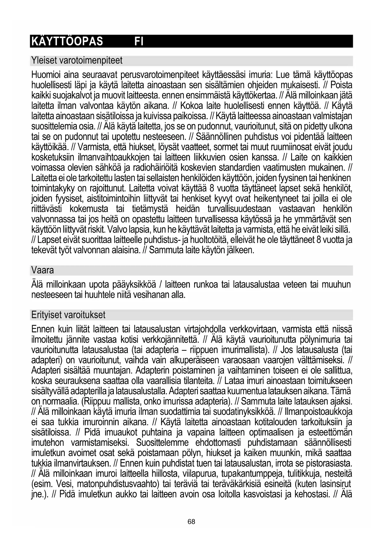 Yleiset varotoimenpiteet Huomioi aina seuraavat perusvarotoimenpiteet käyttäessäsi imuria: Lue tämä käyttöopas huolellisesti läpi ja käytä laitetta ainoastaan sen sisältämien ohjeiden mukaisesti. // Poista kaikki suojakalvot ja muovit laitteesta. ennen ensimmäistä käyttökertaa. // Älä milloinkaan jätä laitetta ilman valvontaa käytön aikana. // Kokoa laite huolellisesti ennen käyttöä. // Käytä laitetta ainoastaan sisätiloissa ja kuivissa paikoissa. // Käytä laitteessa ainoastaan valmistajan suosittelemia osia. // Älä käytä laitetta, jos se on pudonnut, vaurioitunut, sitä on pidetty ulkona tai se on pudonnut tai upotettu nesteeseen. // Säännöllinen puhdistus voi pidentää laitteen käyttöikää. // Varmista, että hiukset, löysät vaatteet, sormet tai muut ruumiinosat eivät joudu kosketuksiin ilmanvaihtoaukkojen tai laitteen liikkuvien osien kanssa. // Laite on kaikkien voimassa olevien sähköä ja radiohäiriöitä koskevien standardien vaatimusten mukainen. // Laitetta ei ole tarkoitettu lasten tai sellaisten henkilöiden käyttöön, joiden fyysinen tai henkinen toimintakyky on rajoittunut. Laitetta voivat käyttää 8 vuotta täyttäneet lapset sekä henkilöt, joiden fyysiset, aistitoimintoihin liittyvät tai henkiset kyvyt ovat heikentyneet tai joilla ei ole riittävästi kokemusta tai tietämystä heidän turvallisuudestaan vastaavan henkilön valvonnassa tai jos heitä on opastettu laitteen turvallisessa käytössä ja he ymmärtävät sen käyttöön liittyvät riskit. Valvo lapsia, kun he käyttävät laitetta ja varmista, että he eivät leiki sillä. // Lapset eivät suorittaa laitteelle puhdistus- ja huoltotöitä, elleivät he ole täyttäneet 8 vuotta ja tekevät työt valvonnan alaisina. // Sammuta laite käytön jälkeen. Vaara Älä milloinkaan upota pääyksikköä / laitteen runkoa tai latausalustaa veteen tai muuhun nesteeseen tai huuhtele niitä vesihanan alla. Erityiset varoitukset Ennen kuin liität laitteen tai latausalustan virtajohdolla verkkovirtaan, varmista että niissä ilmoitettu jännite vastaa kotisi verkkojännitettä. // Älä käytä vaurioitunutta pölynimuria tai vaurioitunutta latausalustaa (tai adapteria – riippuen imurimallista). // Jos latausalusta (tai adapteri) on vaurioitunut, vaihda vain alkuperäiseen varaosaan vaarojen välttämiseksi. // Adapteri sisältää muuntajan. Adapterin poistaminen ja vaihtaminen toiseen ei ole sallittua, koska seurauksena saattaa olla vaarallisia tilanteita. // Lataa imuri ainoastaan toimitukseen sisältyvällä adapterilla ja latausalustalla. Adapteri saattaa kuumentua latauksen aikana. Tämä on normaalia. (Riippuu mallista, onko imurissa adapteria). // Sammuta laite latauksen ajaksi. // Älä milloinkaan käytä imuria ilman suodattimia tai suodatinyksikköä. // Ilmanpoistoaukkoja ei saa tukkia imuroinnin aikana. // Käytä laitetta ainoastaan kotitalouden tarkoituksiin ja sisätiloissa. // Pidä imuaukot puhtaina ja vapaina laitteen optimaalisen ja esteettömän imutehon varmistamiseksi. Suosittelemme ehdottomasti puhdistamaan säännöllisesti imuletkun avoimet osat sekä poistamaan pölyn, hiukset ja kaiken muunkin, mikä saattaa tukkia ilmanvirtauksen. // Ennen kuin puhdistat tuen tai latausalustan, irrota se pistorasiasta. // Älä milloinkaan imuroi laitteella hiillosta, viilapurua, tupakantumppeja, tulitikkuja, nesteitä (esim. Vesi, matonpuhdistusvaahto) tai teräviä tai teräväkärkisiä esineitä (kuten lasinsirut jne.). // Pidä imuletkun aukko tai laitteen avoin osa loitolla kasvoistasi ja kehostasi. // Älä 68milloinkaan käytä laitetta rakennusmateriaalin (kuten hieno hiekka, kalkki, sementtijauhe, värijauhe jne.) imurointiin. Seurauksena voi olla laitteen vaurioituminen. Ongelmat ja niiden ratkaisu Ongelma Mahdollinen syy Ratkaisu Imuri ei toimi. Akku on tyhjä. Käsipölynimuria ei ole asennettu oikein. Lataa akku. Kokoa käsipölynimuri oikein. Imuteho on laskenut. Pölyastia on täynnä. tukkeutunut. Ilman tulovirtaus on tukkeutunut tai sähköharjan rulla jumiutunut. Poista pöly. Puhdista tai vaihda. Puhdista sähköinen harja. Käsipölynimuri ei lataa. Laturia ei ole liitetty pistorasiaan. Laturin liitintä ei ole liitetty rungon liitäntään. Käsipölynimuria ei ole asennettu runkoon. Liitä laturi pistorasiaan. Liitä laturi käsipölynimurin runkoon. Kiinnitä käsipölynimuri runkoon. Käyttö hyvin lyhyen ajan kuluessa latauksesta. Latausaika ei riittävän pitkä. Akku alkaa vanhentua. Lataa ohjeiden mukaisesti. Vaihda akku. Ympäristö Älä hävitä laitetta normaalin kotitalousjätteen mukana sen käyttöiän päätyttyä. Toimita laite kierrätykseen viralliseen keräyspisteeseen Tekemällä näin autat säästämään ympäristöä. Tämä tuote on merkitty Euroopan parlamentin ja neuvoston sähkö- ja laiteromusta antaman direktiivin 2012/19/EY (WEEE) mukaisesti. Ohje perustuu koko Euroopan käsittävään sähkö- ja laiteromun palautusta ja kierrätystä koskevaan sopimukseen. Takuu ja huolto Jos tarvitset tietoja, tai jos sinulla on ongelma, ota yhteyttä Hisense maassasi sijaitsevaan asiakaspalvelukeskukseen (puhelinnumero on maailmanlaajuisessa takuulehtisessä). Jos maassasi ei ole asiakaspalvelukeskusta, käy paikallisen Hisense -kauppiaasi luona tai ota yhteyttä Hisense kotitalouslaitteiden huolto-osastoon. Huomaa: Pölynimurin akun takuu on 12 kuukautta. Vain yksityiseen käyttöön! 69Kuljetuksen helpottamiseksi jotkin laitteen osat on pakattu erikseen ja sijoitettu turvallisesti pääpakkausyksikköön. // Lue kokoamis- ja käyttöohjeet ennen ensimmäistä käyttökertaa ja noudata niitä. // Laite on tarkoitettu kuivaimurointiin kotiympäristössä. OSAT
